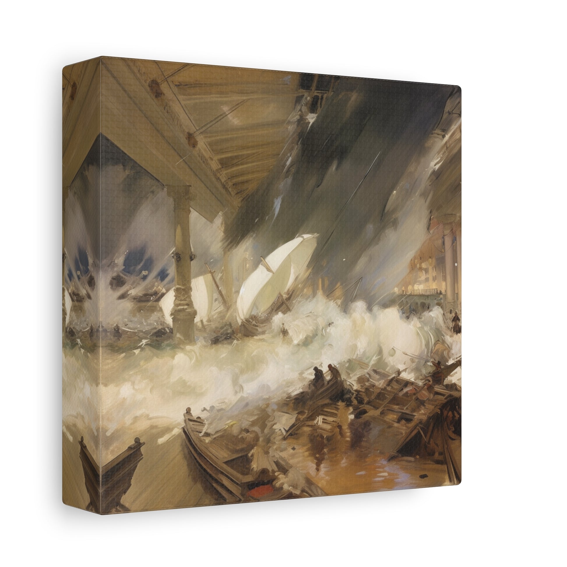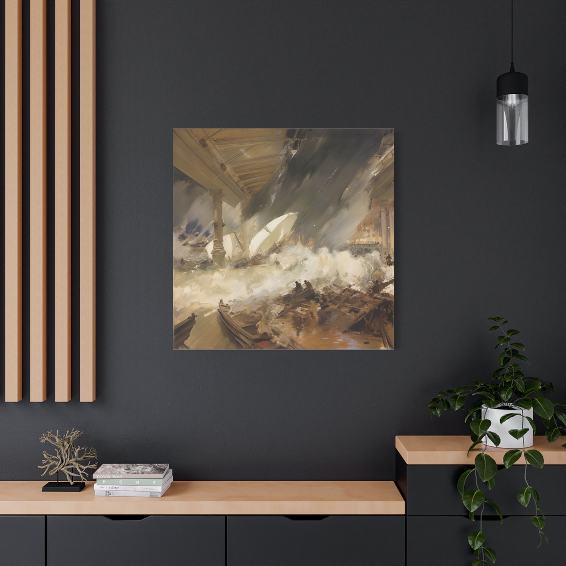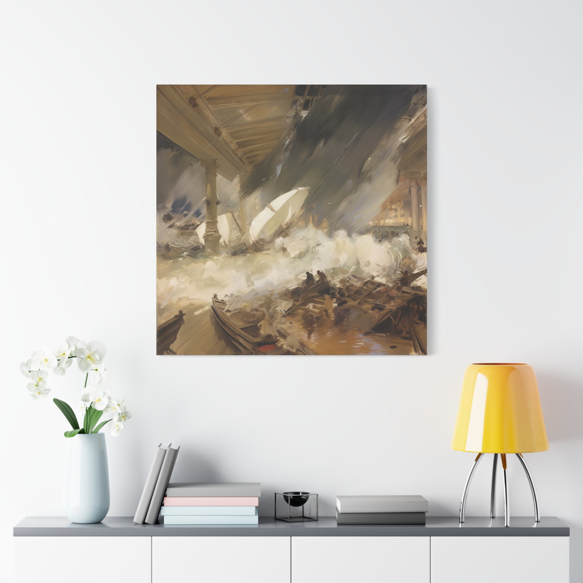 Amidst the swirling chaos of wind and wave, a fierce struggle unfolds beneath a celestial canopy. Boats grapple with nature’s fury, their sails straining against the storm's relentless dance, echoing the eternal clash of sea and sky.