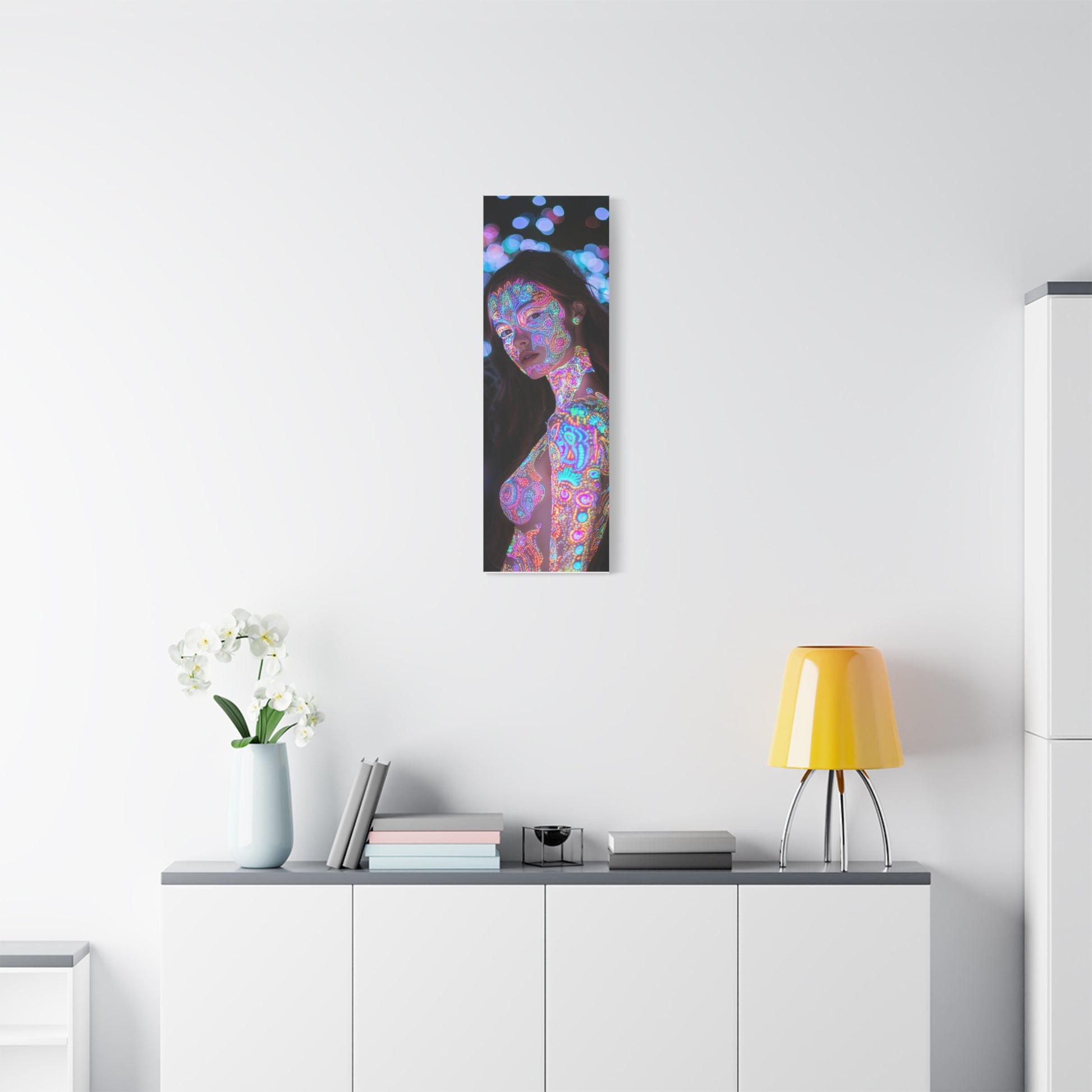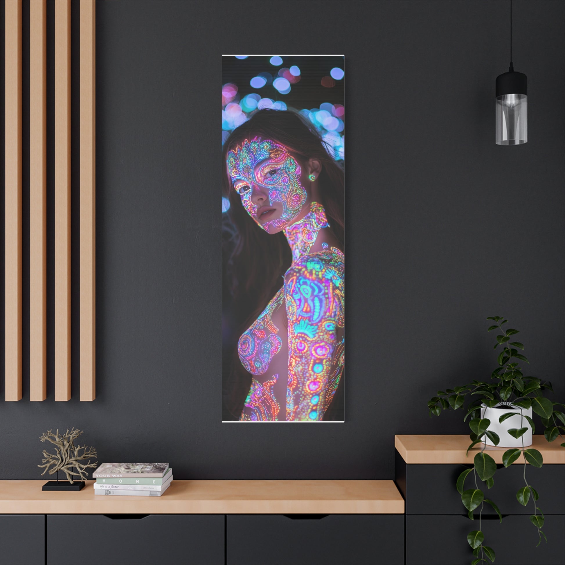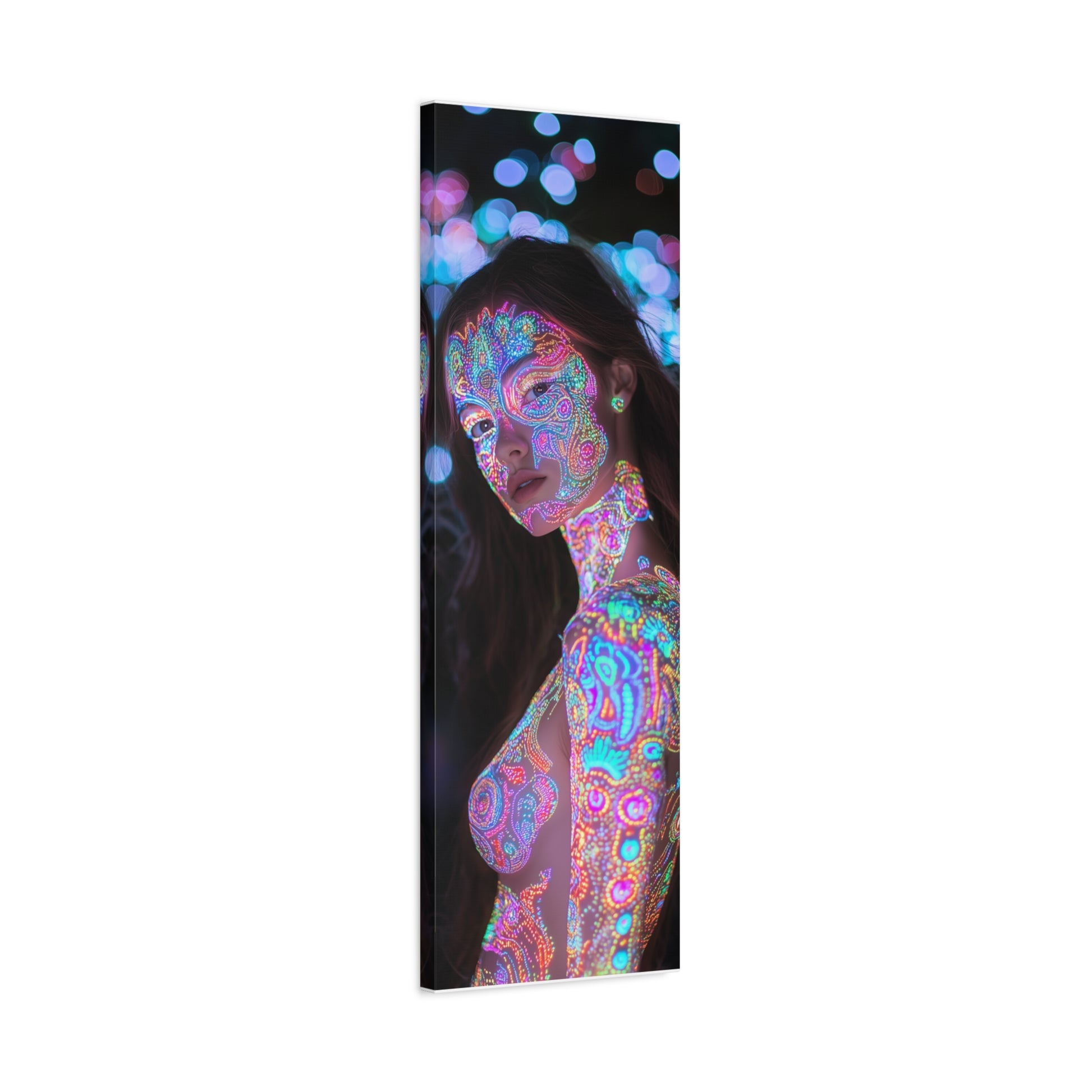 In a dance of light and shadow, the ethereal patterns whisper secrets of an unseen realm. Colors swirl across her skin, weaving tales of cosmic wonder and ancient mysteries, inviting the soul to wander.
