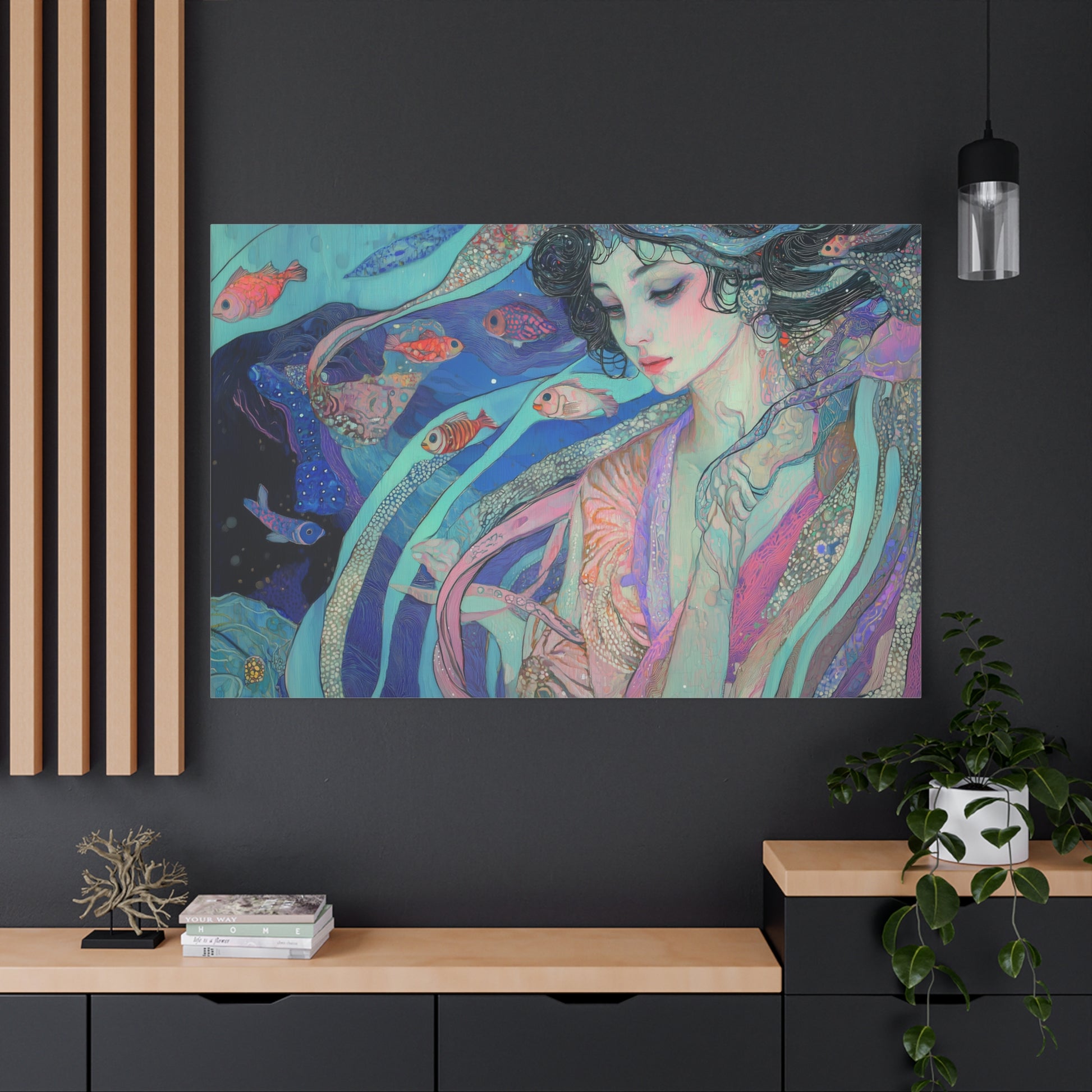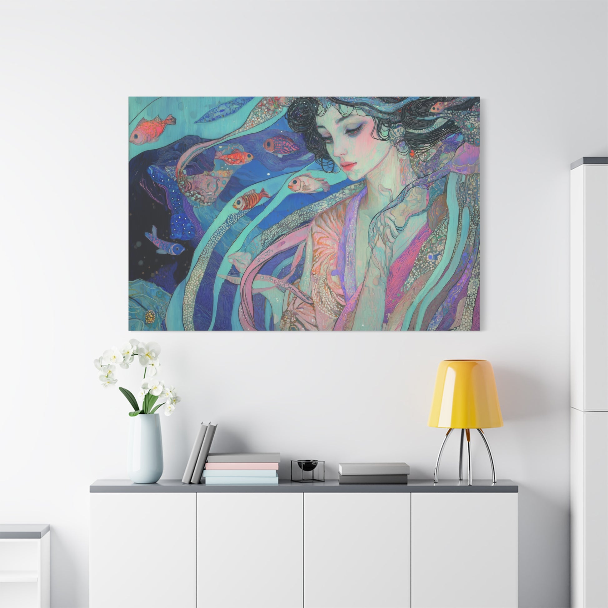 In a realm where dreams drift like ocean currents, a serene figure communes with vibrant marine life. The gentle hues and flowing forms evoke a sense of tranquility and timeless connection, inviting introspection and wonder.
