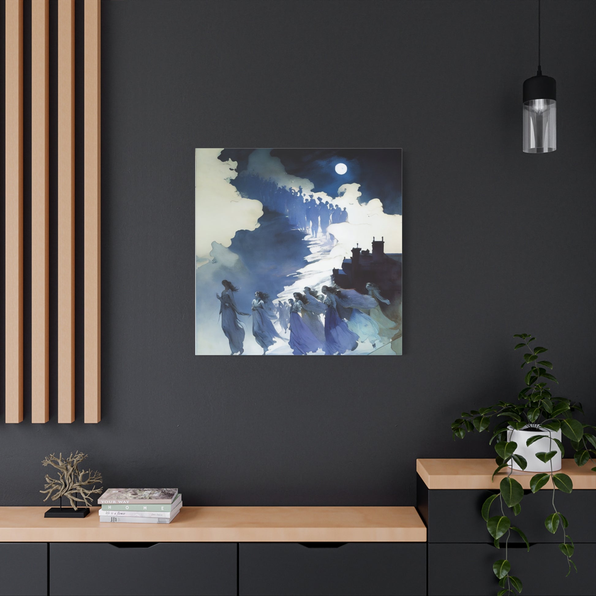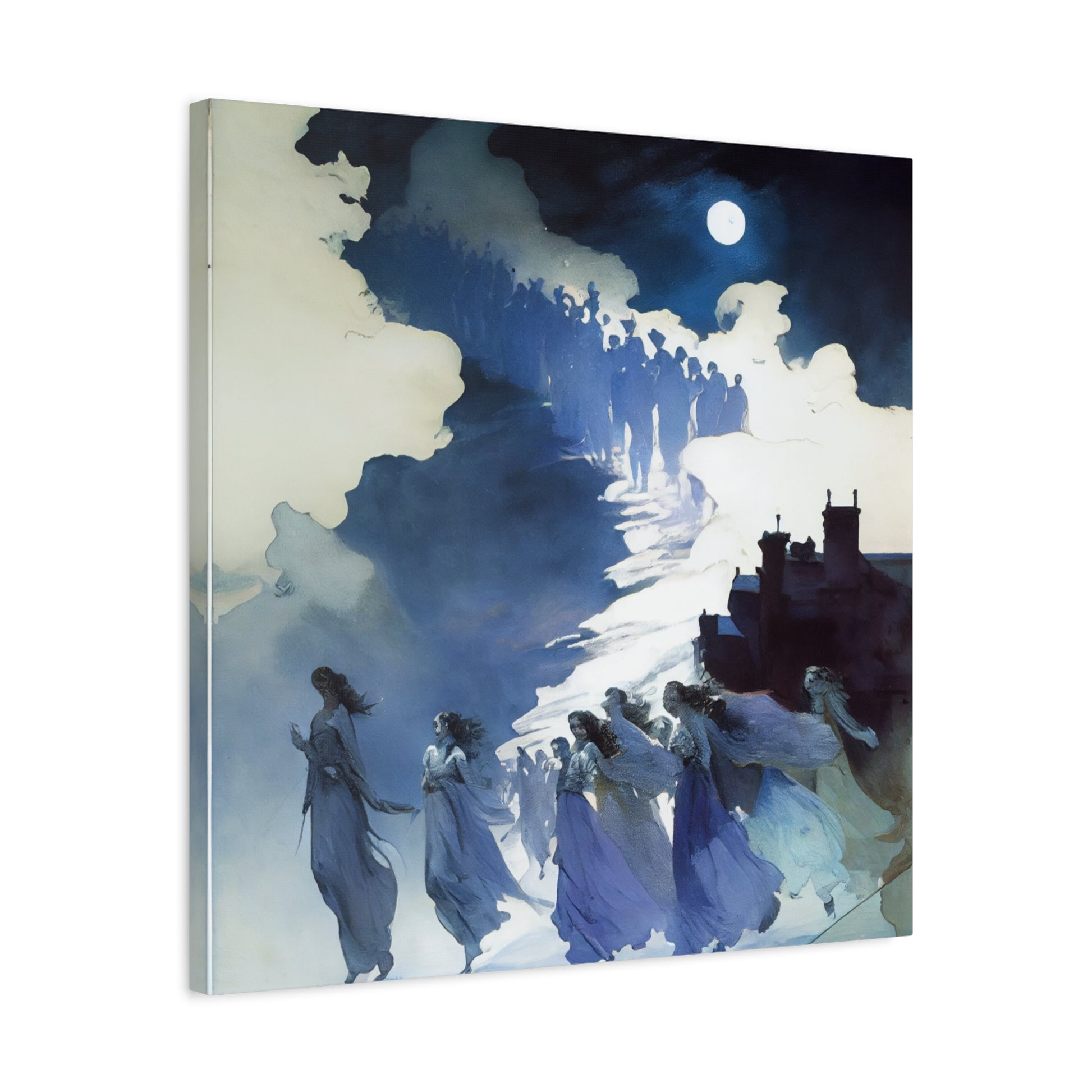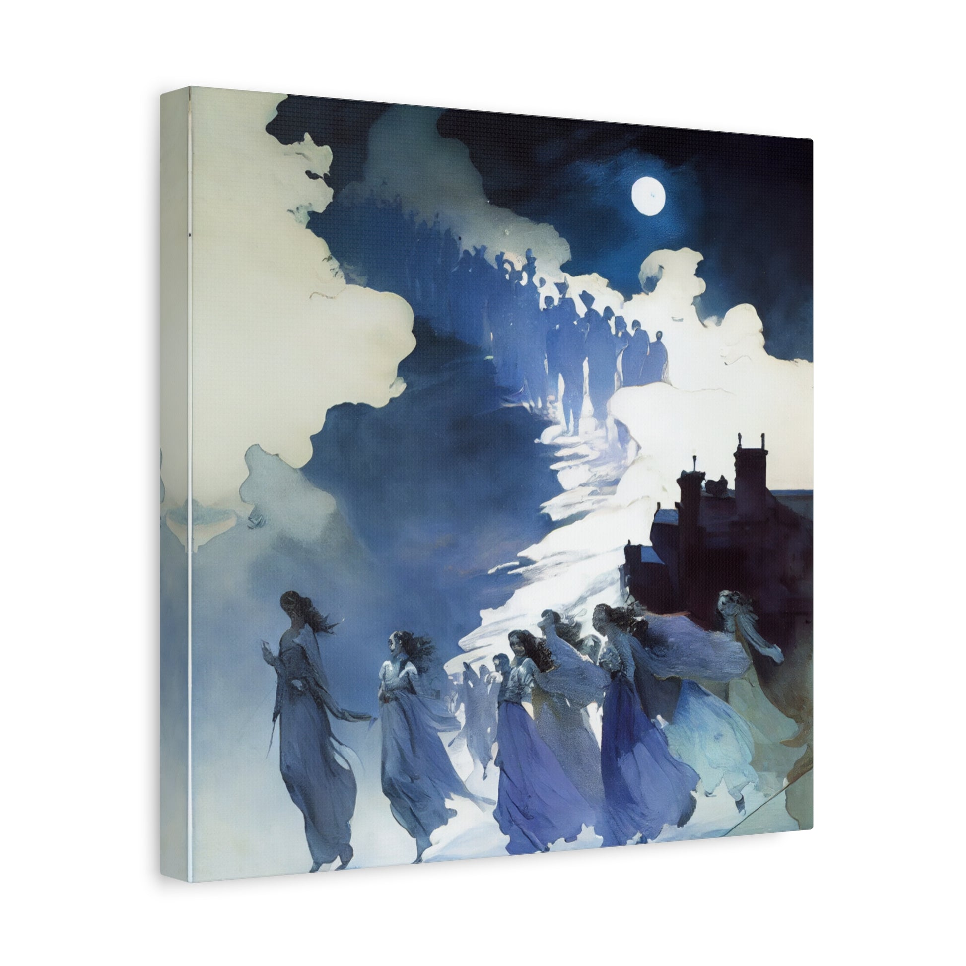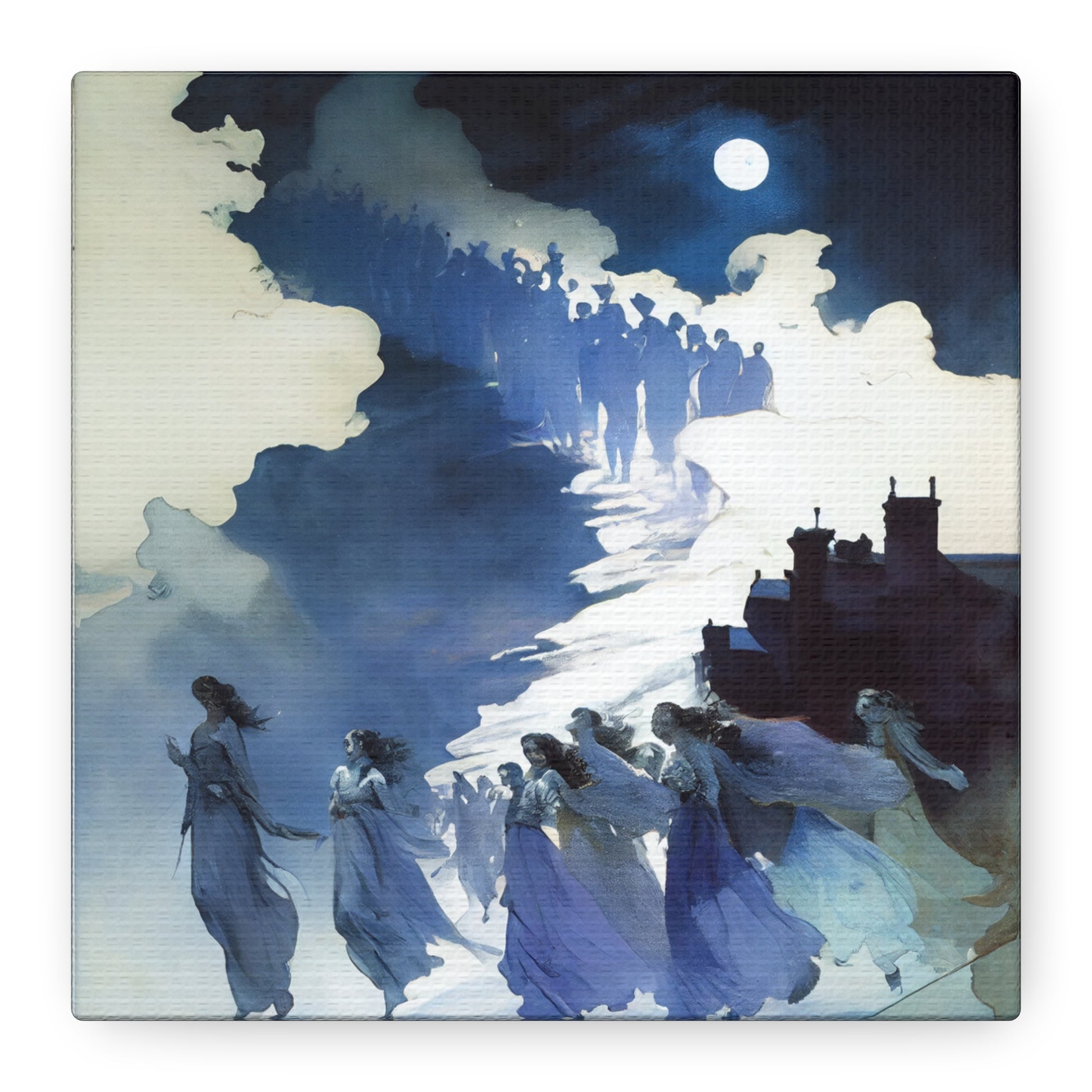 Beneath the watchful moon, ethereal figures drift through a dreamscape, whispering secrets of forgotten realms. Their graceful passage evokes a timeless dance between light and shadow, inviting the viewer to wander in wonder.