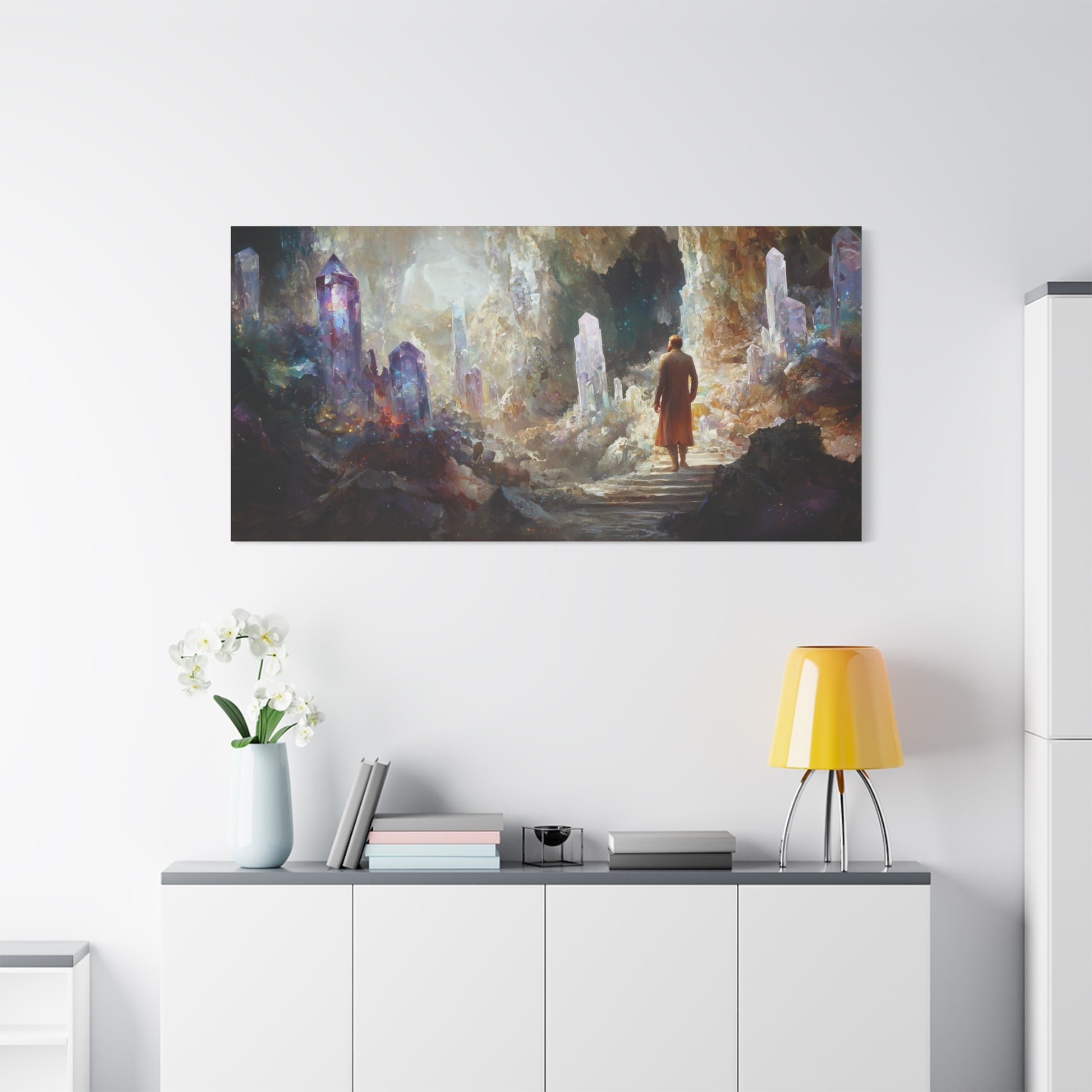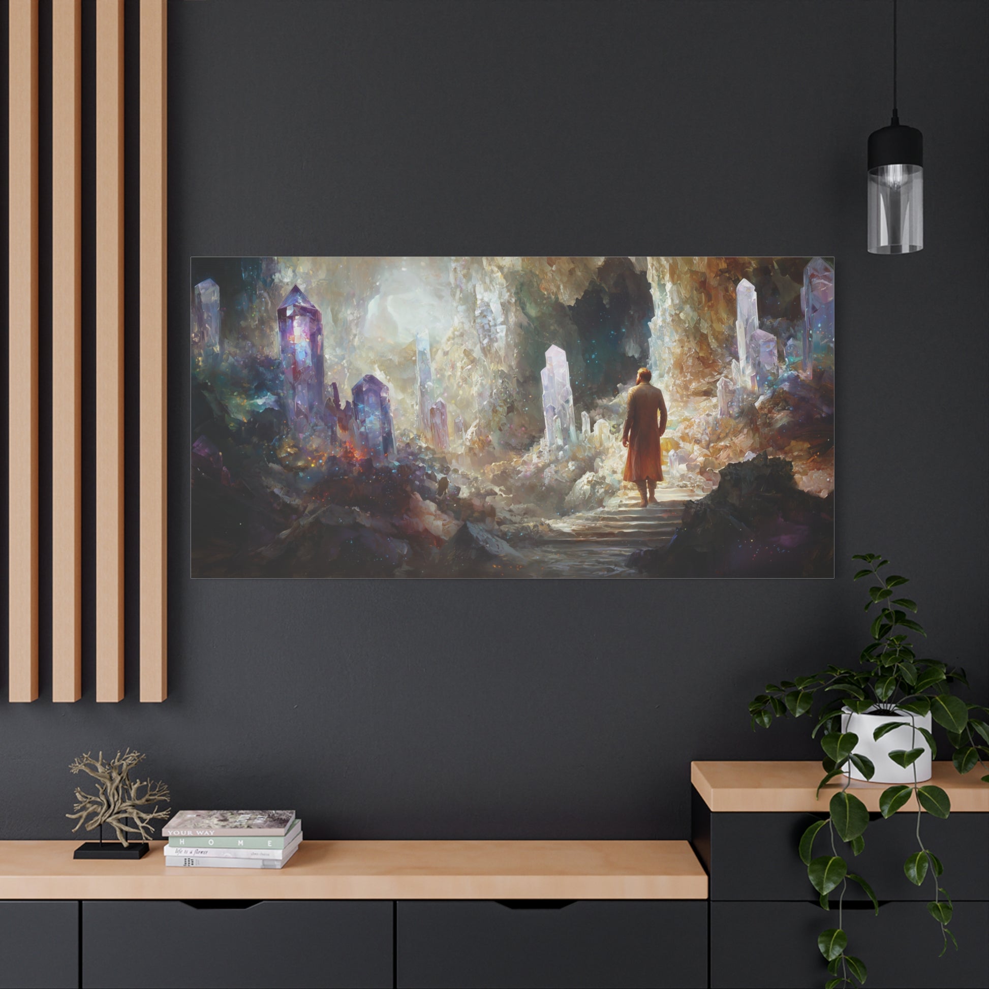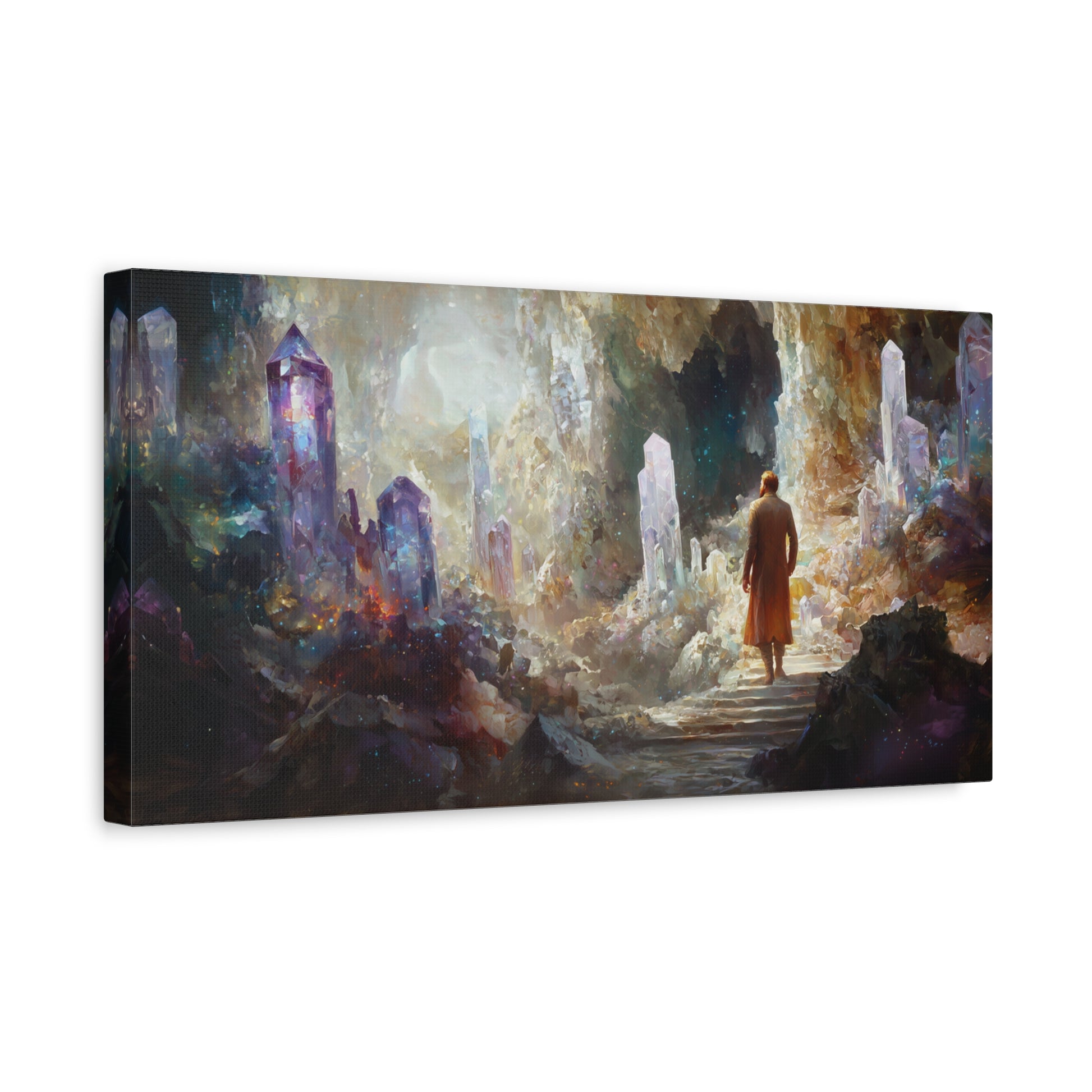 A solitary figure wanders amidst towering crystals, where shadows and light dance in a cosmic embrace. The air shimmers with mystery, inviting a journey into the unknown depths of the soul.