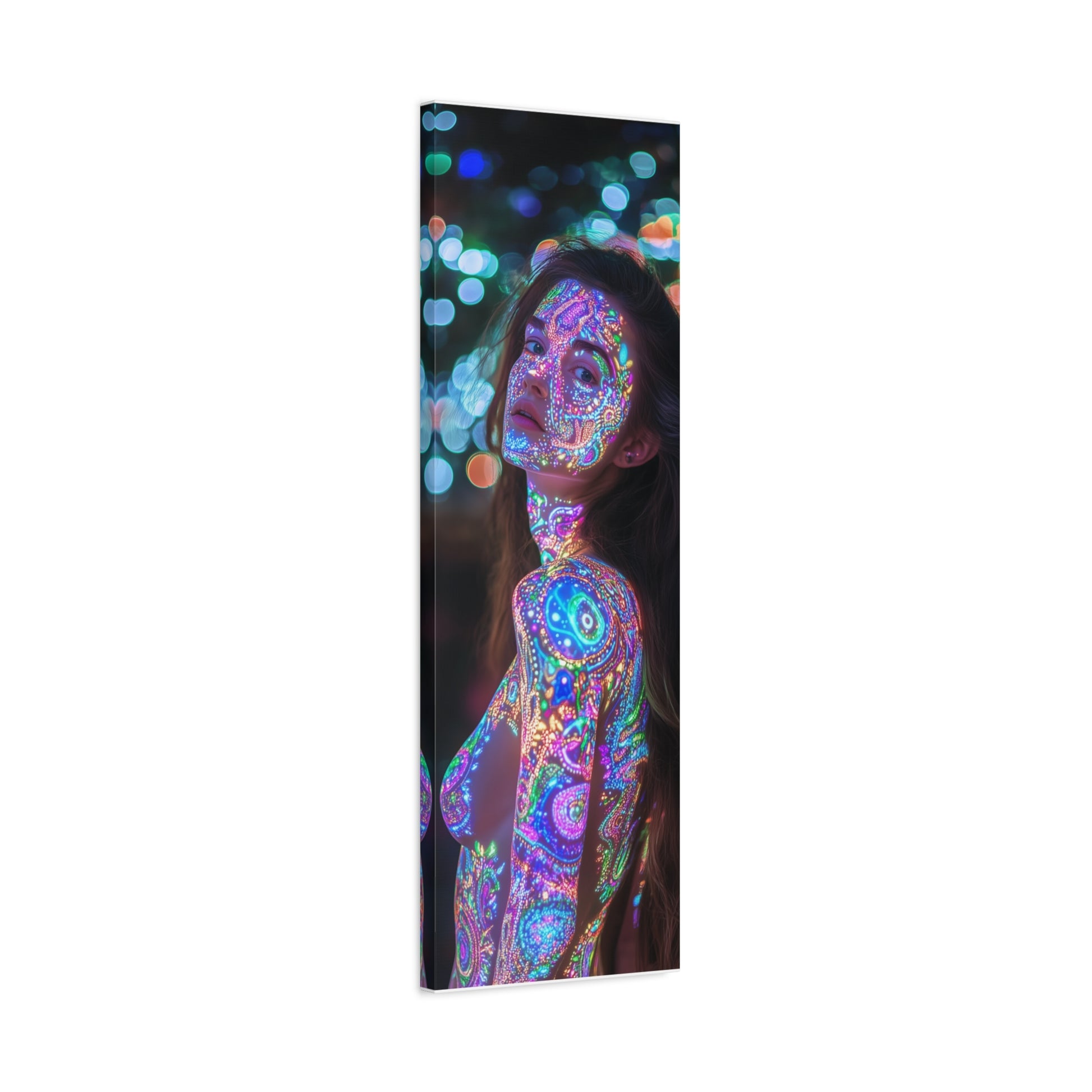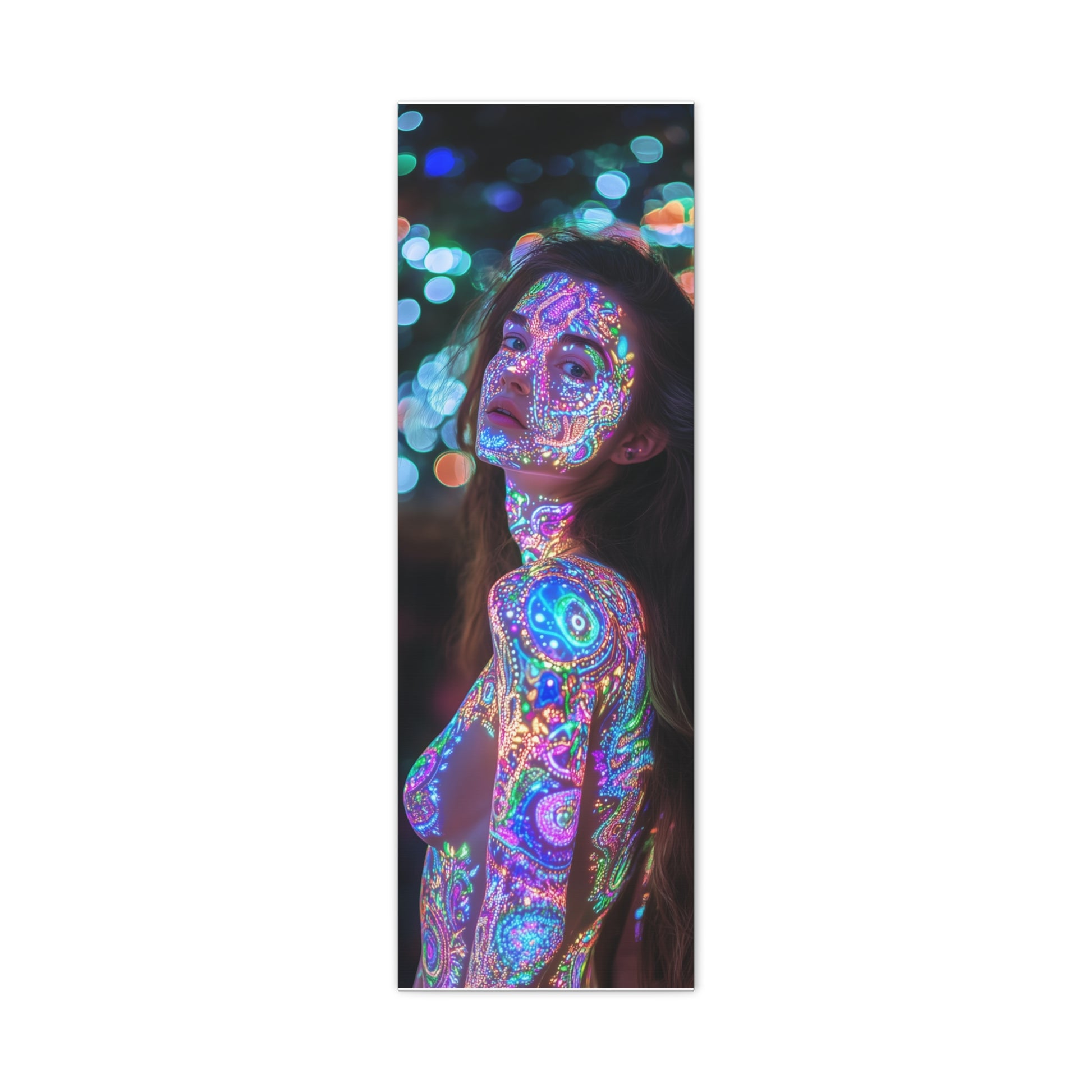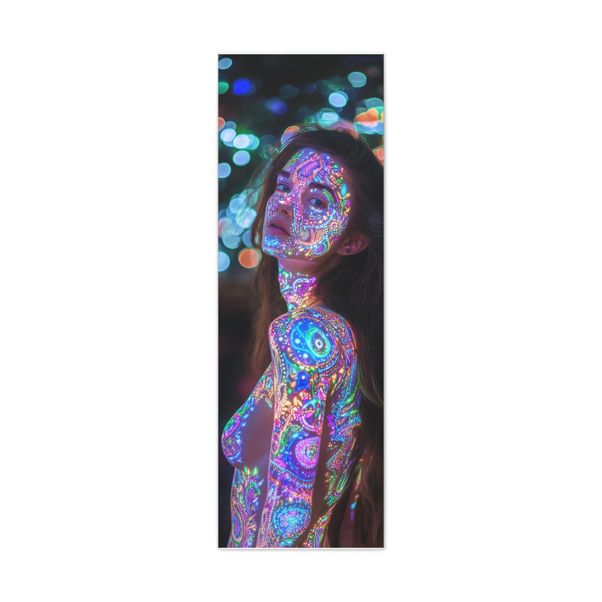 A celestial dance unfolds upon skin, where vibrant patterns shimmer like constellations in a dreamscape. Her gaze invites you into realms unknown, where light and shadow entwine, whispering secrets of the universe.