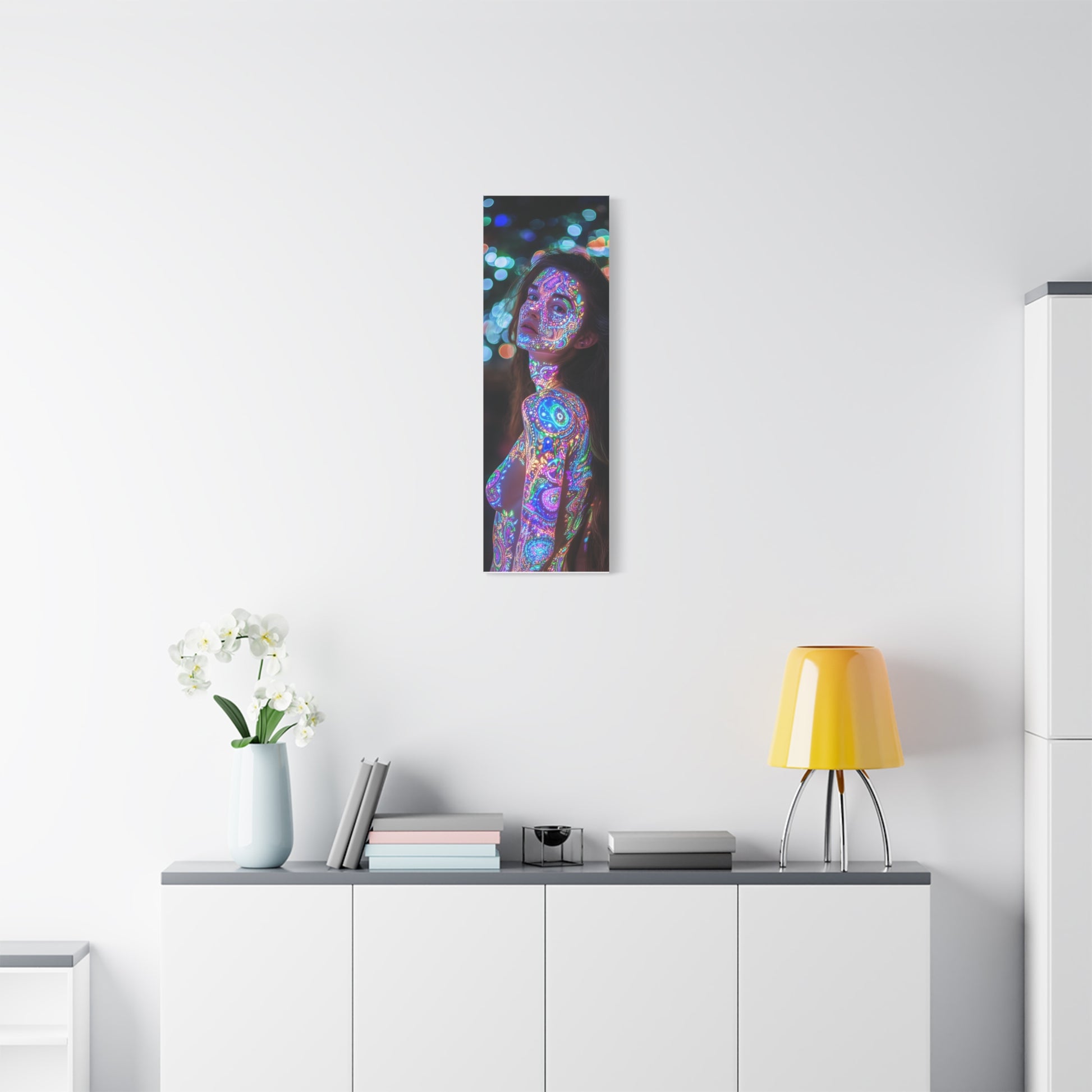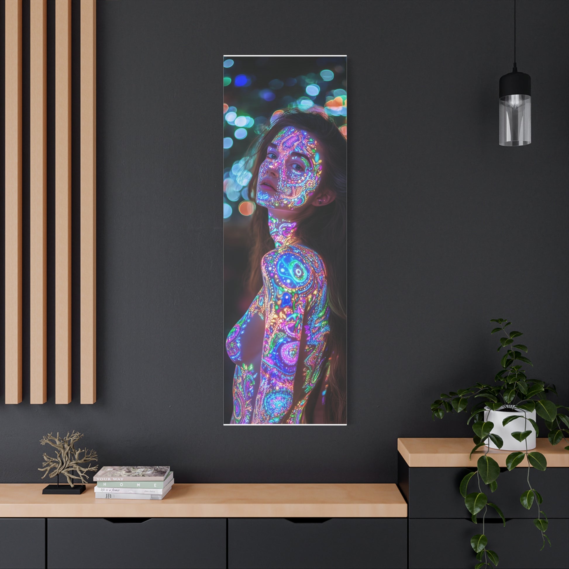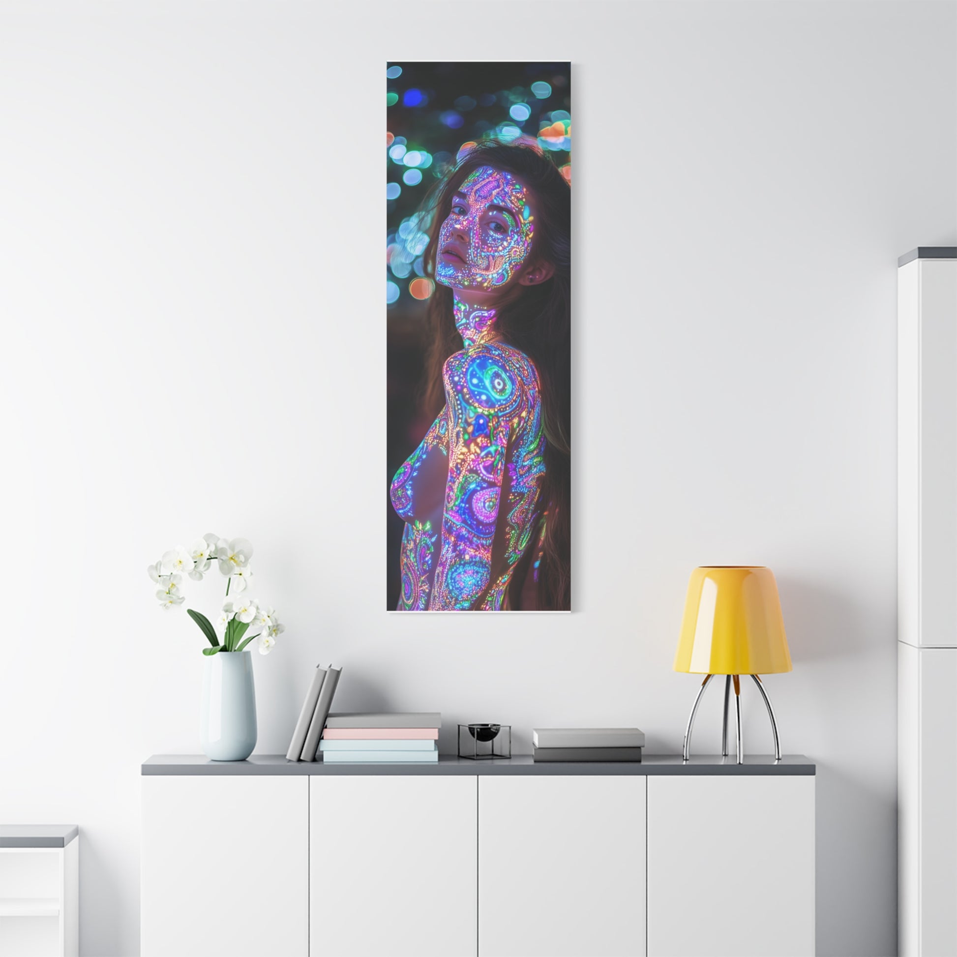 A celestial dance unfolds upon skin, where vibrant patterns shimmer like constellations in a dreamscape. Her gaze invites you into realms unknown, where light and shadow entwine, whispering secrets of the universe.