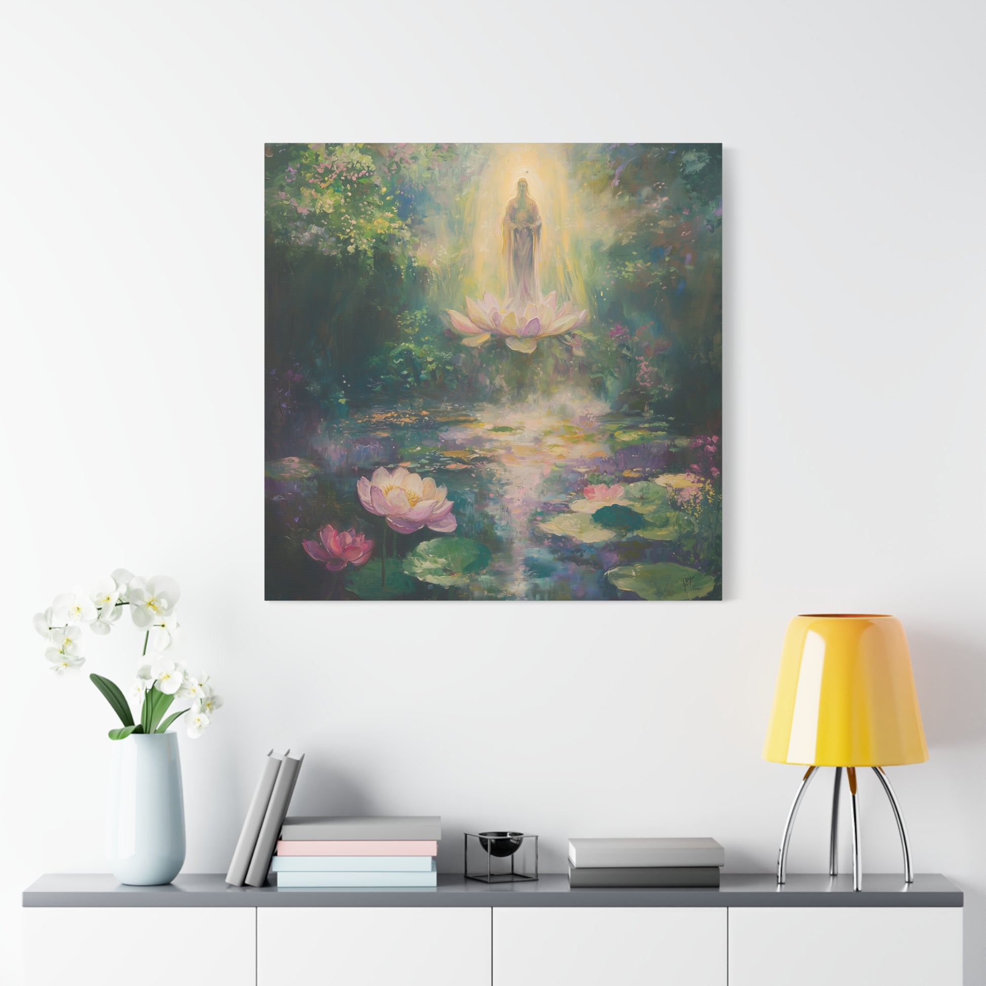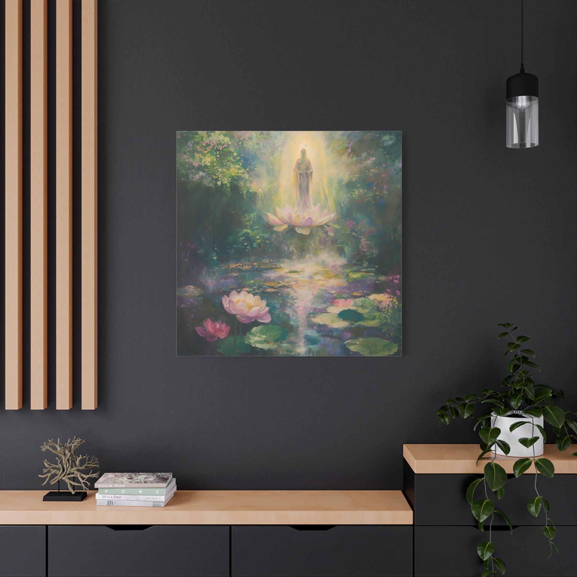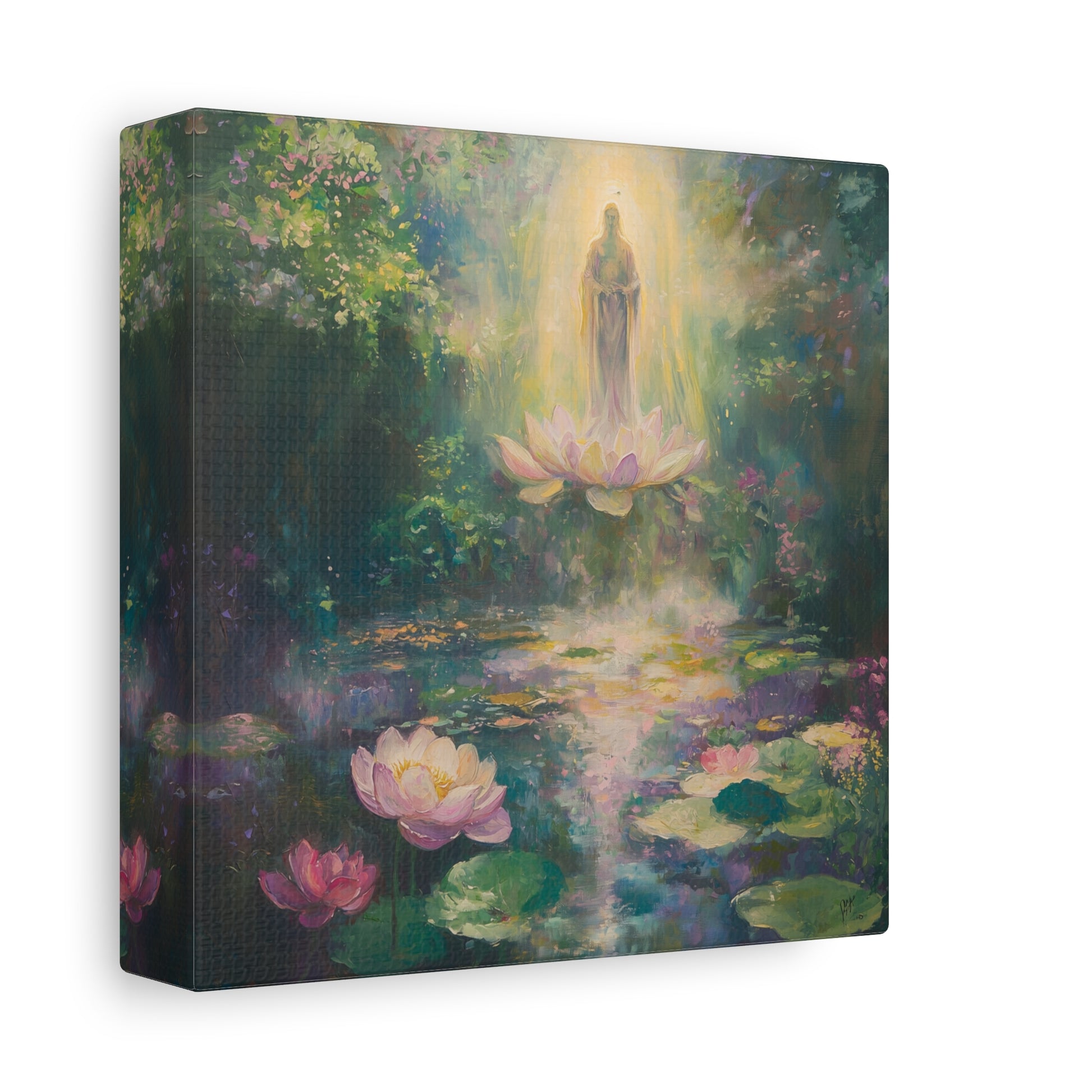 A serene figure rises from a luminous lotus, casting gentle radiance upon a tranquil pond. The scene breathes with the whispers of nature, inviting a moment of reflection and peace amidst the ethereal glow.