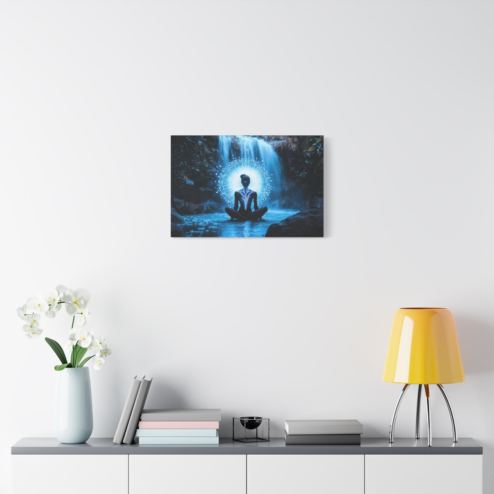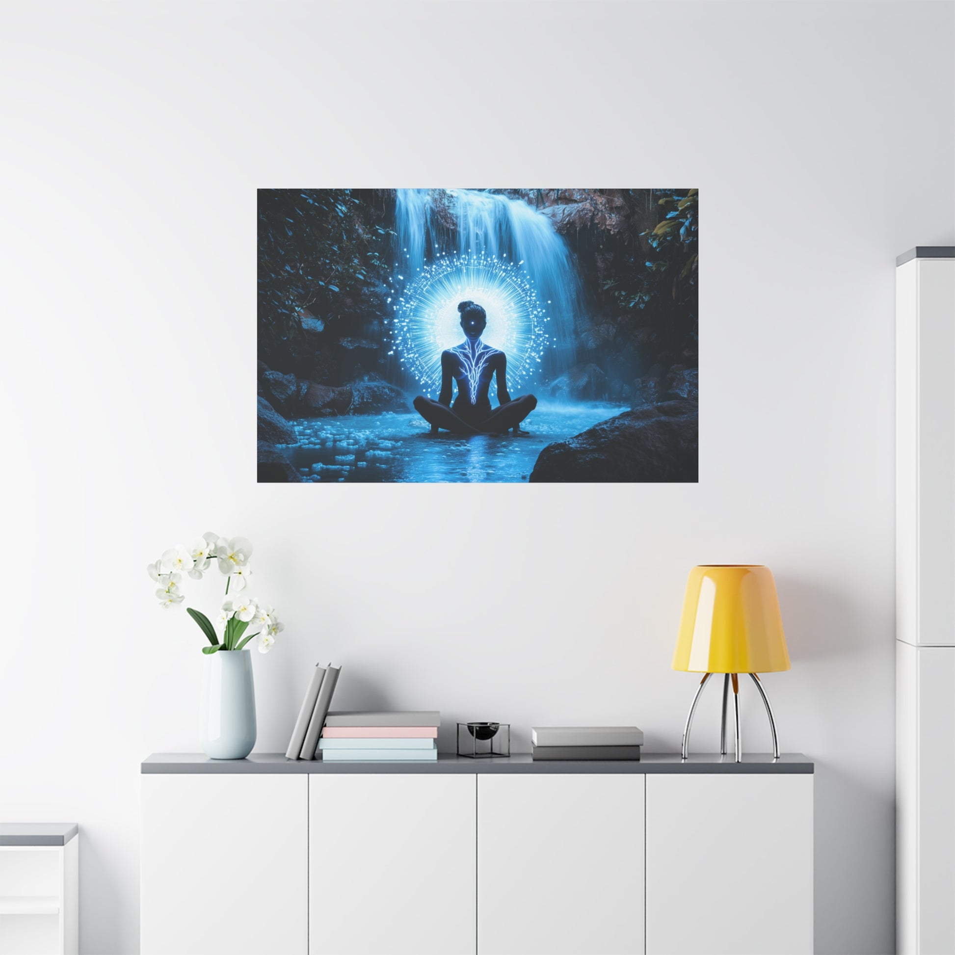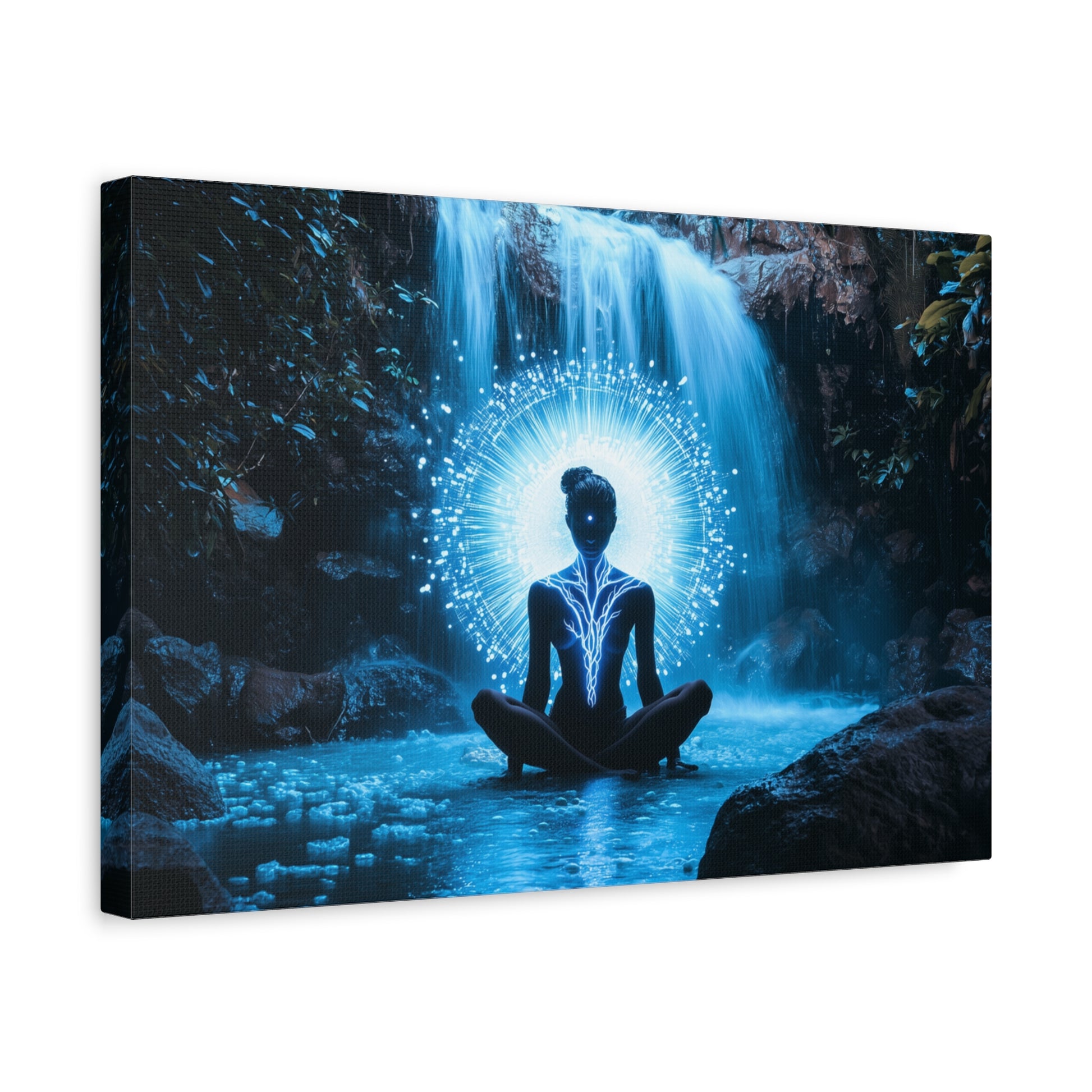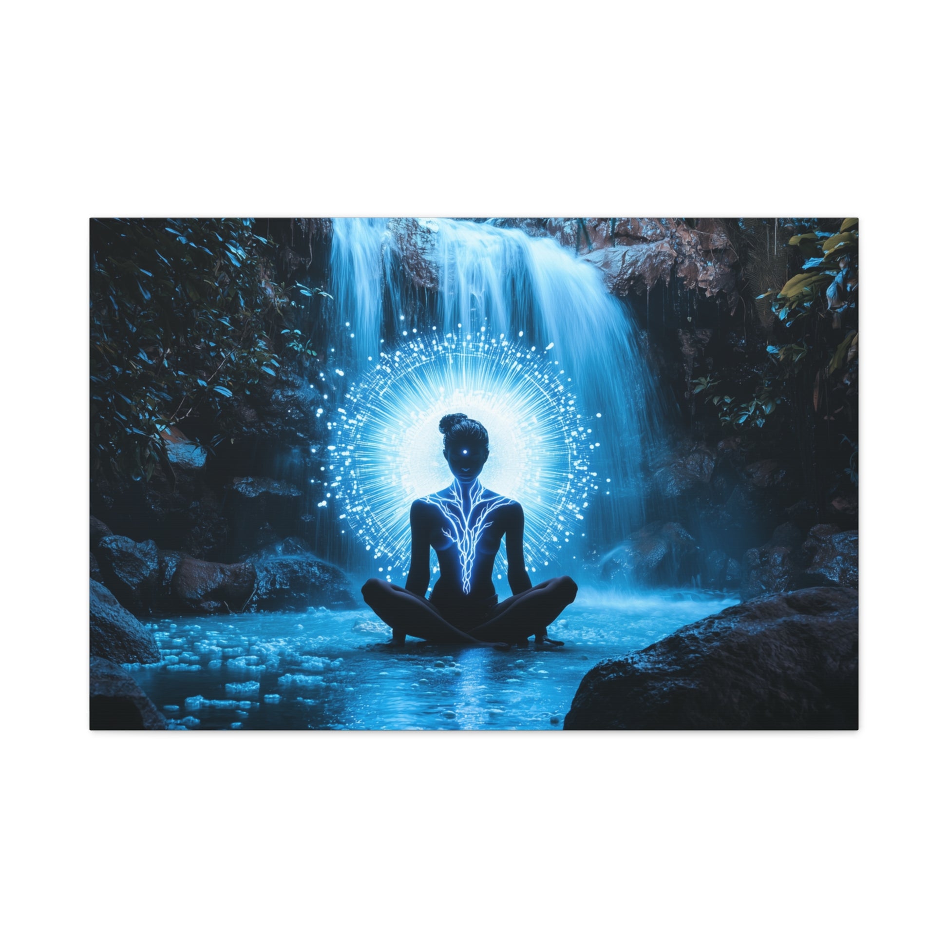 Amidst the cascading waters, a figure sits bathed in ethereal light, the essence of energy and tranquility intertwining. The scene invites contemplation, as the glow of serenity envelops the soul in a dance of luminescence.