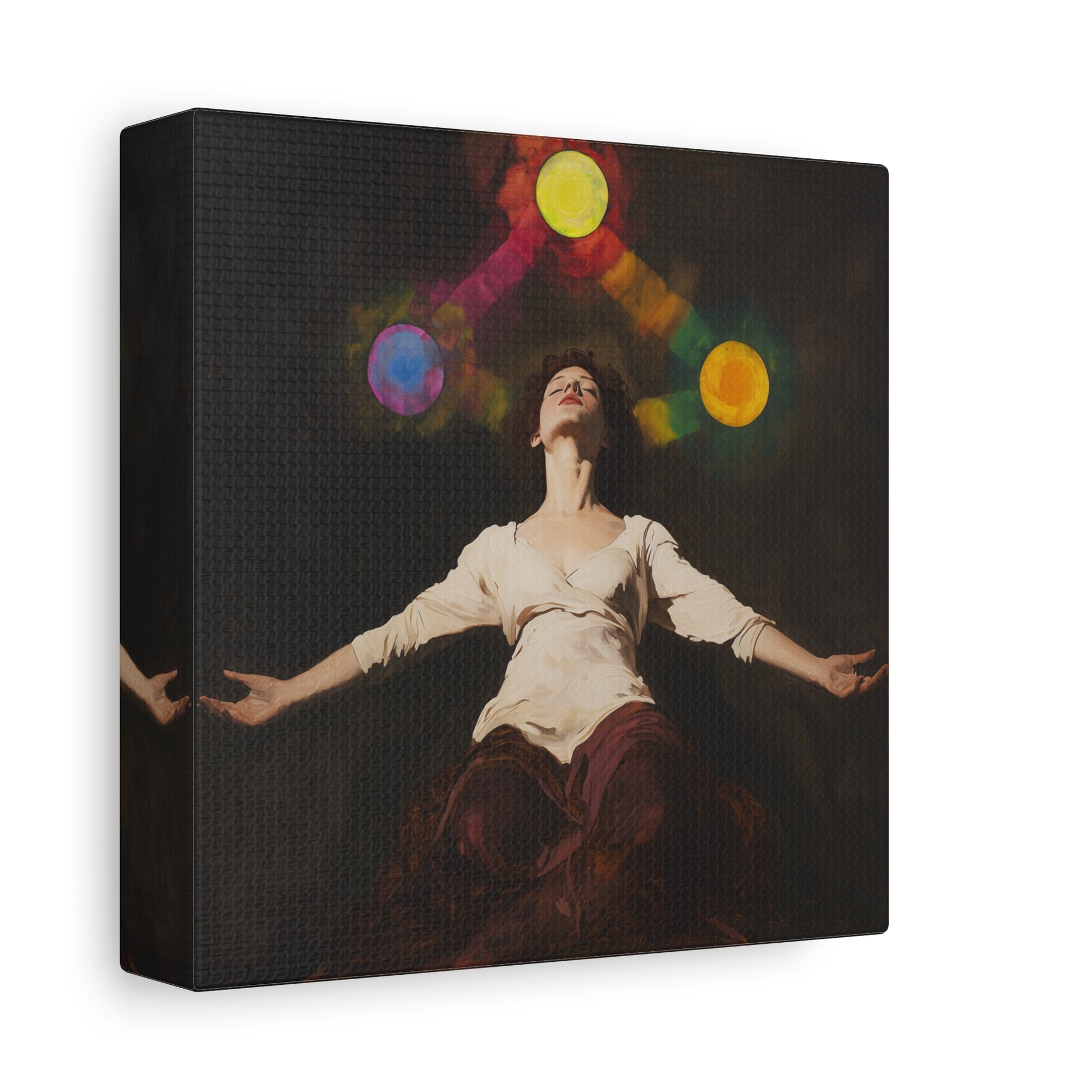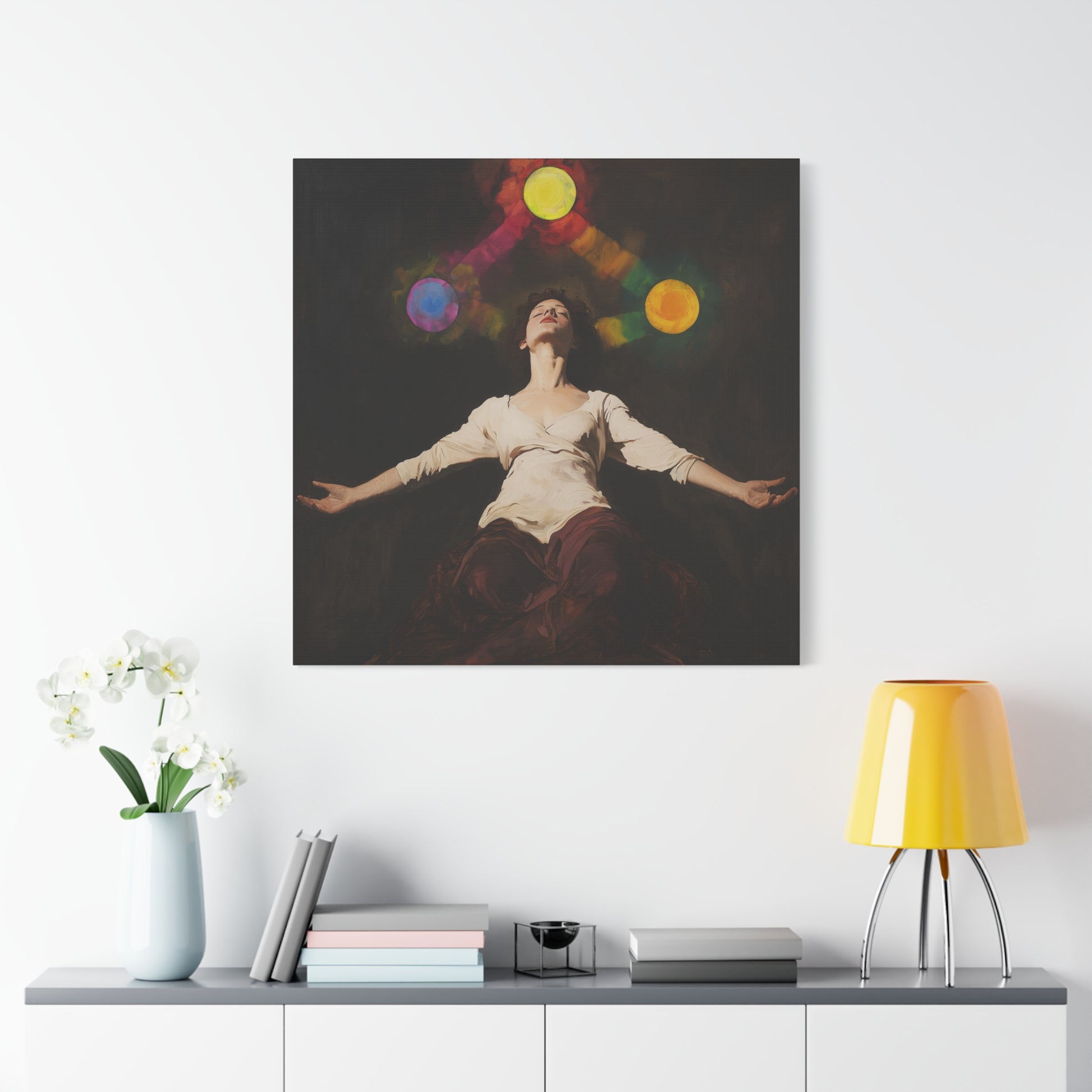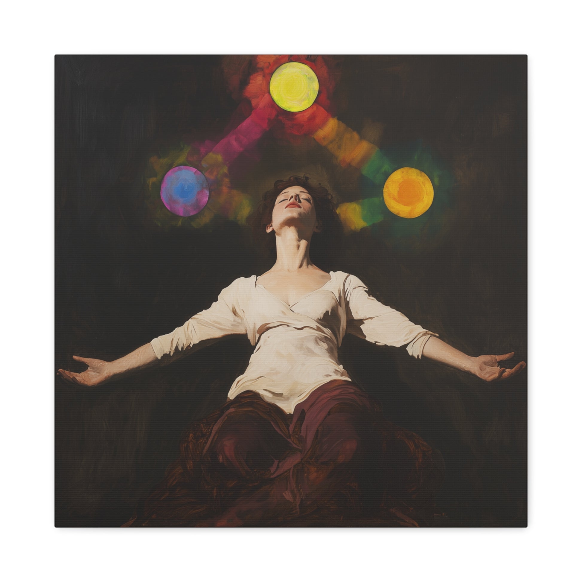 In a dance with the cosmos, she finds herself awash in the vibrant glow of celestial orbs, a silent symphony of balance and light. Her spirit reaches towards the infinite, embracing the mysteries beyond.