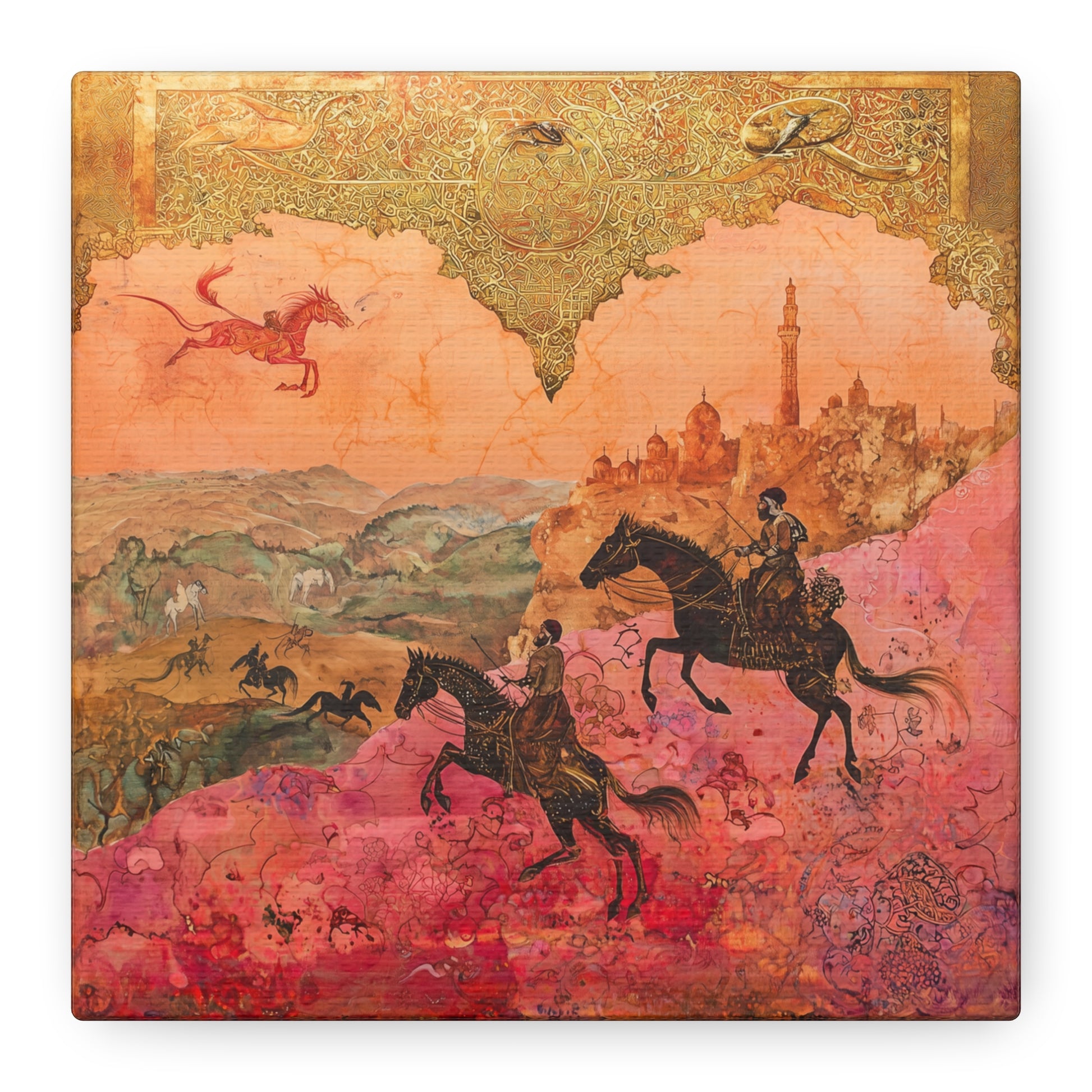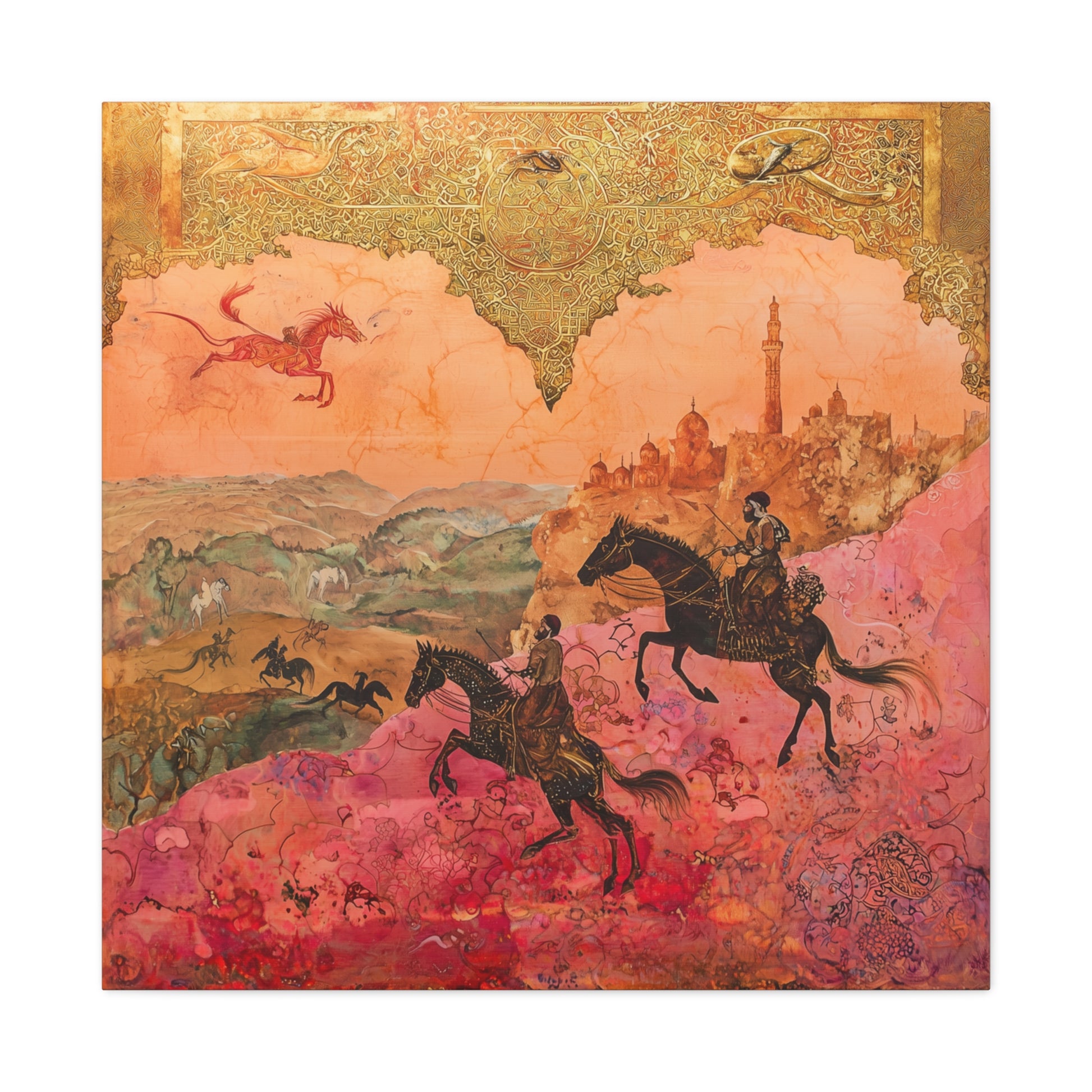 In a tapestry of golden hues and swirling patterns, mythical riders traverse the landscape, guided by a celestial beacon. The interplay of ancient lore and vibrant energy invites the soul to journey beyond the known.