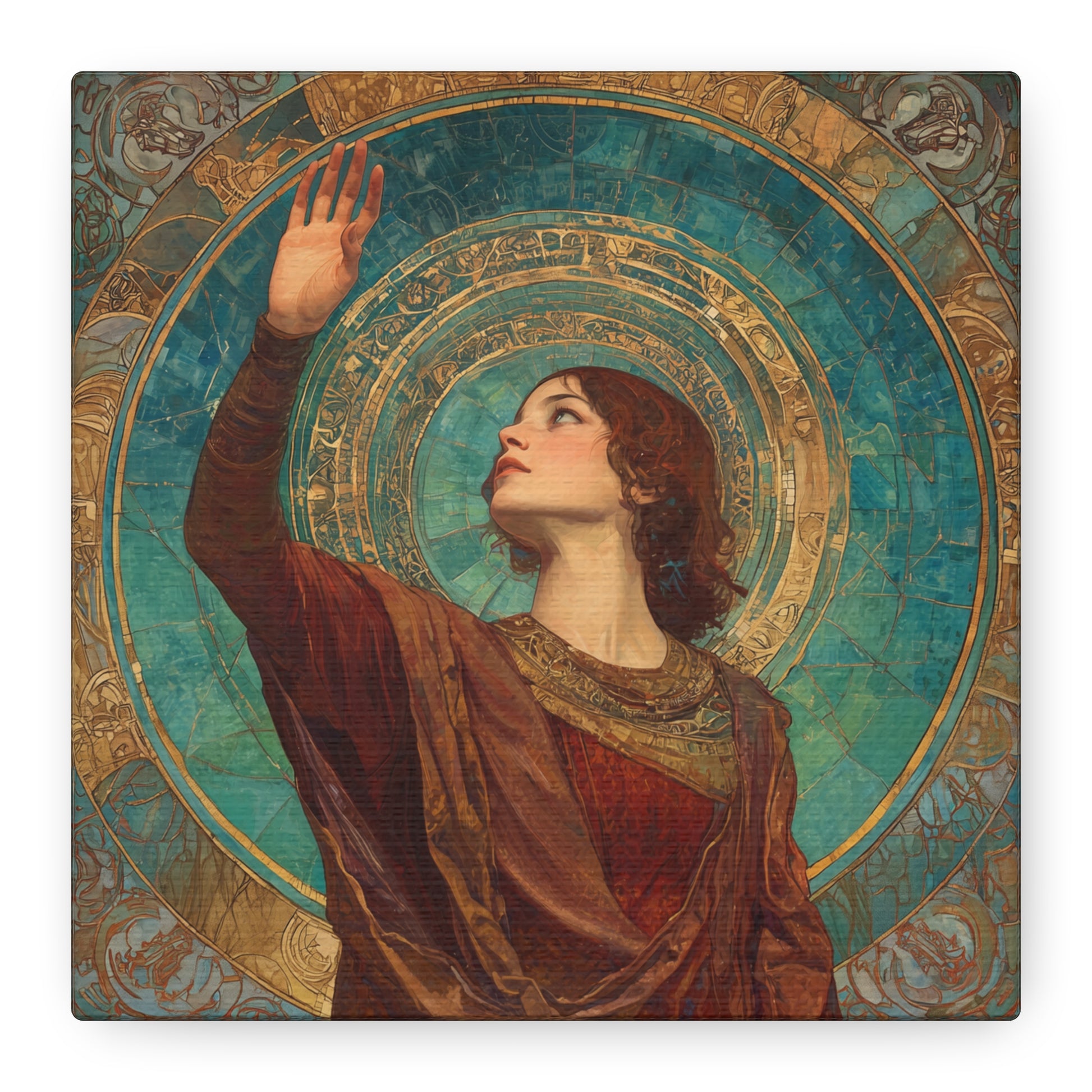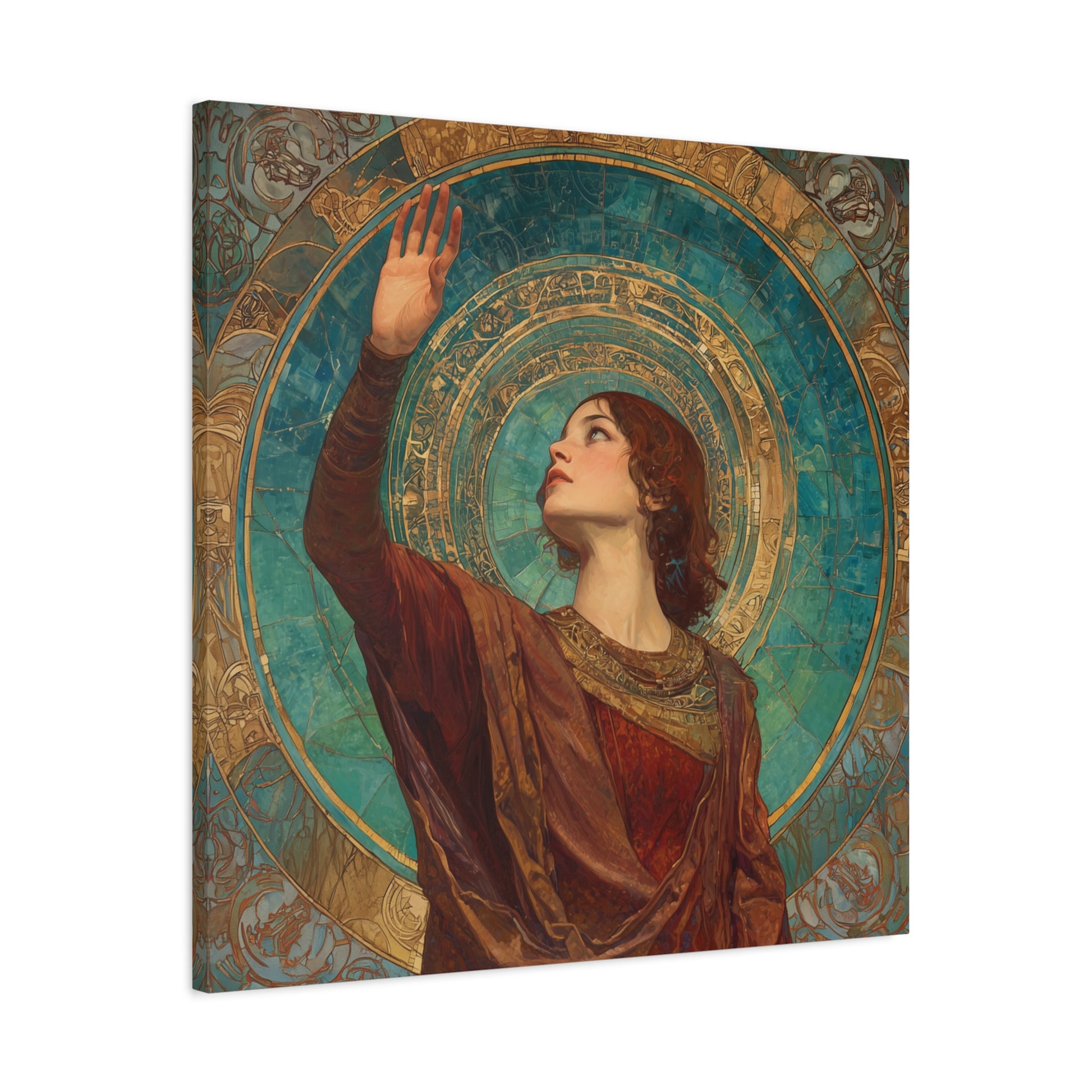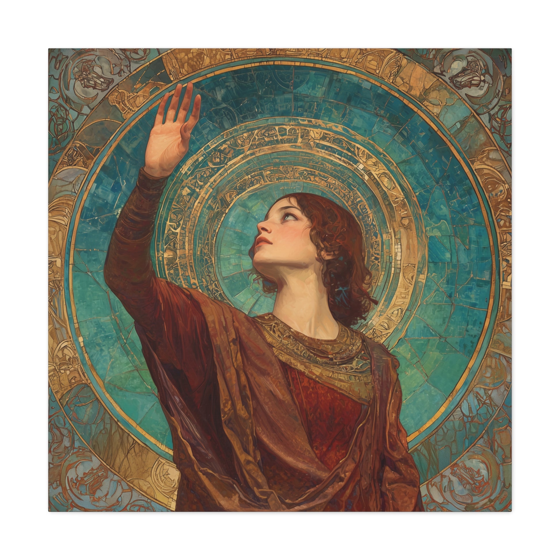In a dance between time and the cosmos, a figure reaches toward the infinite, a tapestry of celestial blues and golden echoes swirling around. It invites contemplation, a moment suspended between earth and the stars.