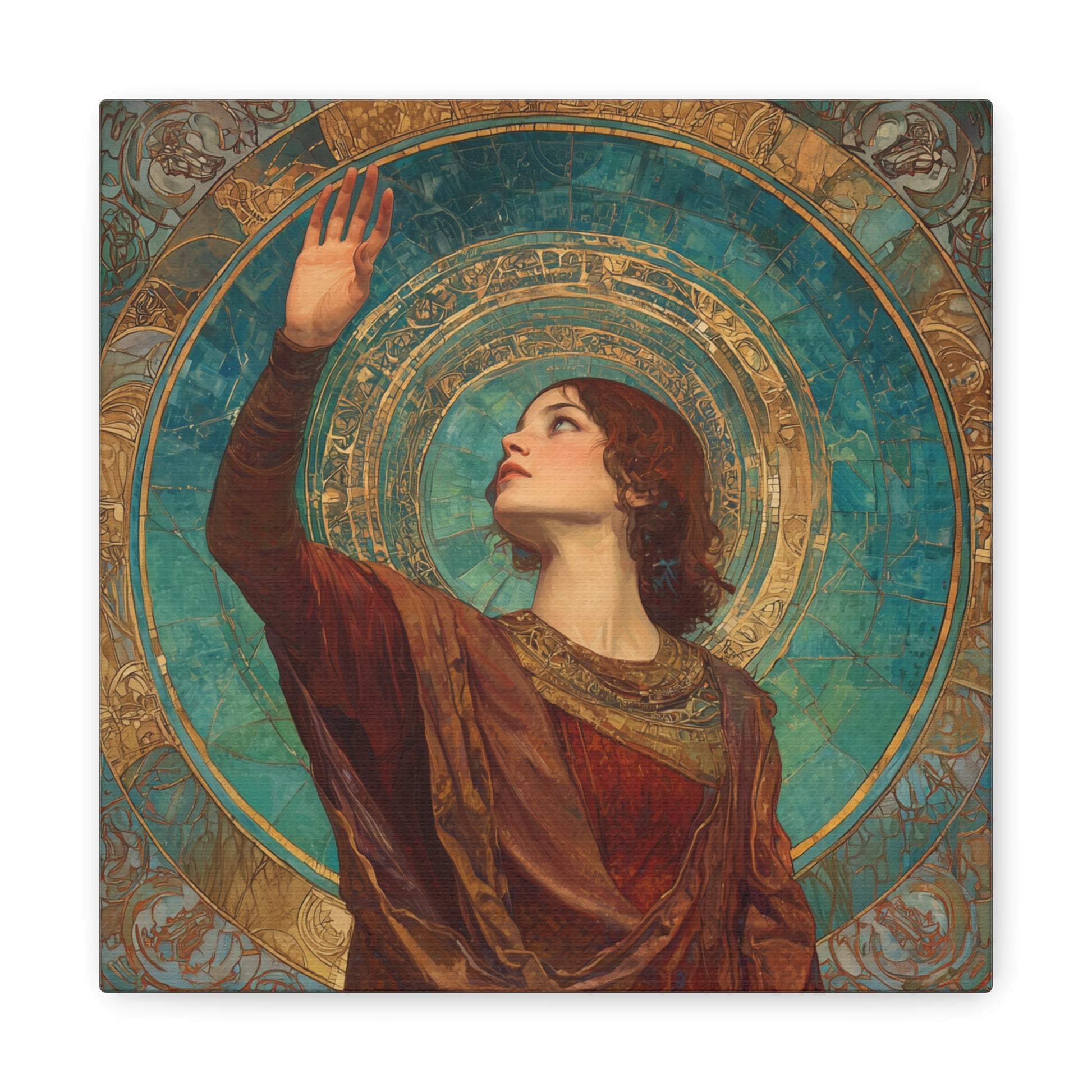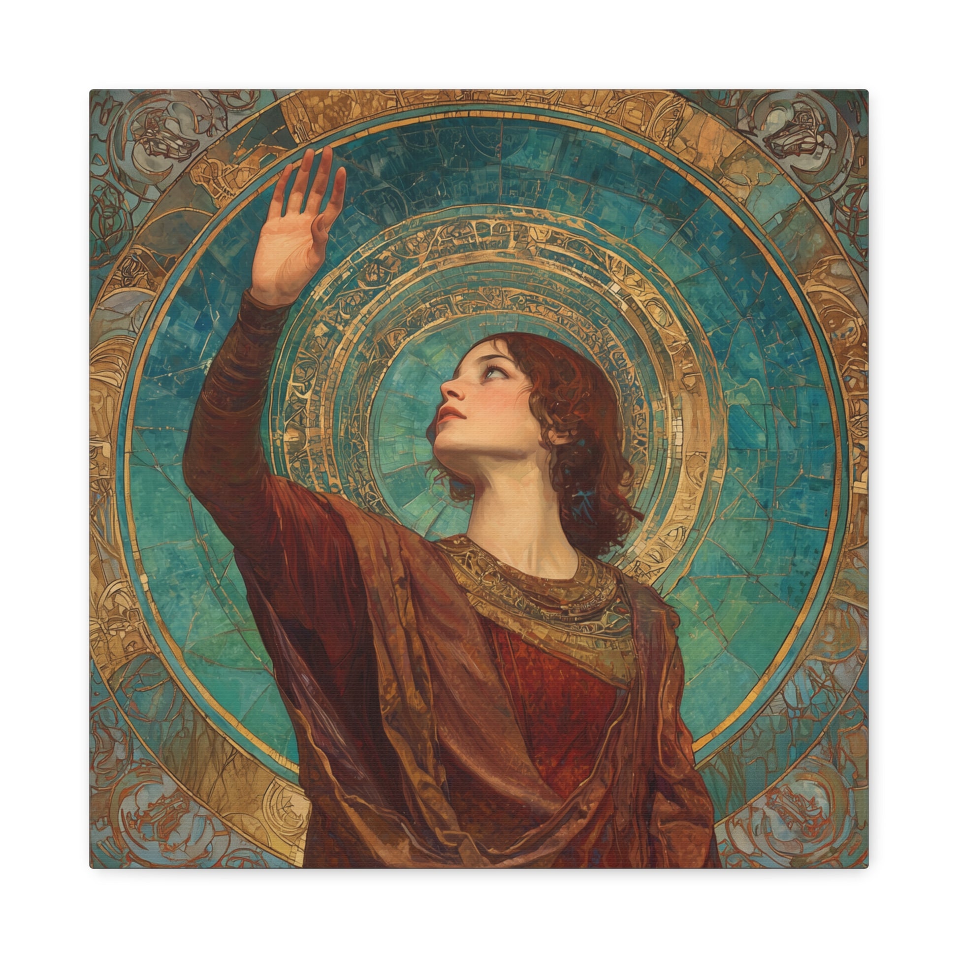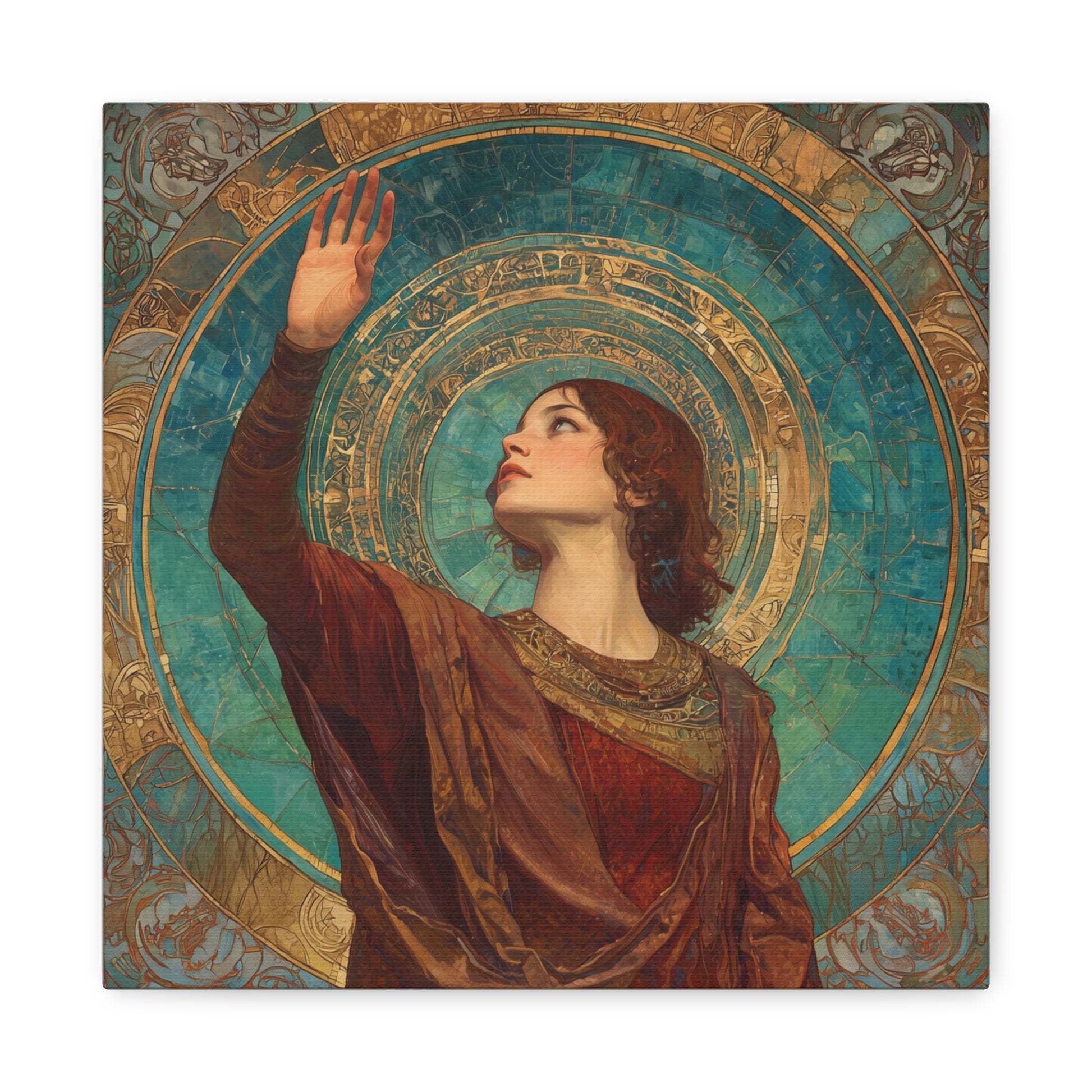 In a dance between time and the cosmos, a figure reaches toward the infinite, a tapestry of celestial blues and golden echoes swirling around. It invites contemplation, a moment suspended between earth and the stars.