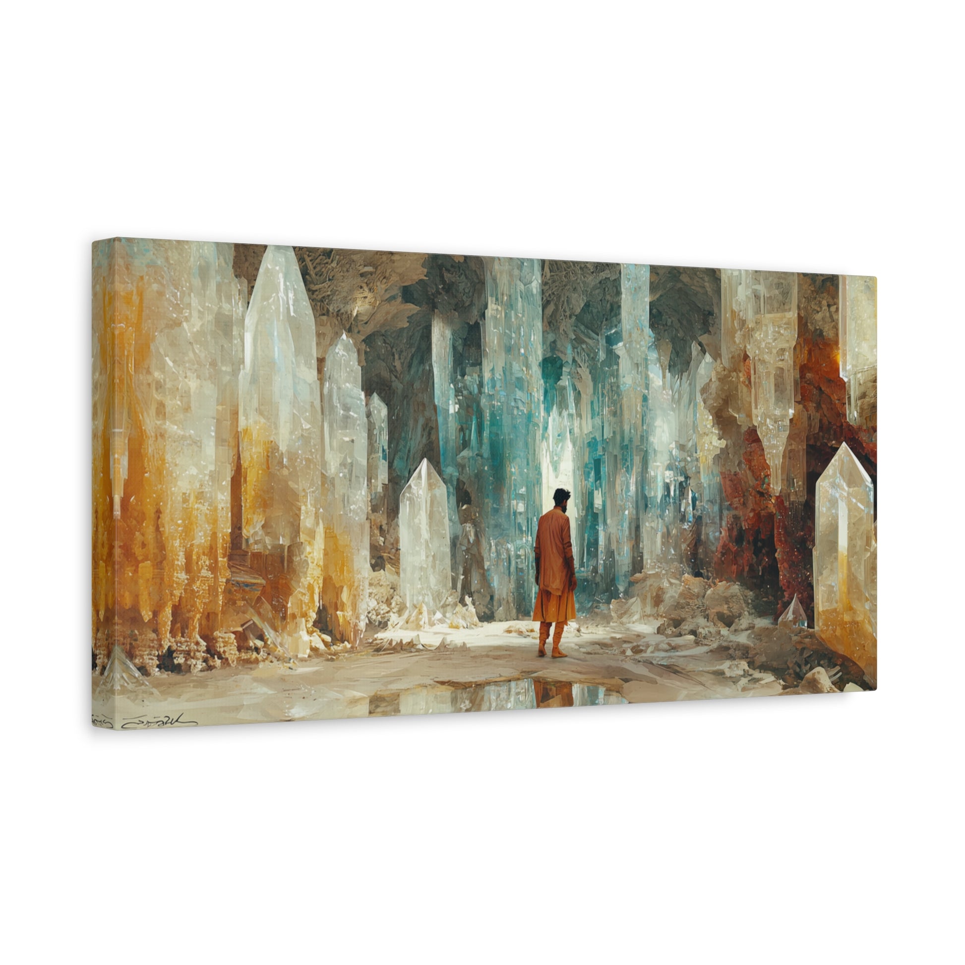 Within a cavern of crystalline spires, a solitary figure stands, wrapped in shimmering whispers of light and shadow. This luminous realm beckons, a sanctuary of wonder where time drips like liquid glass.