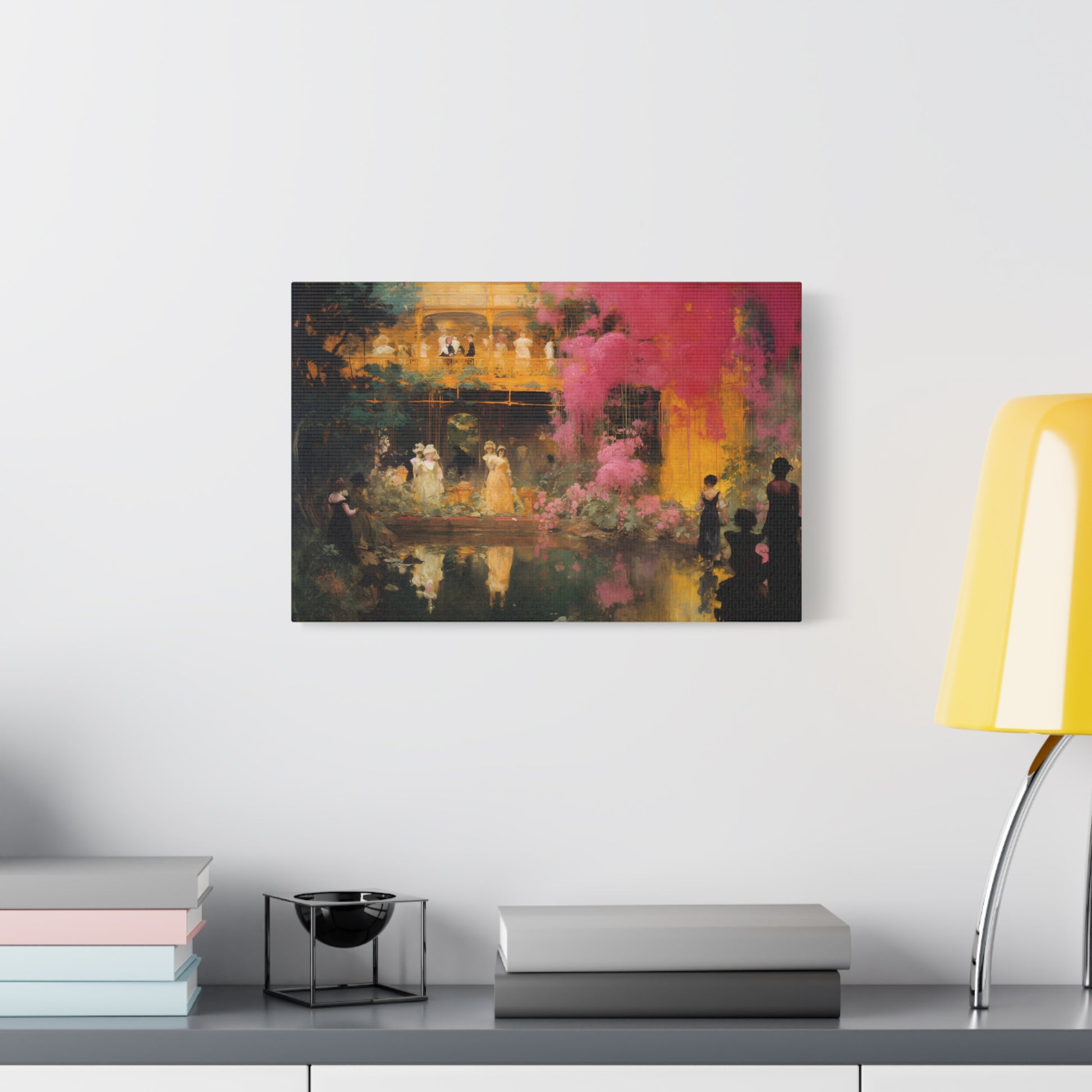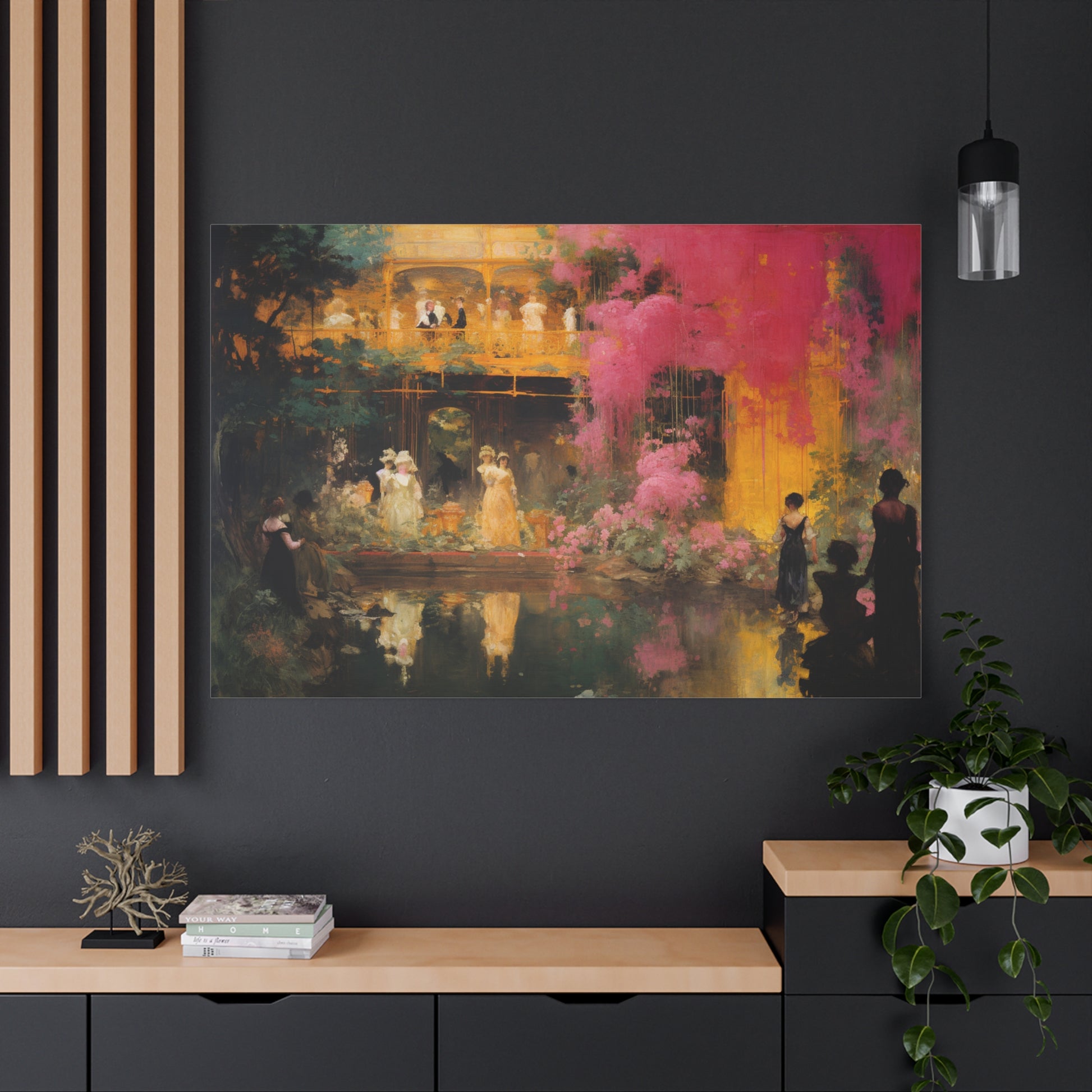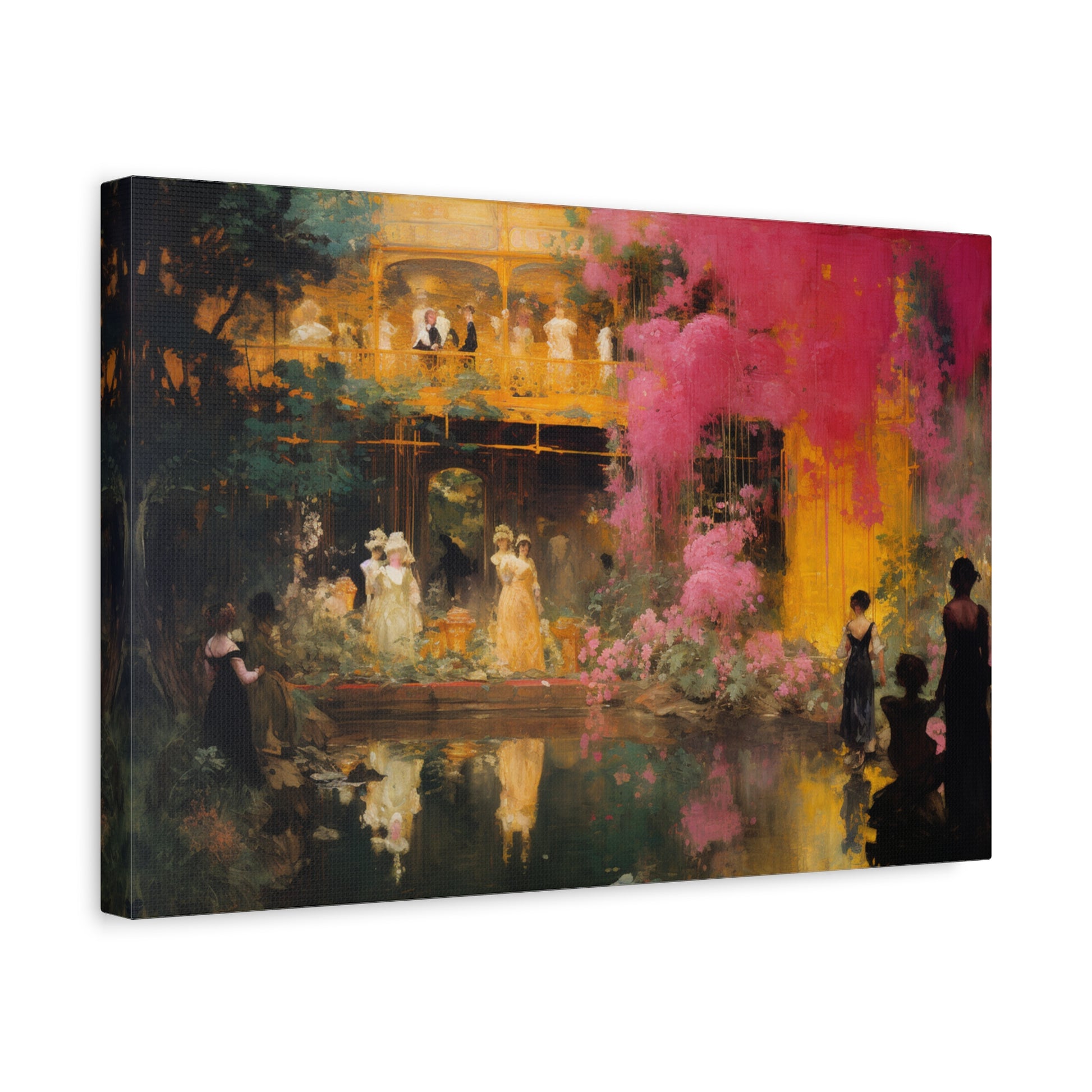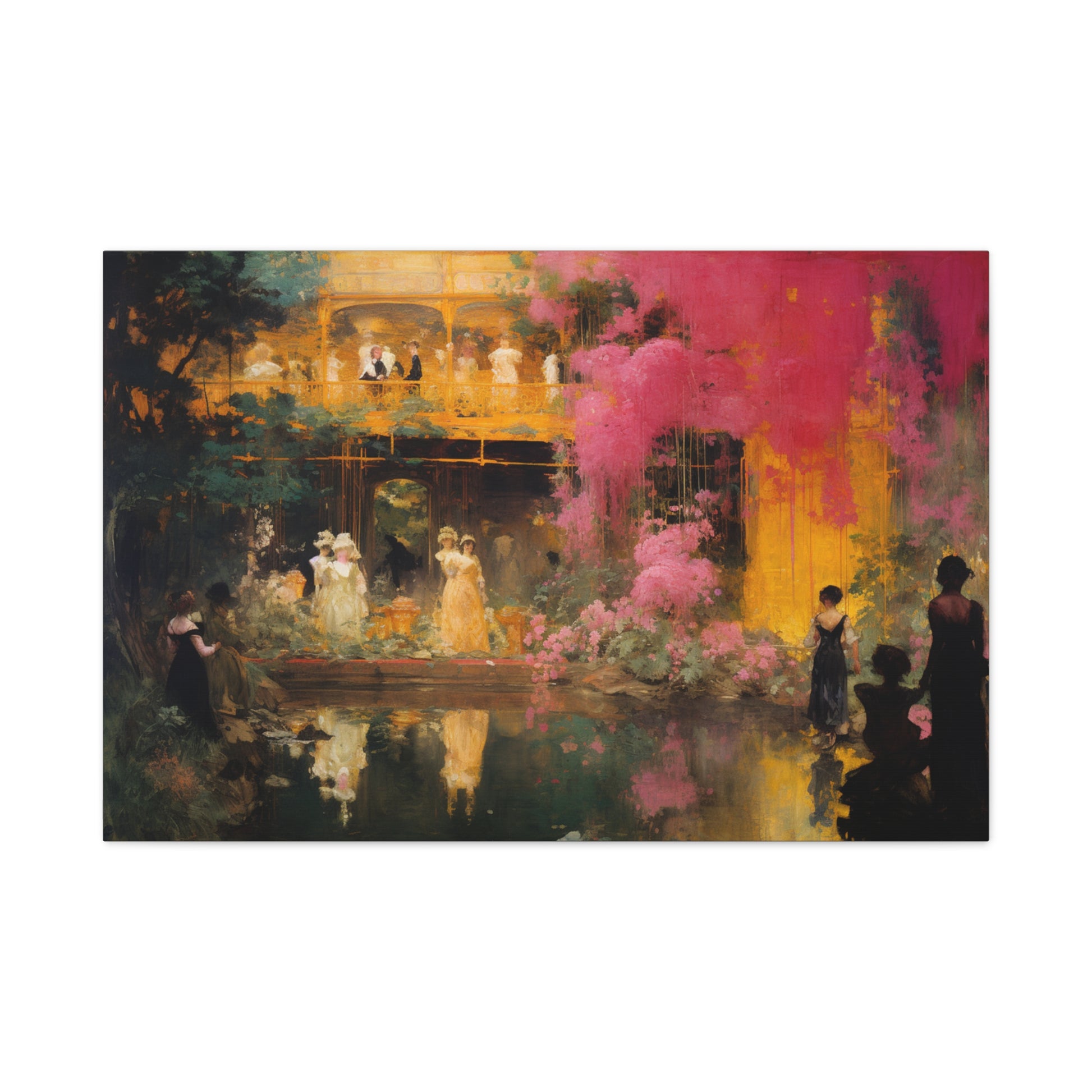 Beneath a canopy of vibrant blossoms, whispers of the past linger in the air. Figures bathed in twilight's glow gather, their reflections dancing upon the water, weaving a tapestry of mystery and elegance.
