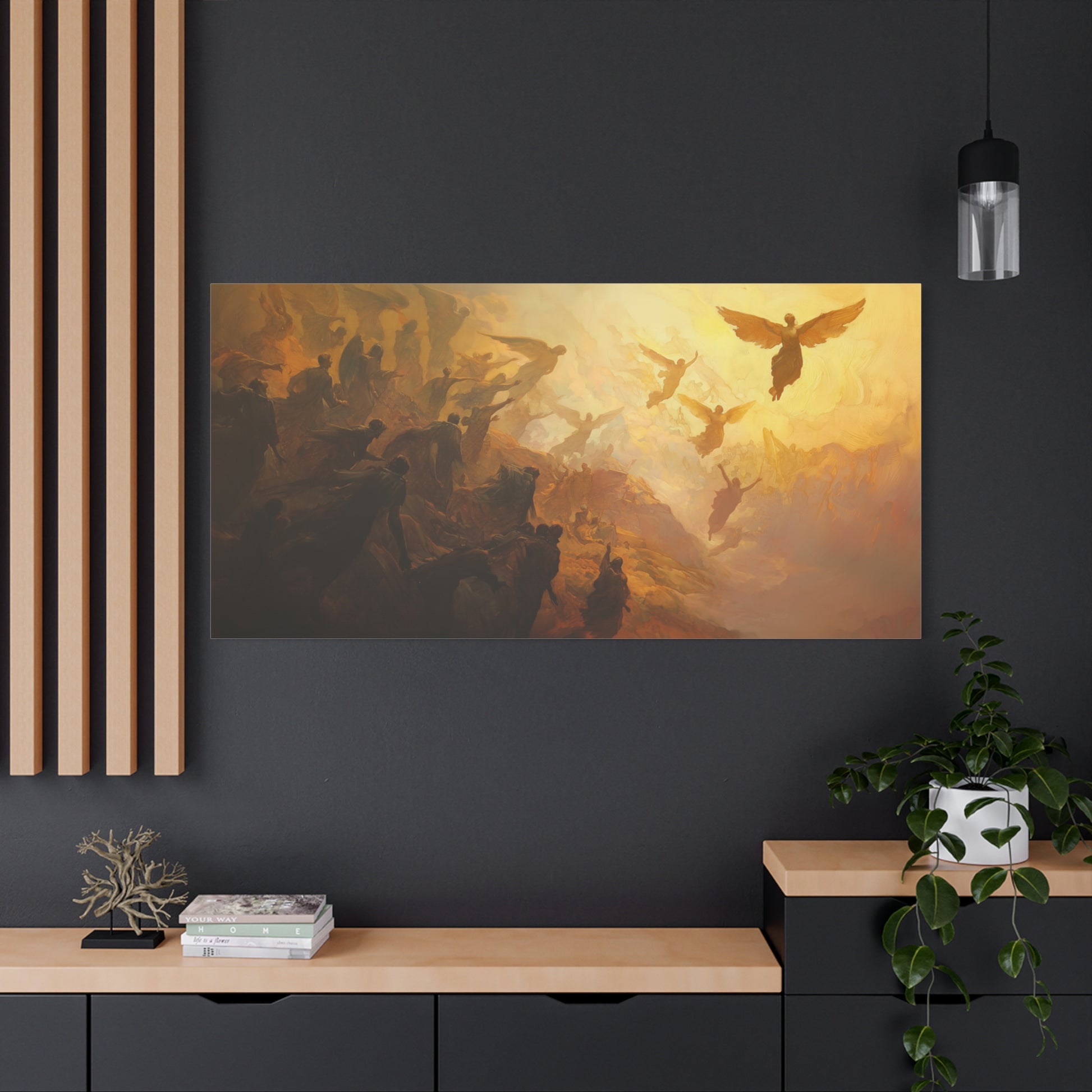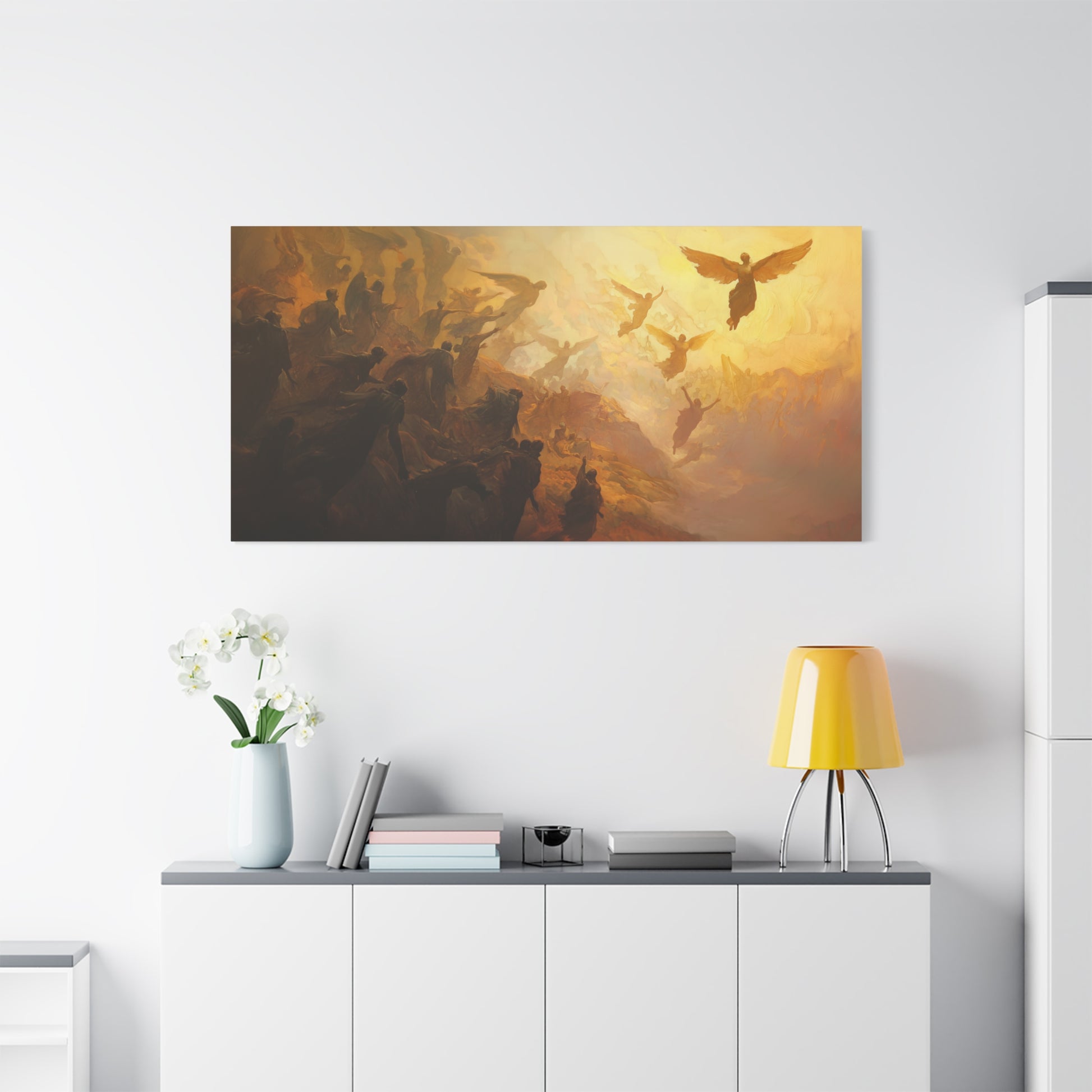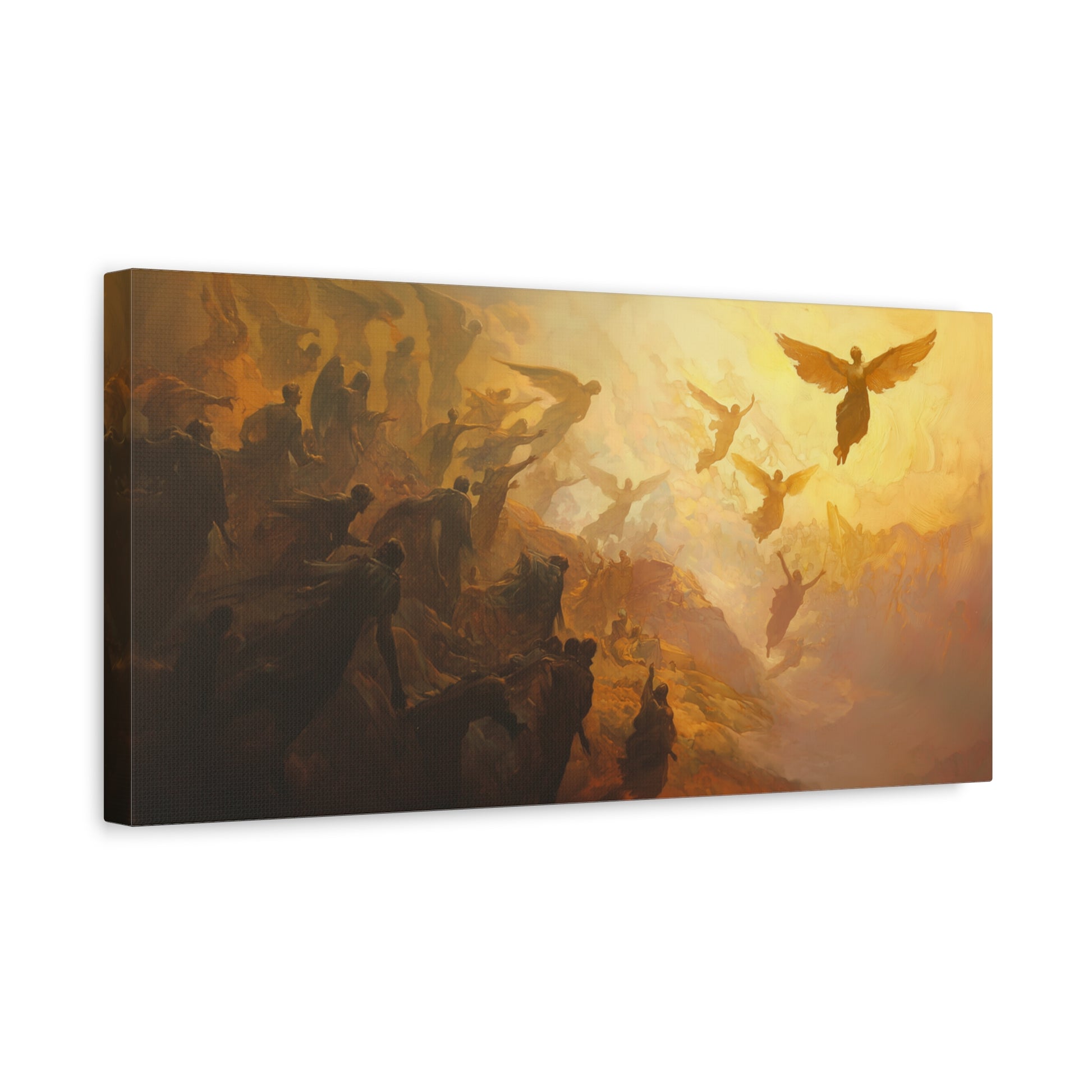 Bathed in golden light, ethereal beings soar toward the heavens, embodying a symphony of hope and transcendence. This celestial dance invites the soul to rise and embrace the infinite sky beyond.