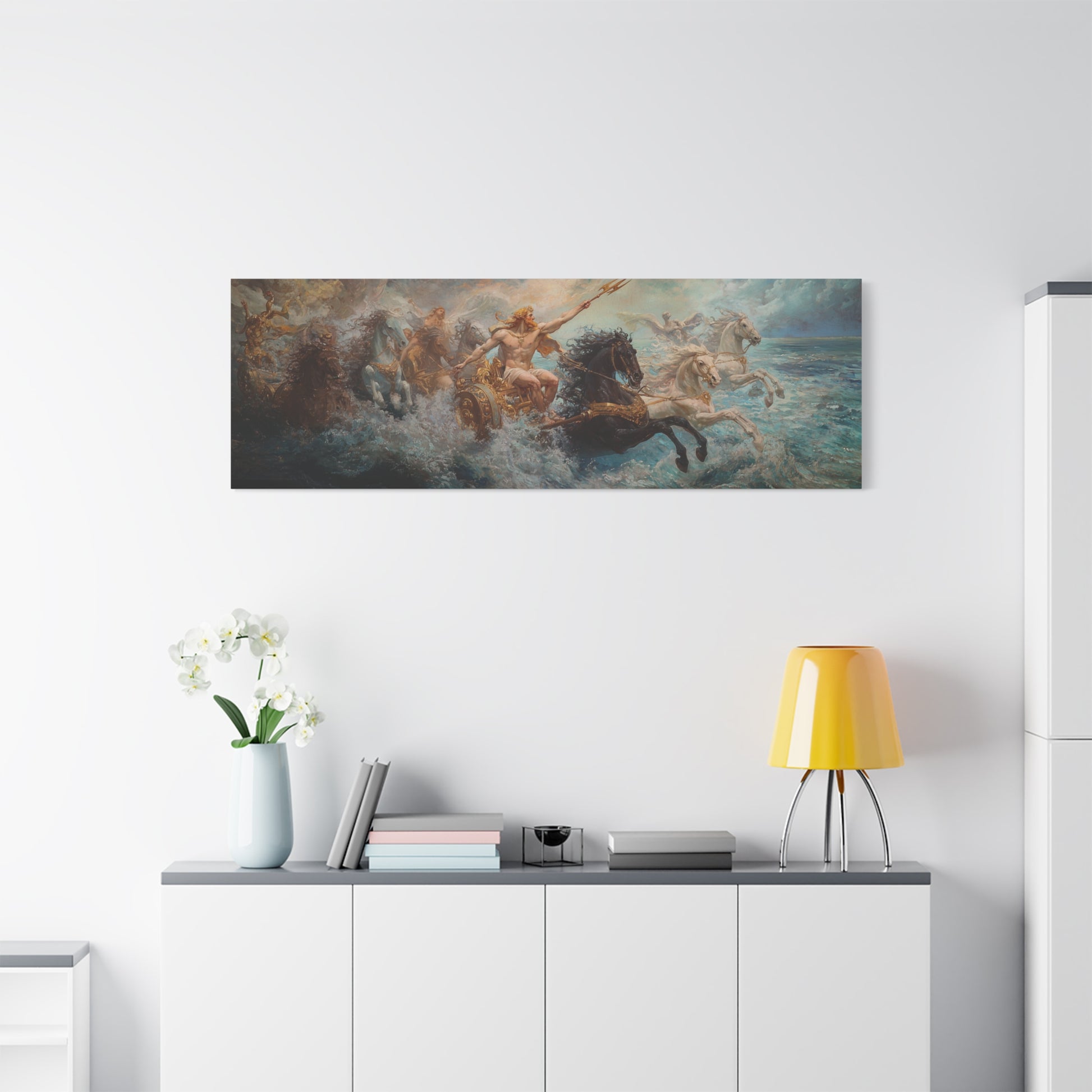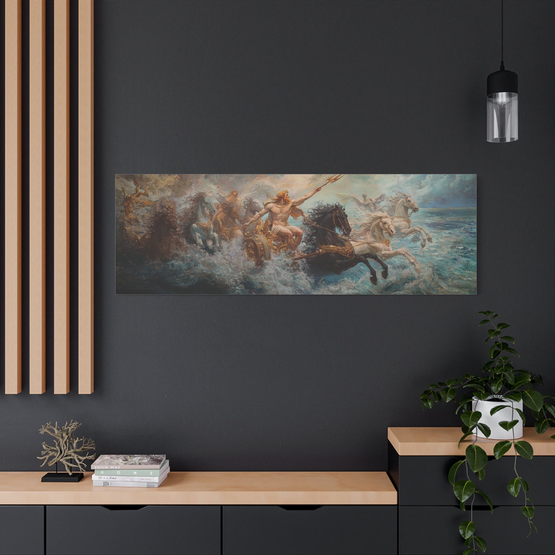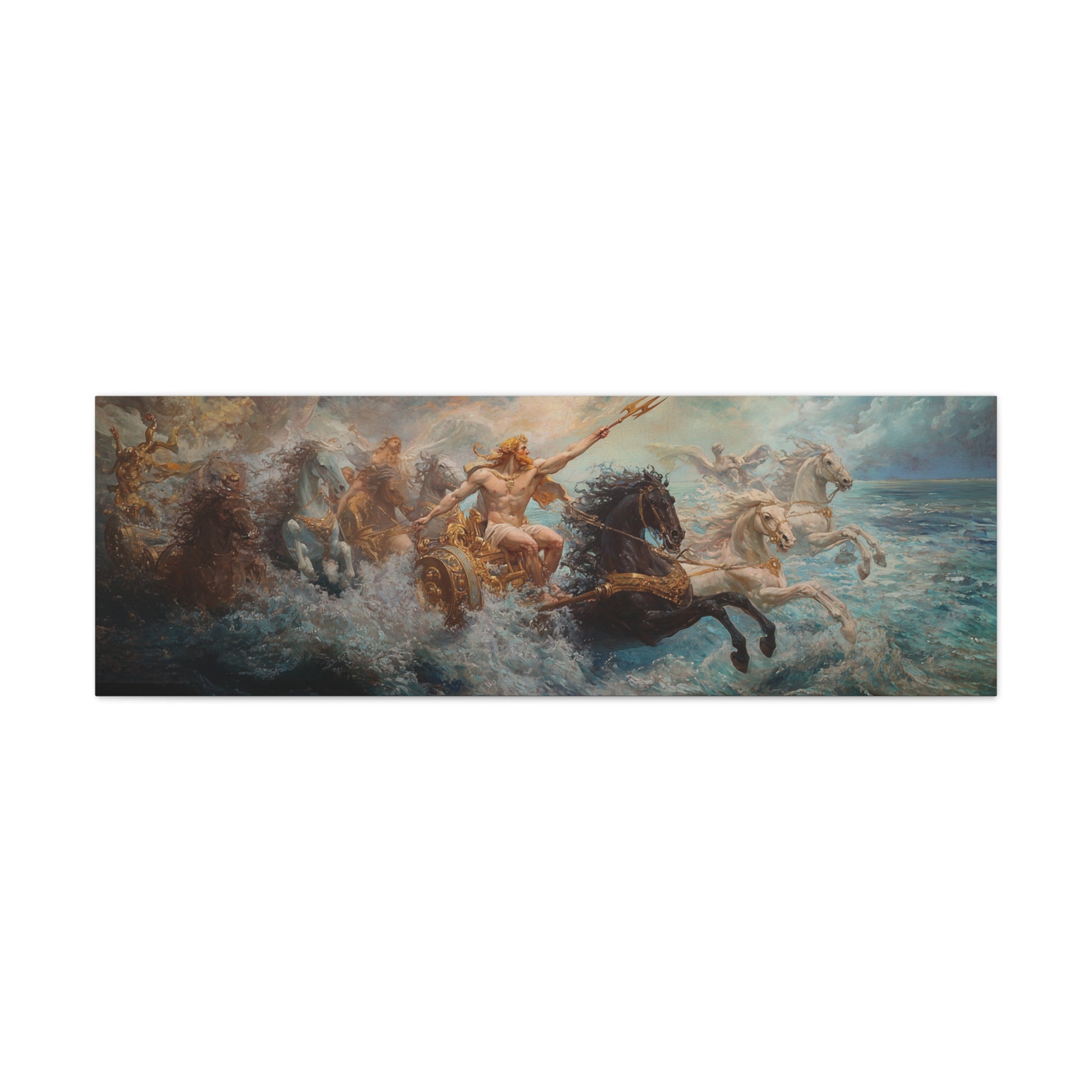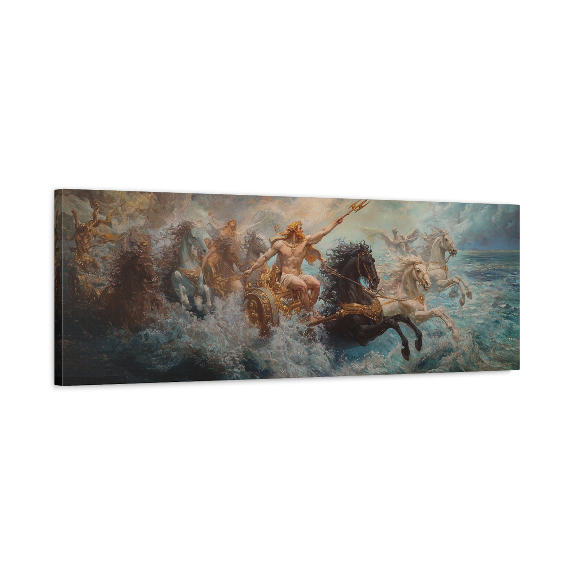 A tempestuous symphony unfolds as celestial steeds surge through the ocean's embrace, led by a figure of ancient power. The waves sing of forgotten realms and the primal dance of sea and sky.