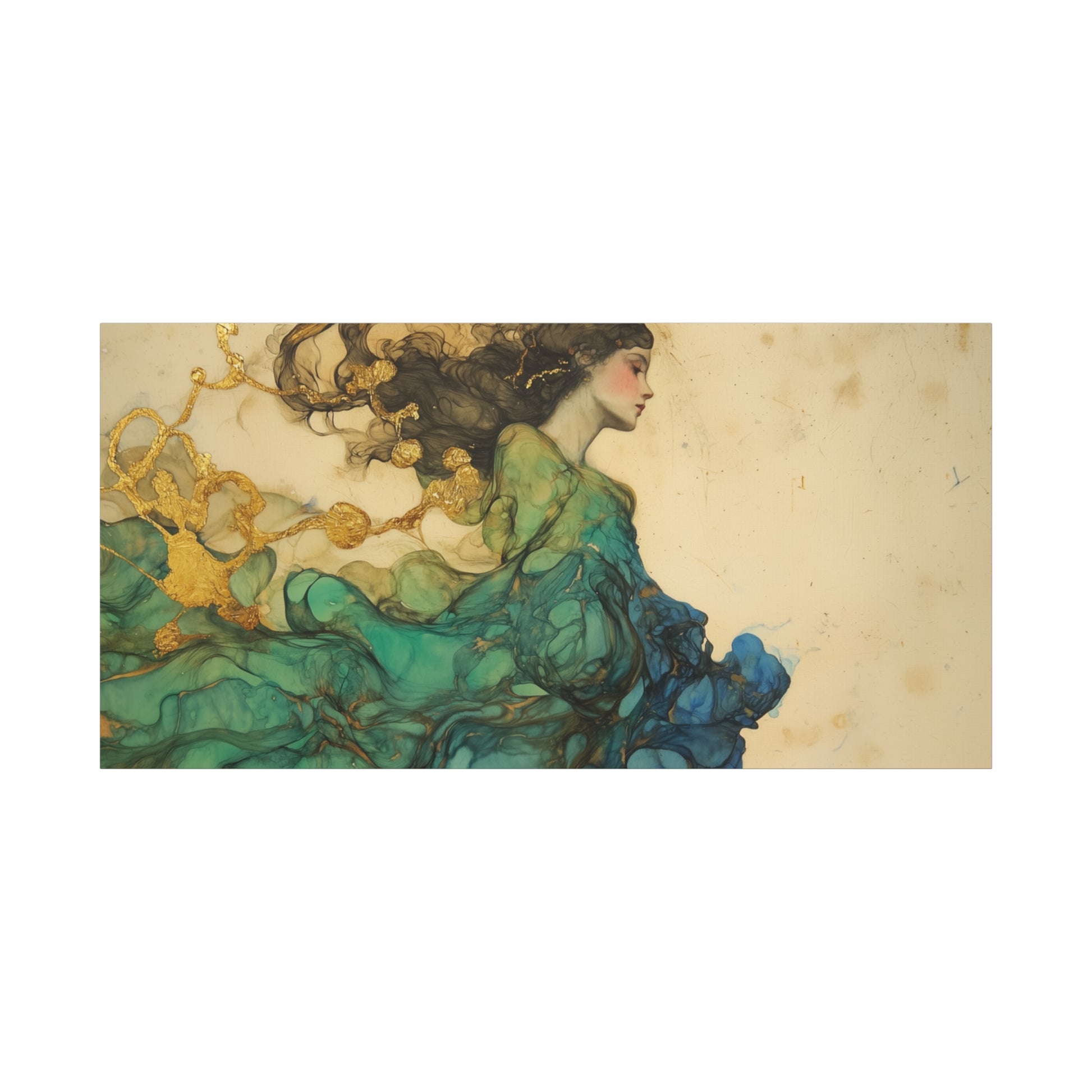 A serene figure drifts through a dance of colors, her essence intertwined with golden whispers. The fluidity of her form invites contemplation, as if she is both dream and dreamer, caught in a timeless embrace.