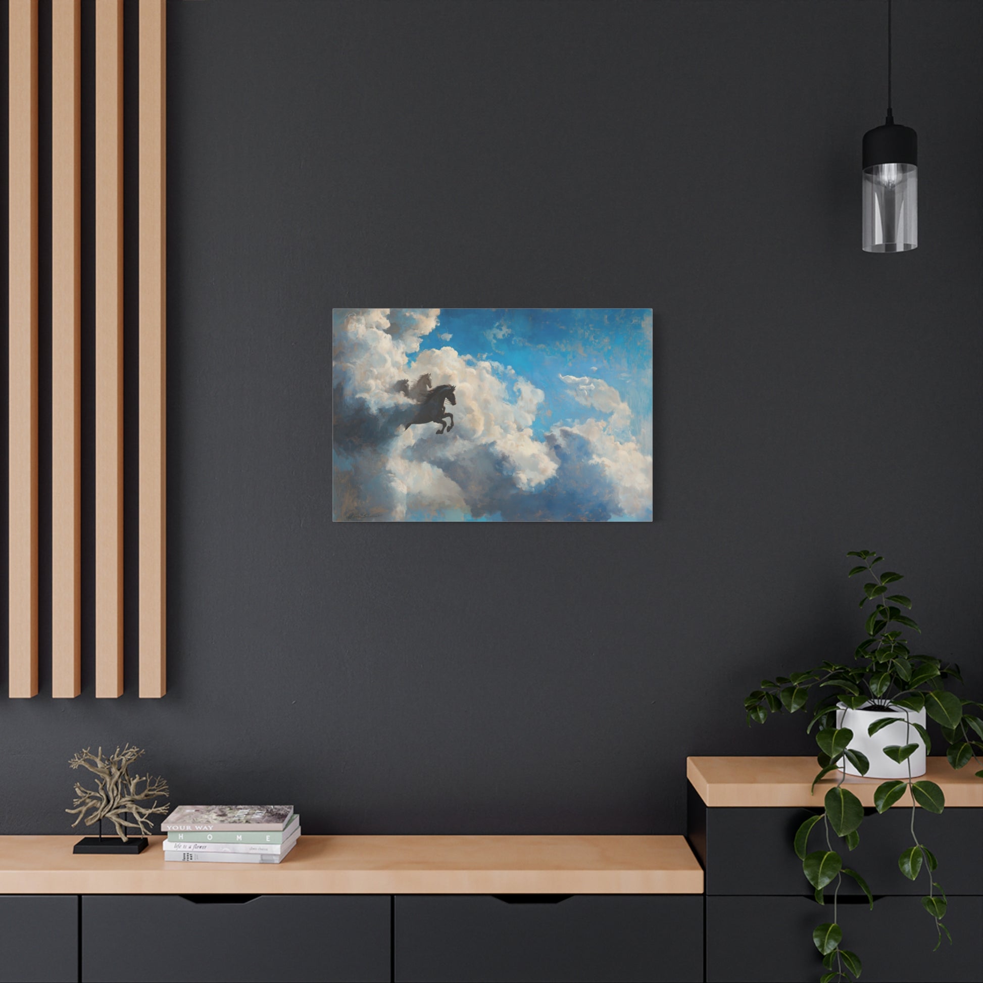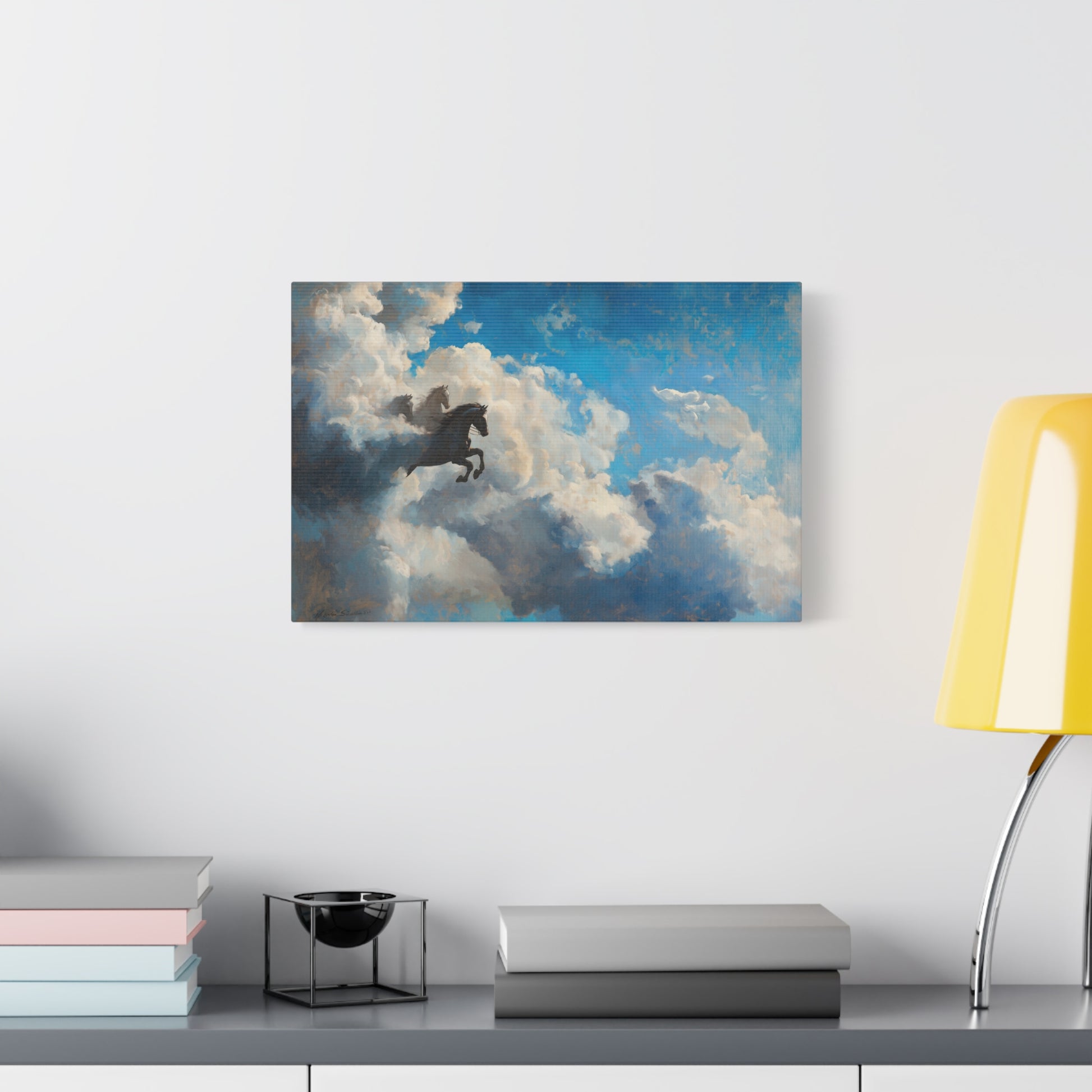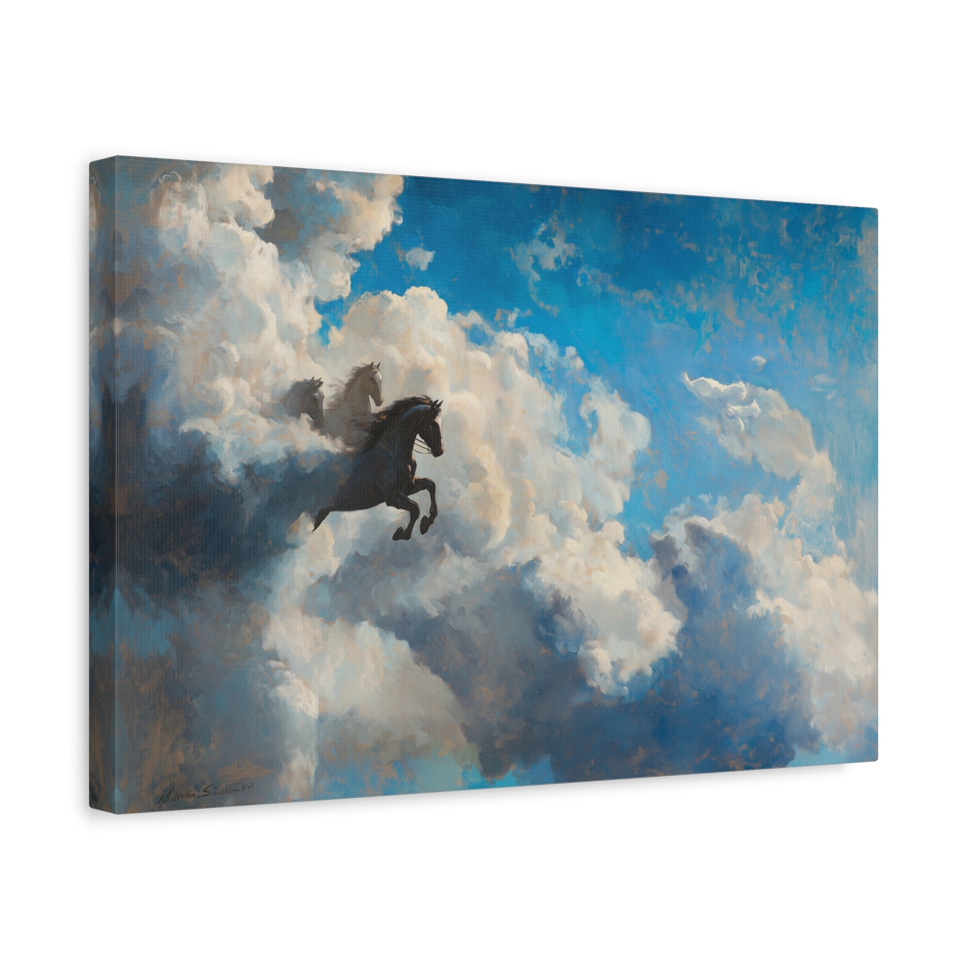 Horses made of cloud and dream race through the sky, their forms dissolving into whispers of vapor. It is a dance of freedom and flight, where the boundary between earth and heaven blurs.