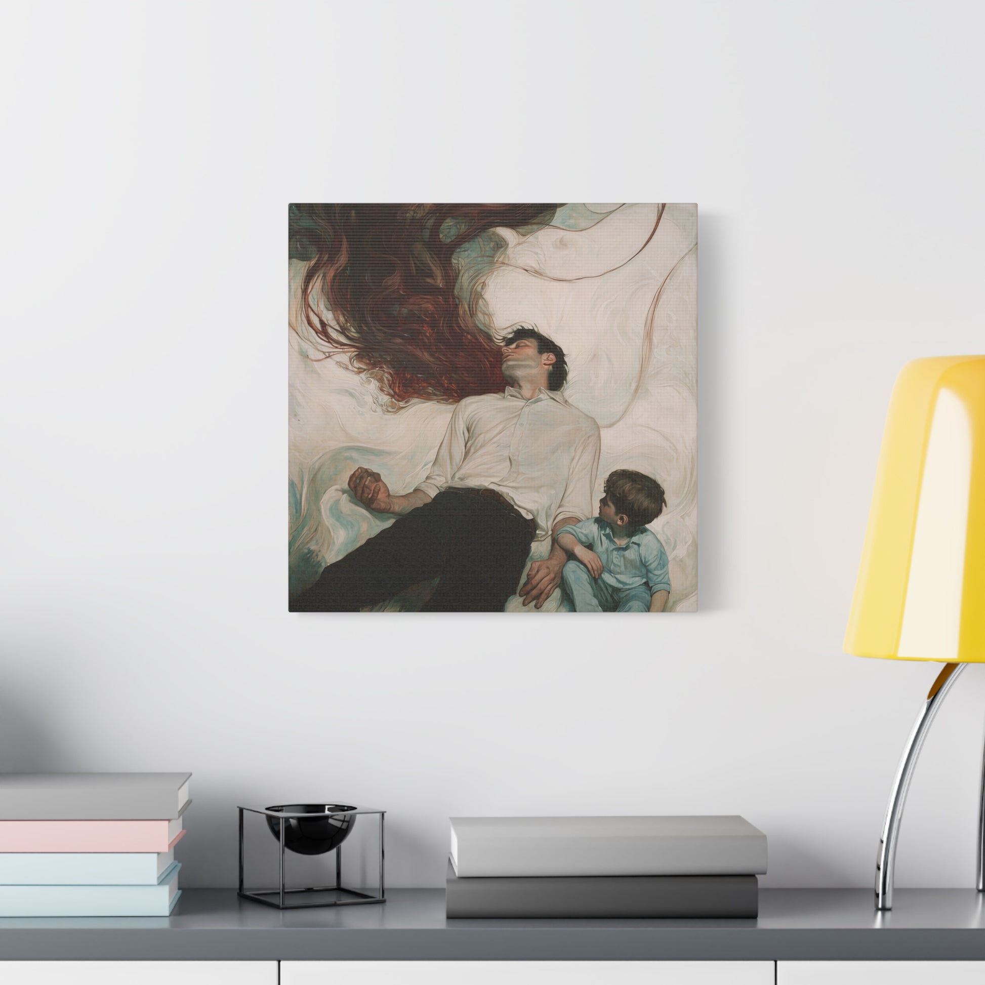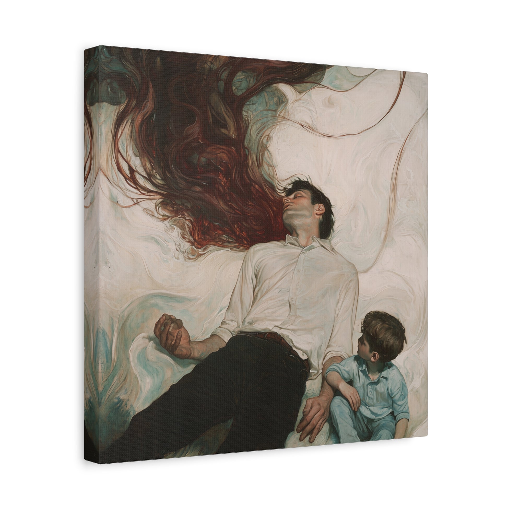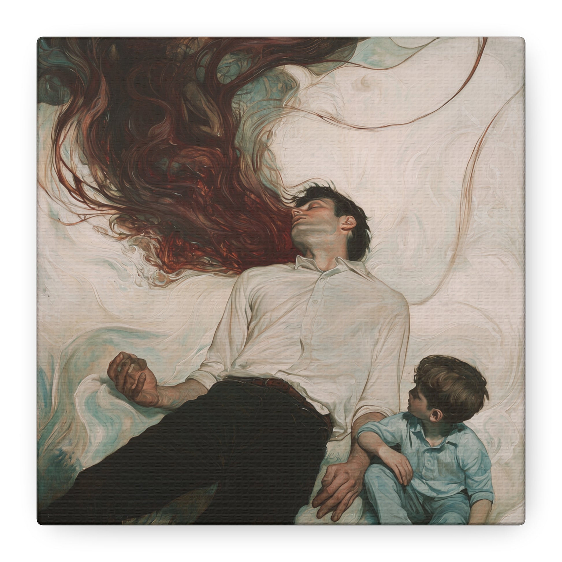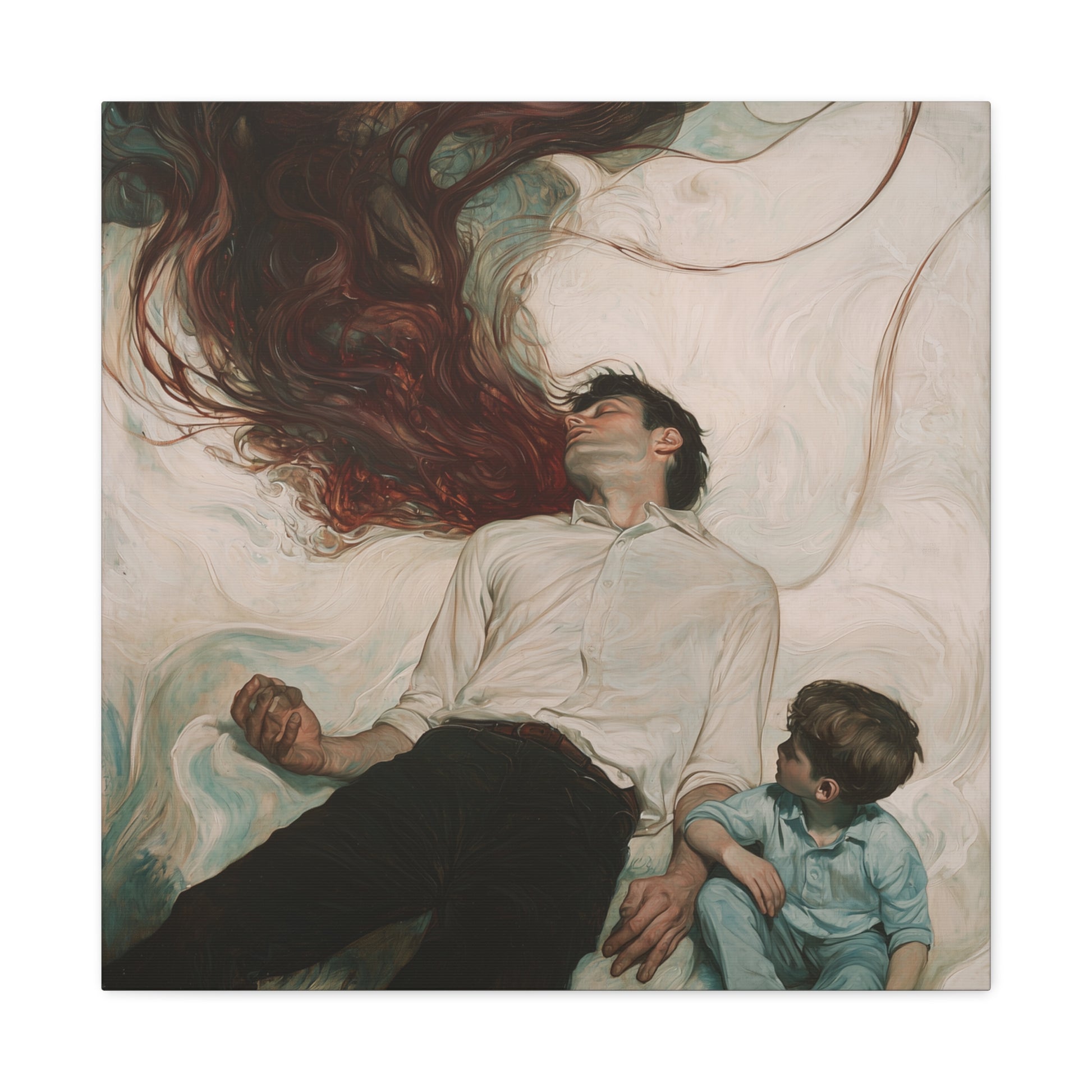 In a swirl of tender shadows, the boundary between consciousness and dreams blurs. A cascade of emotions flows between the figures, capturing an eternal bond and the mystery of unspoken connections.