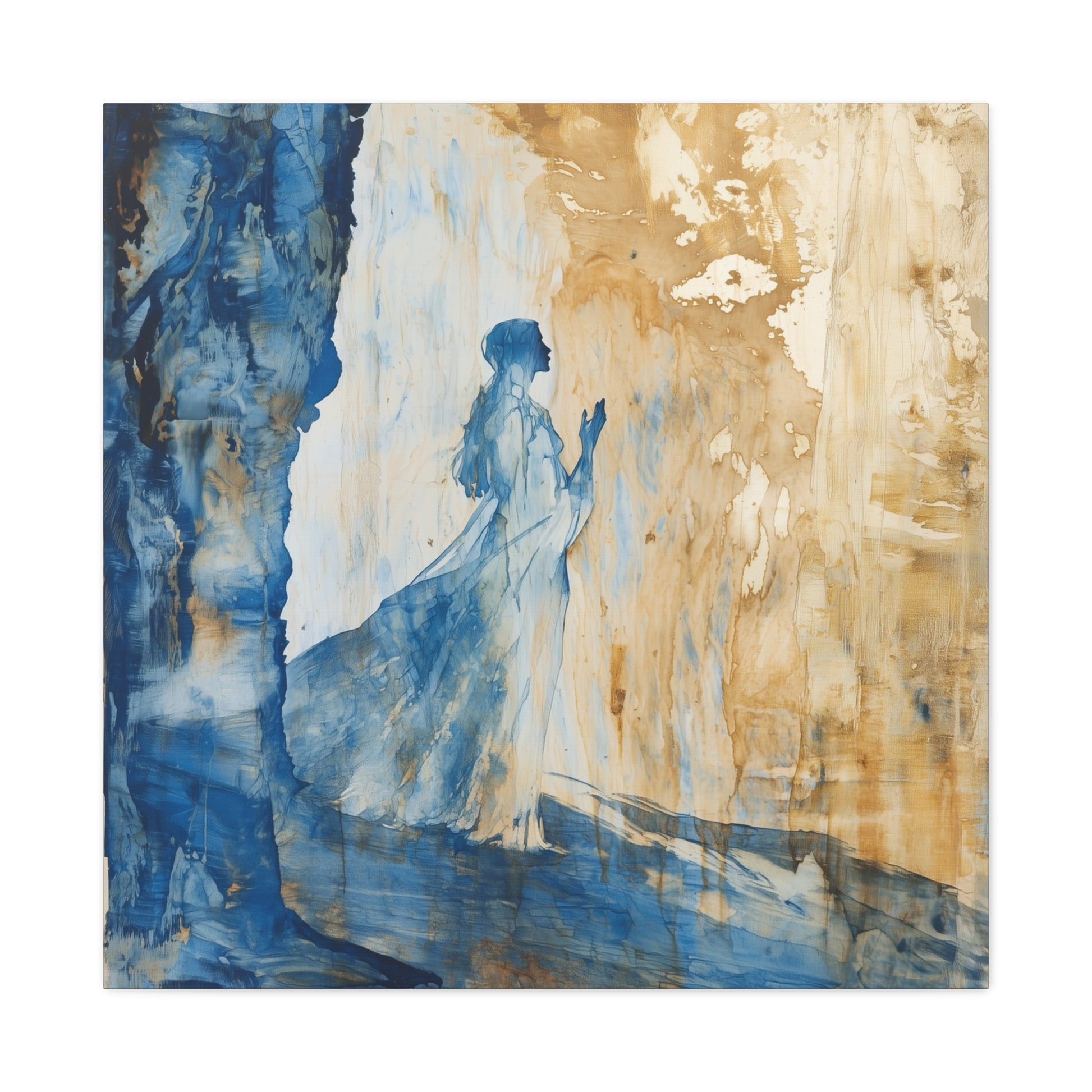 In a realm where shadows meet light, a figure stands poised between worlds. Her ethereal presence suggests an ancient dance of harmony, as whispers of gold and blue weave through the air, singing of forgotten dreams.