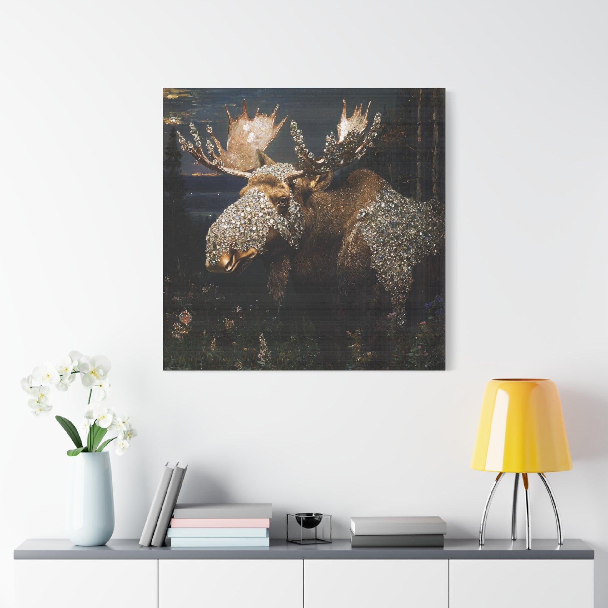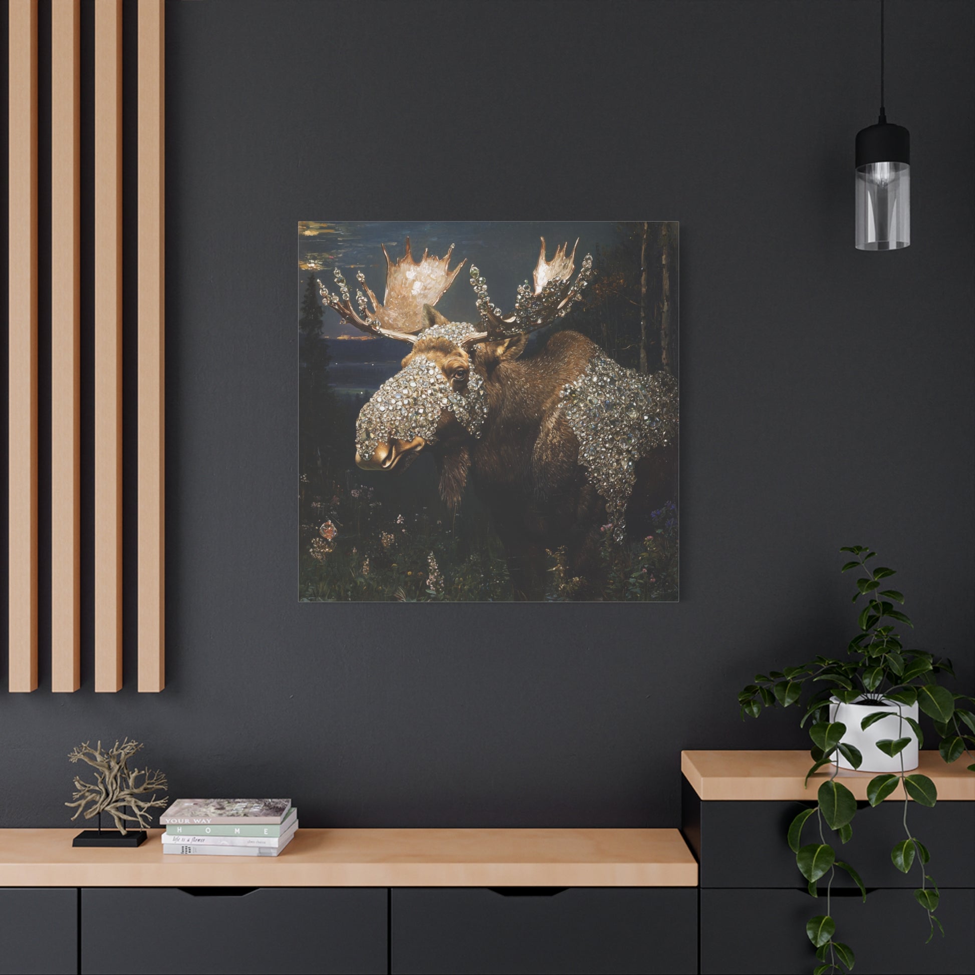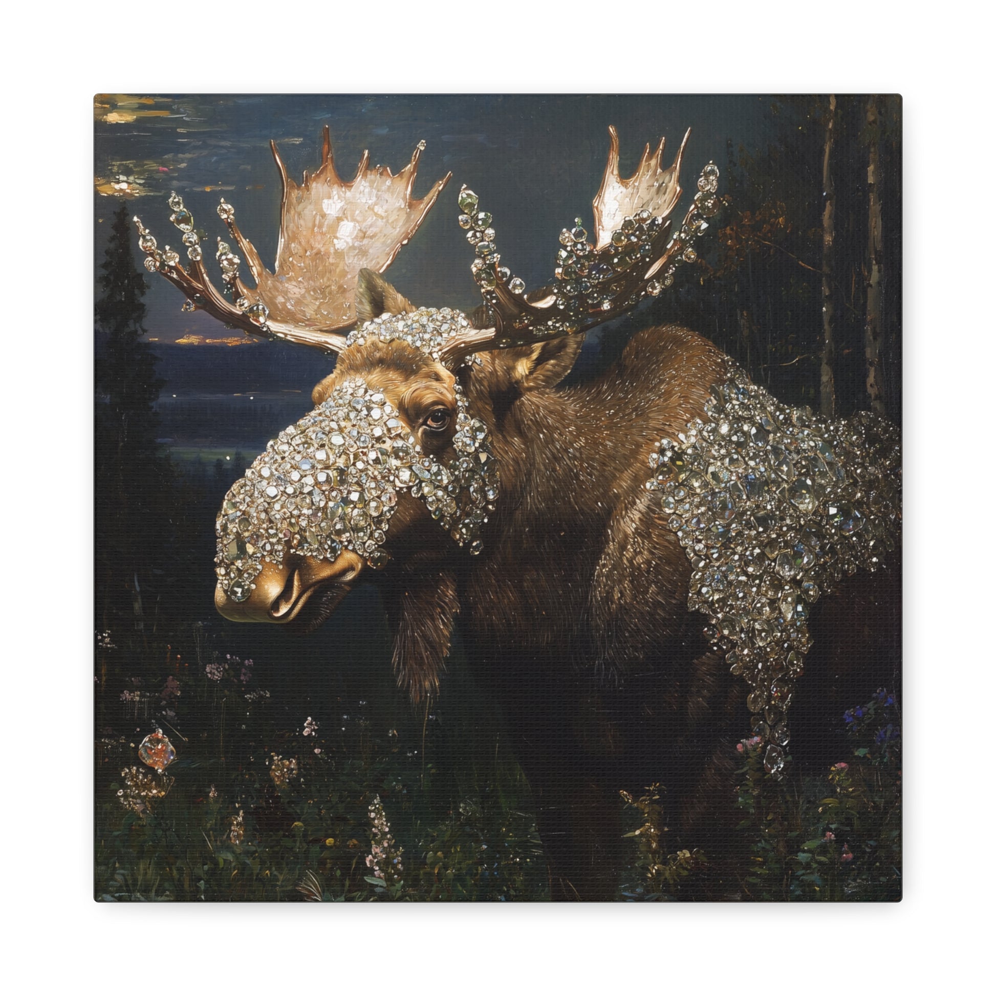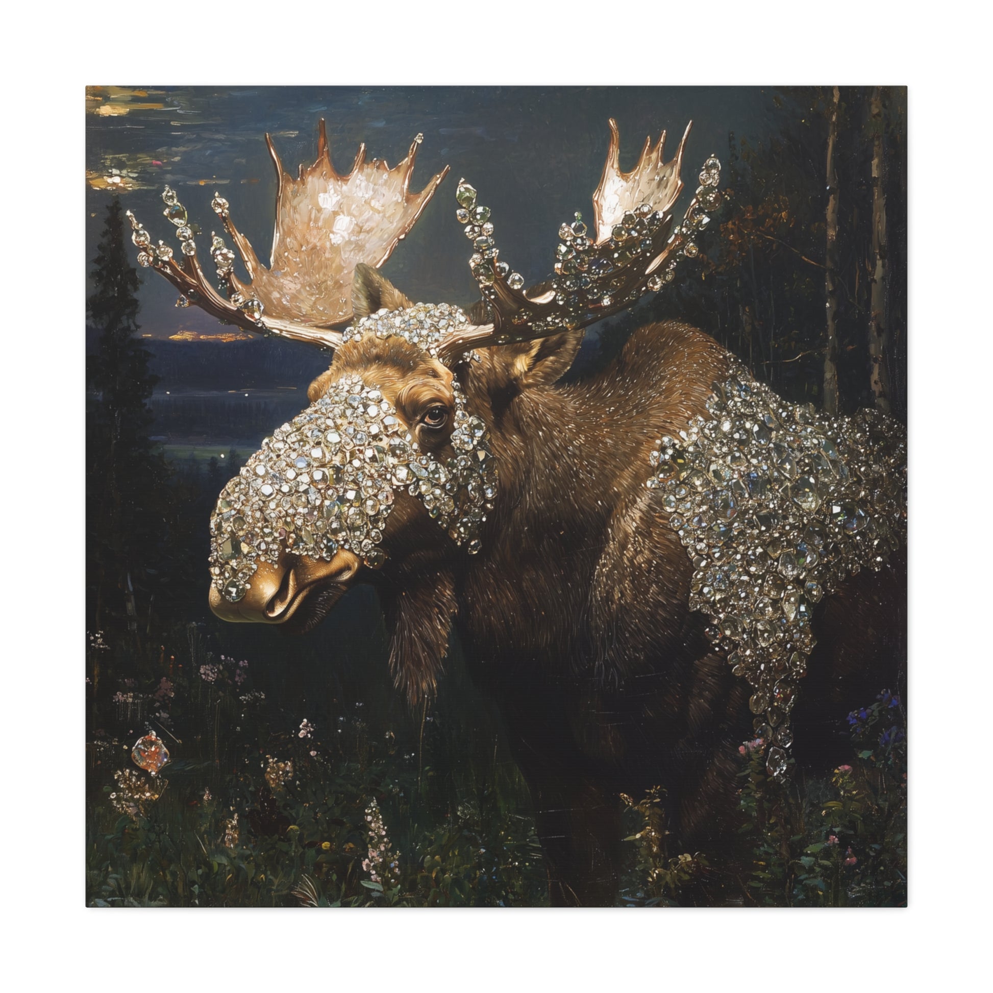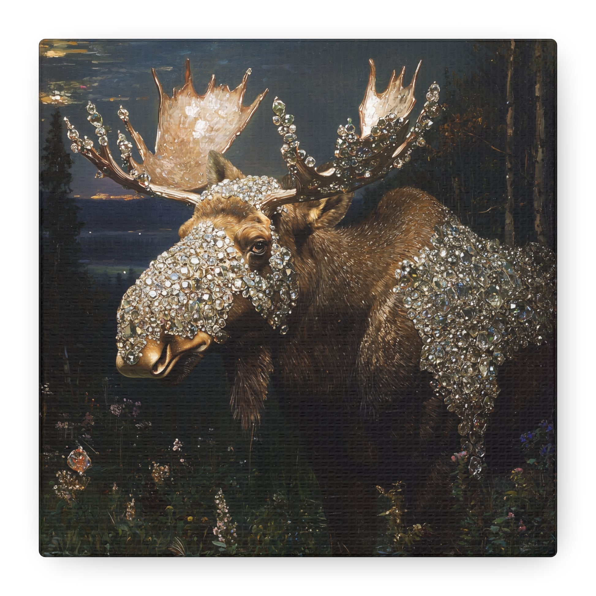 In a dusky forest, where twilight whispers secrets, a majestic moose adorned with shimmering jewels emerges. Its antlers glint like starlit crowns, bridging nature's raw beauty with ethereal elegance. An enchanting dance of light and shadow unfolds.