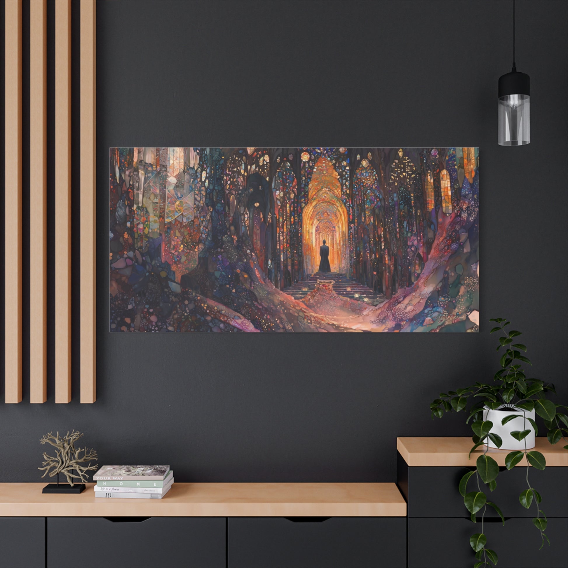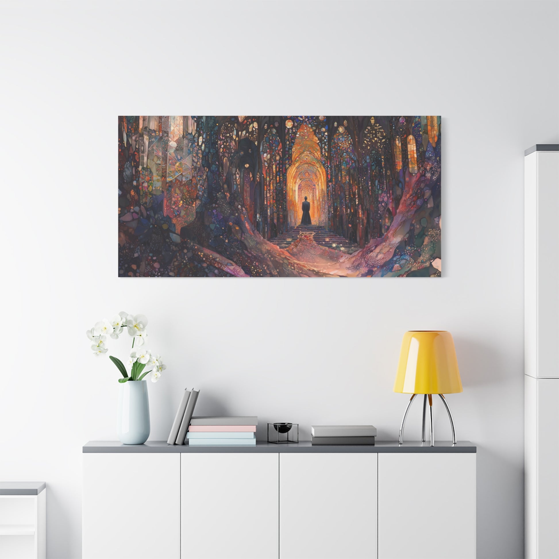 Bathed in a kaleidoscope of colors, the lone figure ascends the ethereal staircase, each step echoing with the whispers of ancient secrets. A luminous glow beckons, inviting the soul to journey into the heart of mystery.