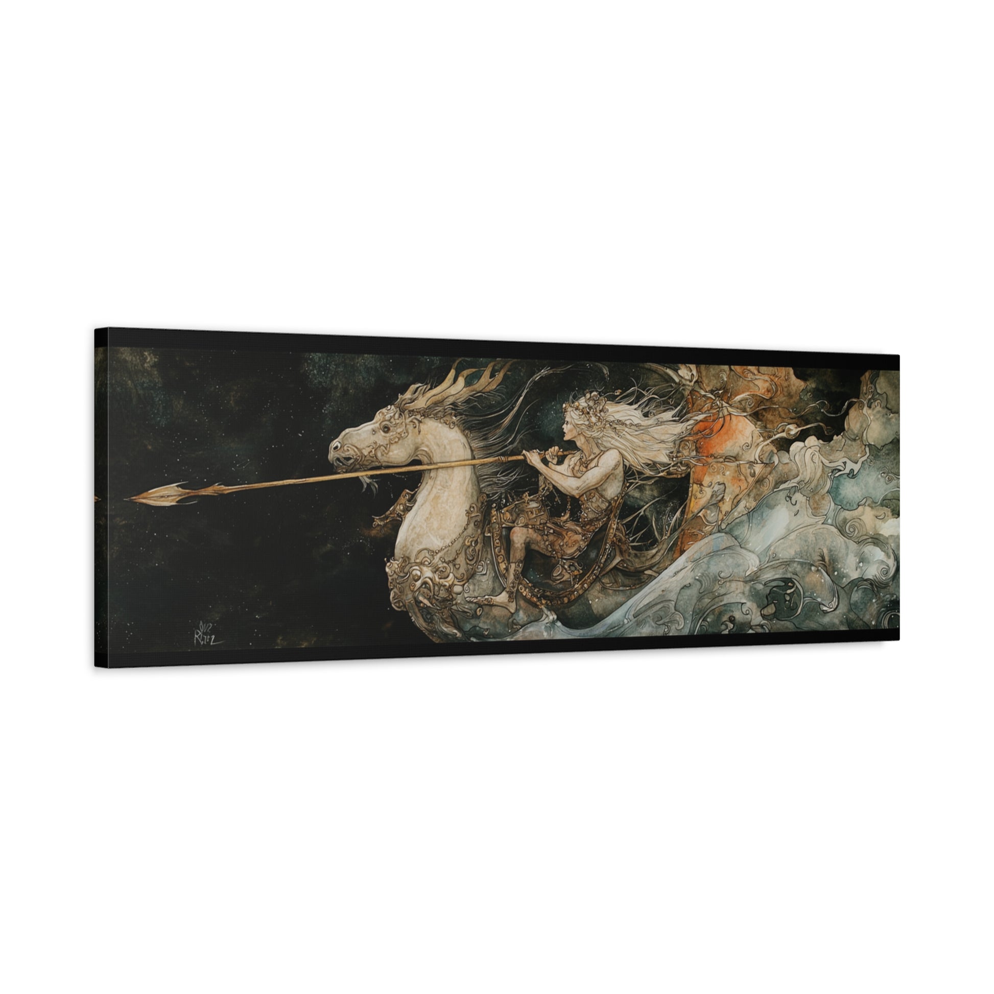In a cosmic dance of light and shadow, the rider gallops through the celestial tapestry, weaving dreams into reality. The air crackles with ancient whispers, as destiny unfurls beneath shimmering stars.