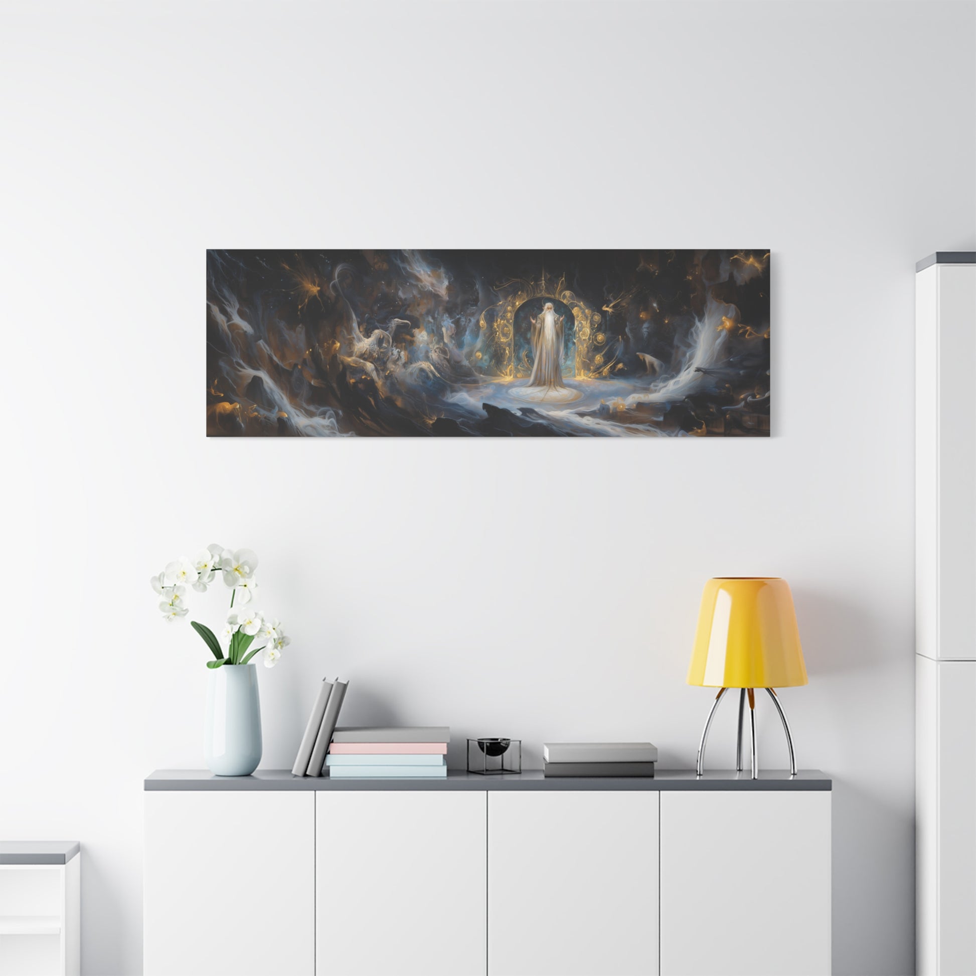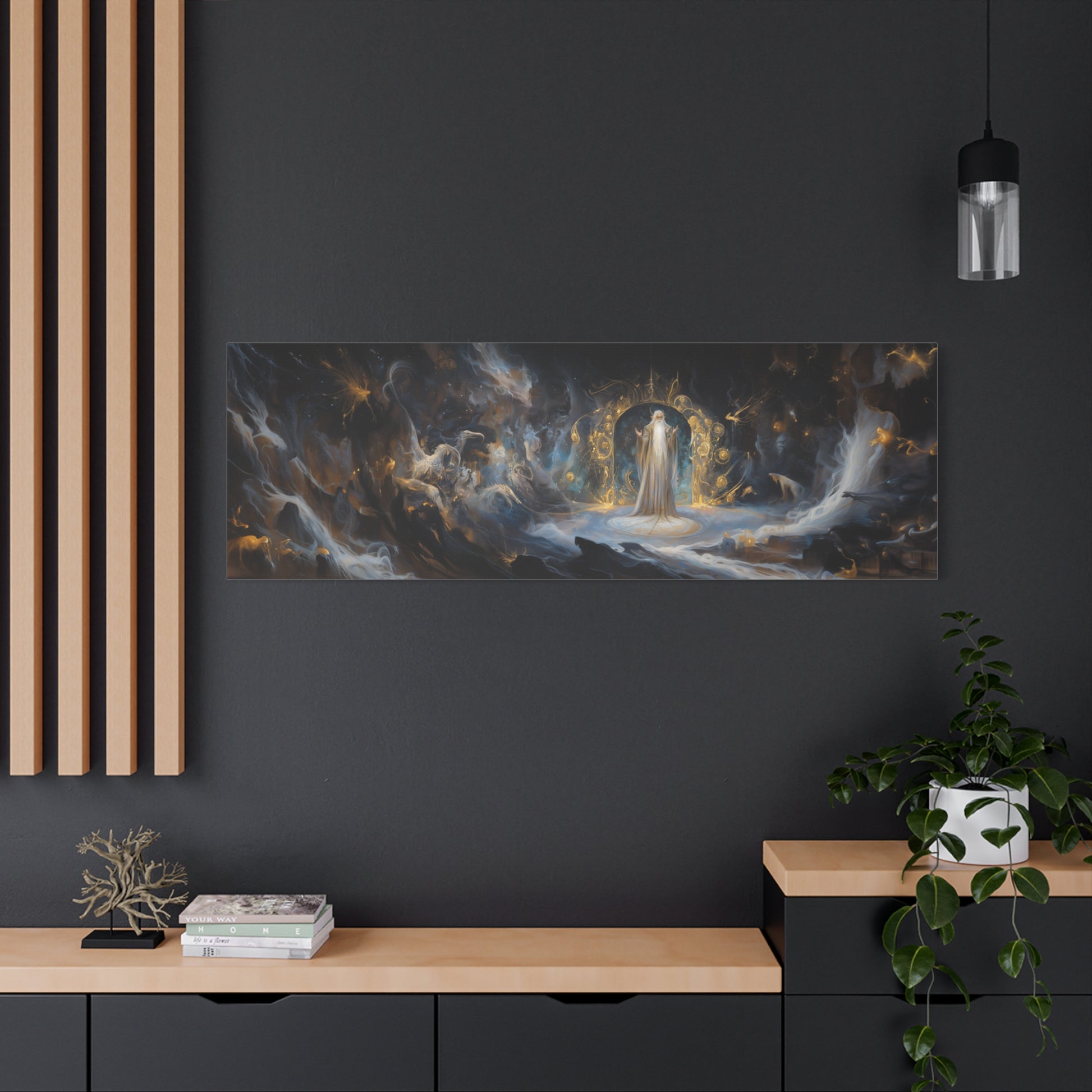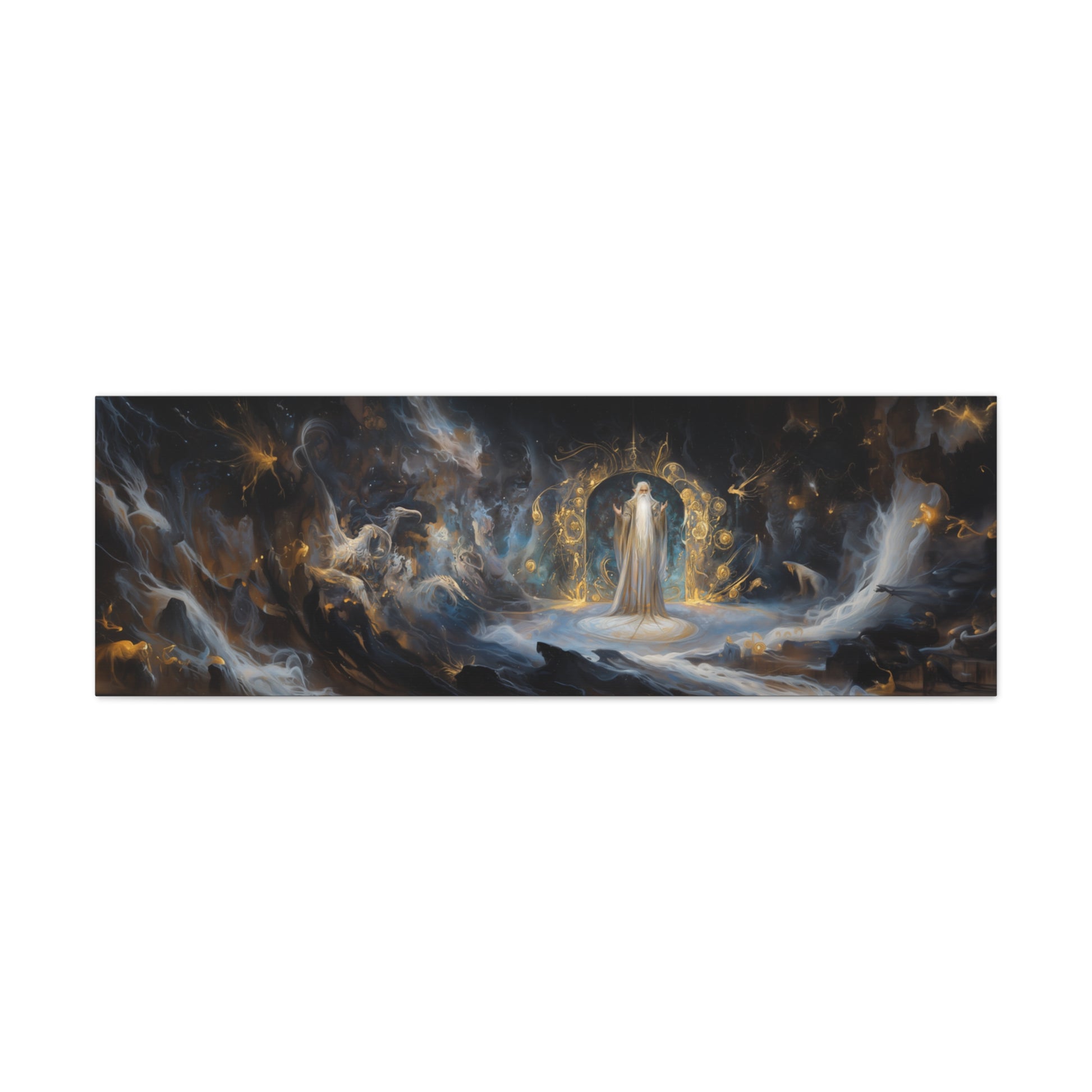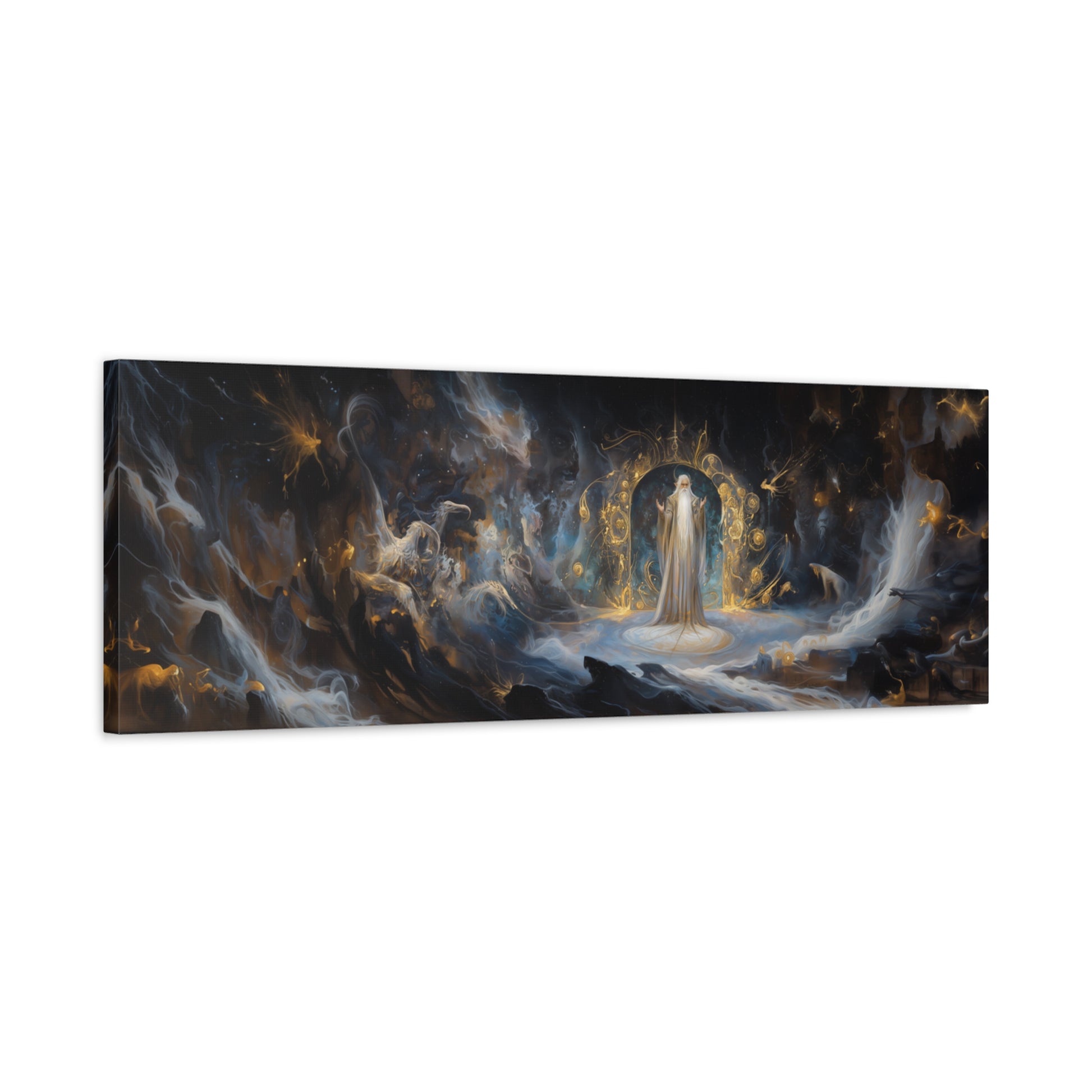 A celestial figure stands at the threshold of infinity, where swirling mists and golden tendrils weave a tapestry of dreams. The scene invites contemplation of the unknown, a cosmic dance between light and shadow.