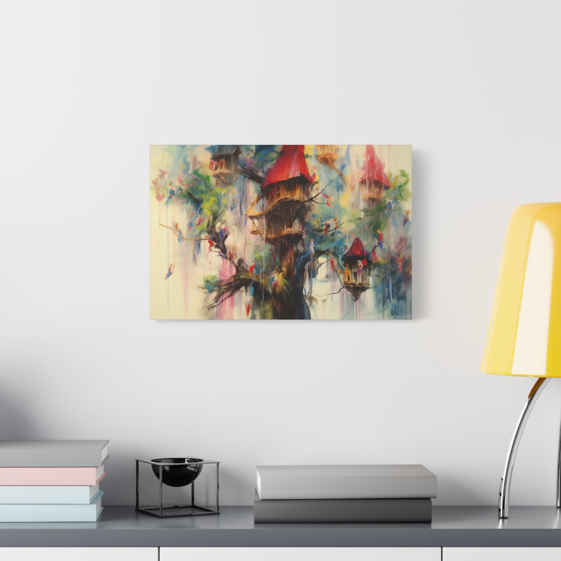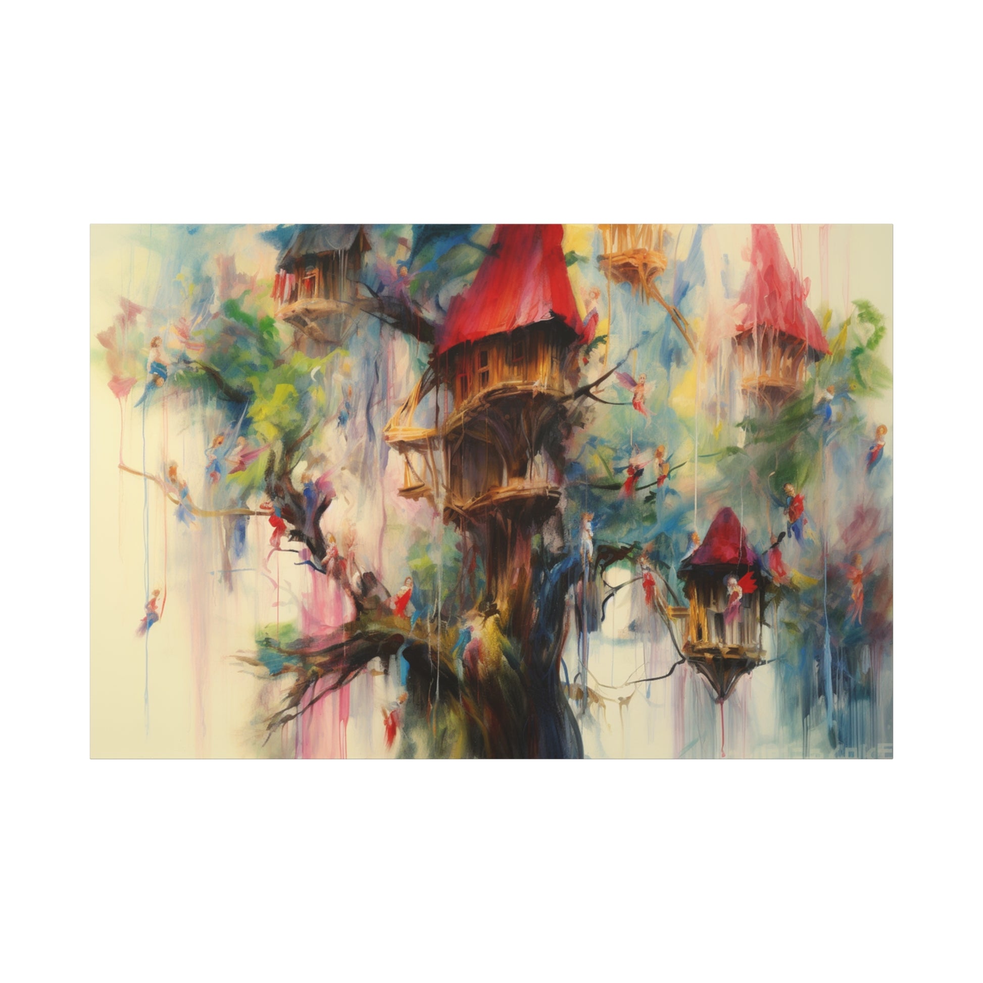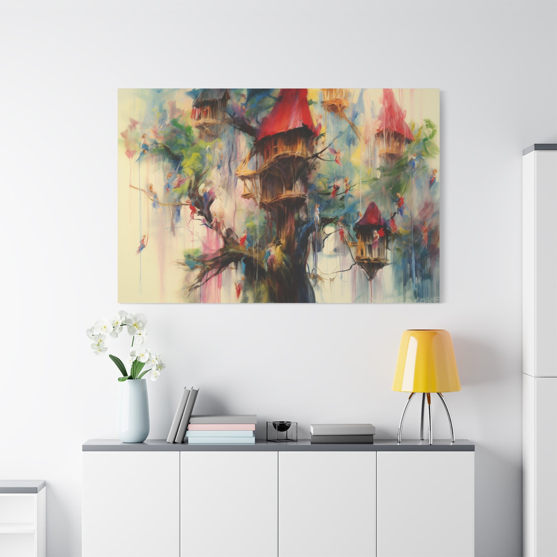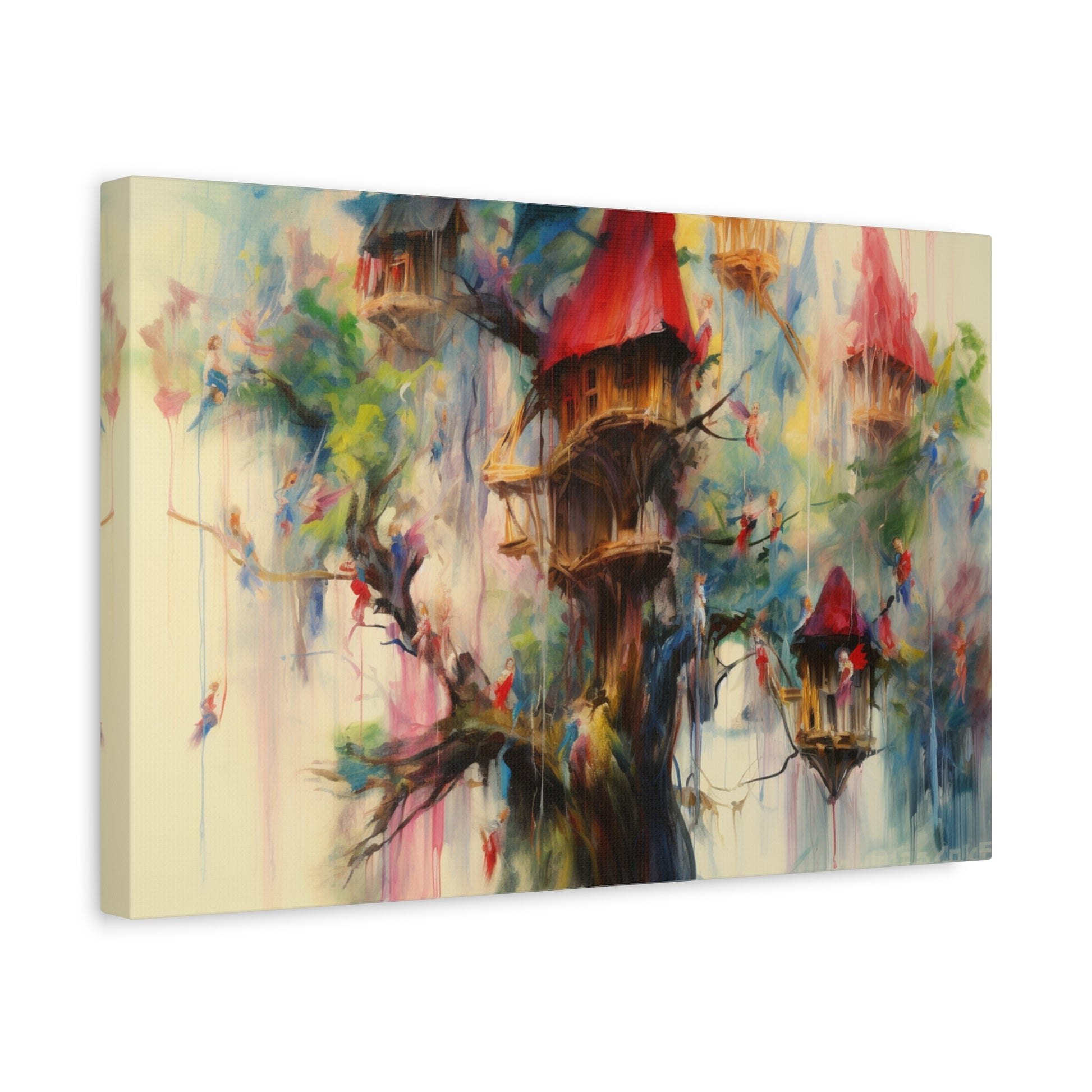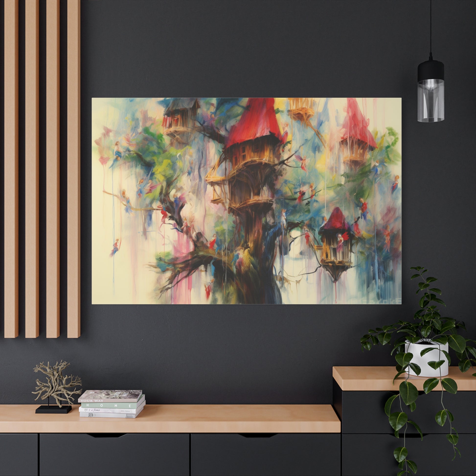 High above the forest floor, vibrant havens nestle in ancient branches, where the air hums with the laughter of unseen beings. A dreamscape unfolds, inviting imaginations to wander among the treetop sanctuaries.