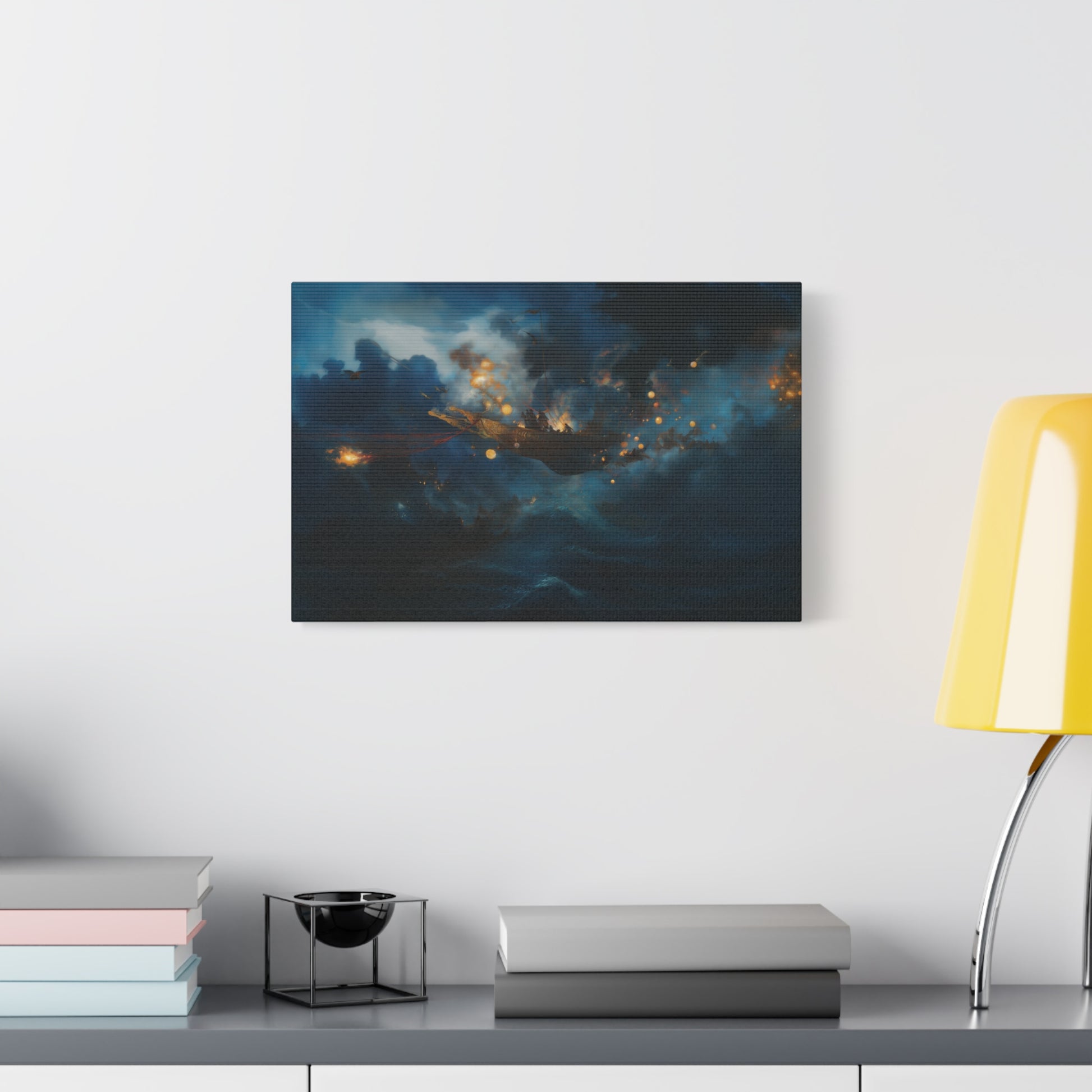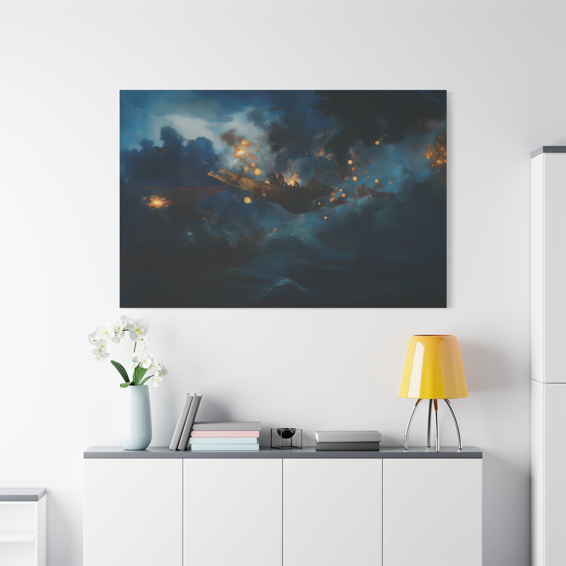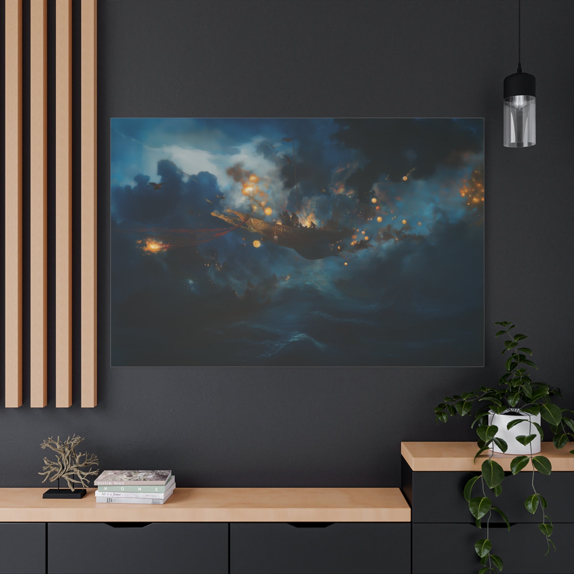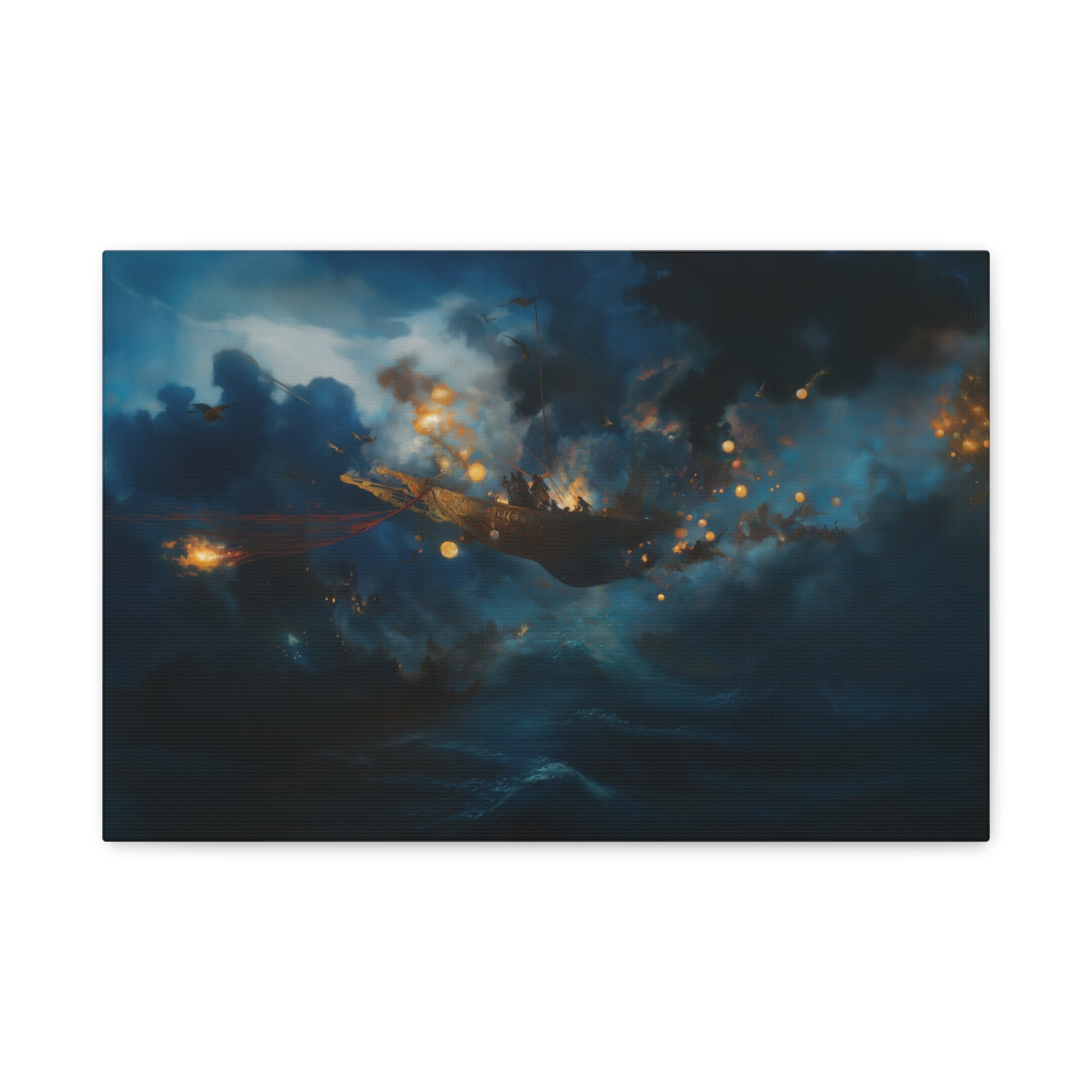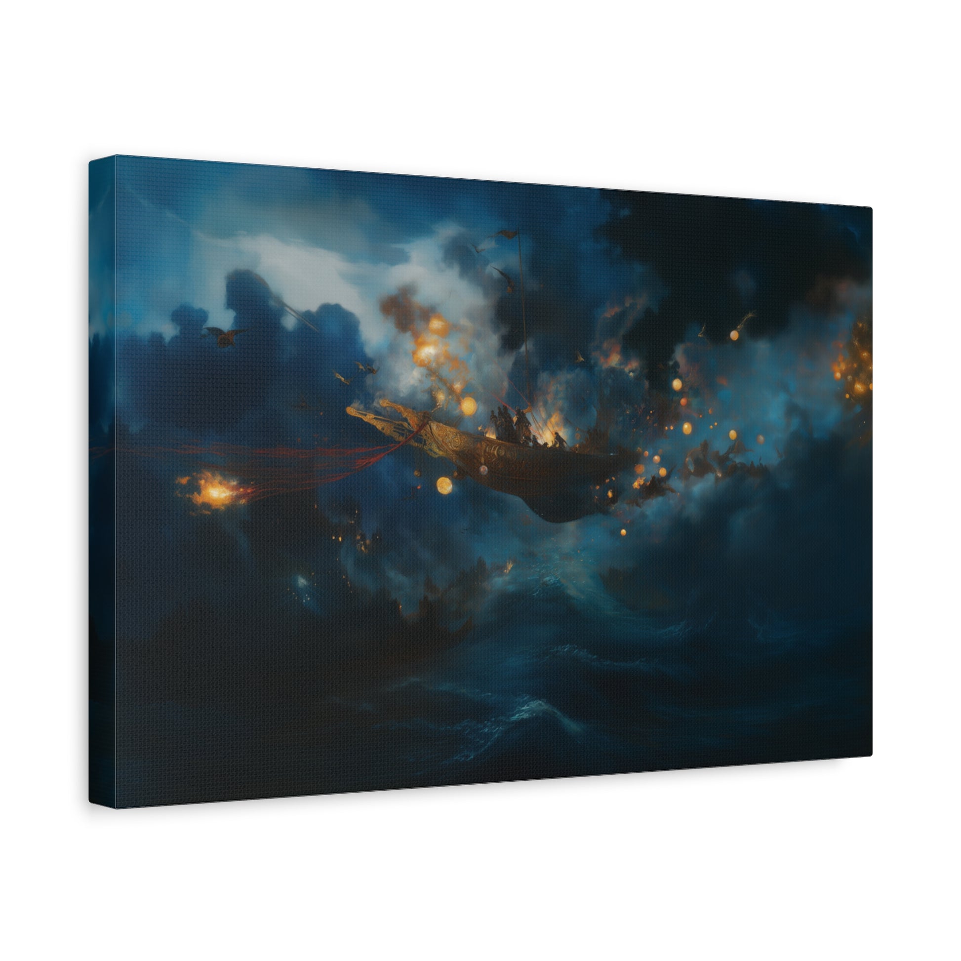 A ship sails the night sky, weaving through clouds and starlit whispers. Lanterns flicker like distant dreams, guiding through the cosmic turmoil. It’s a journey of wonder and courage, where skies meet the unknown.