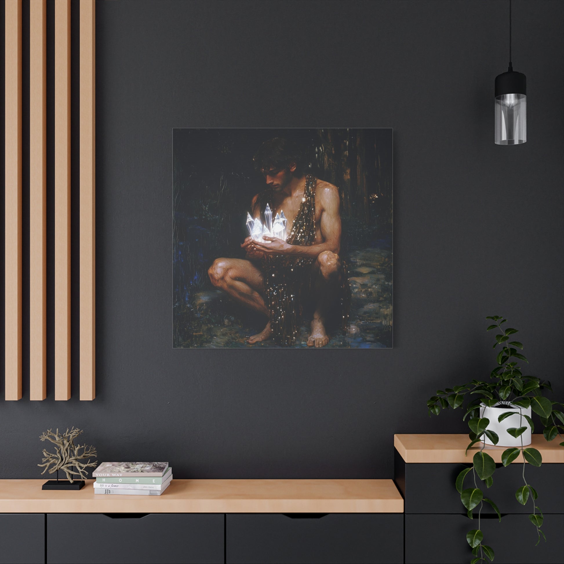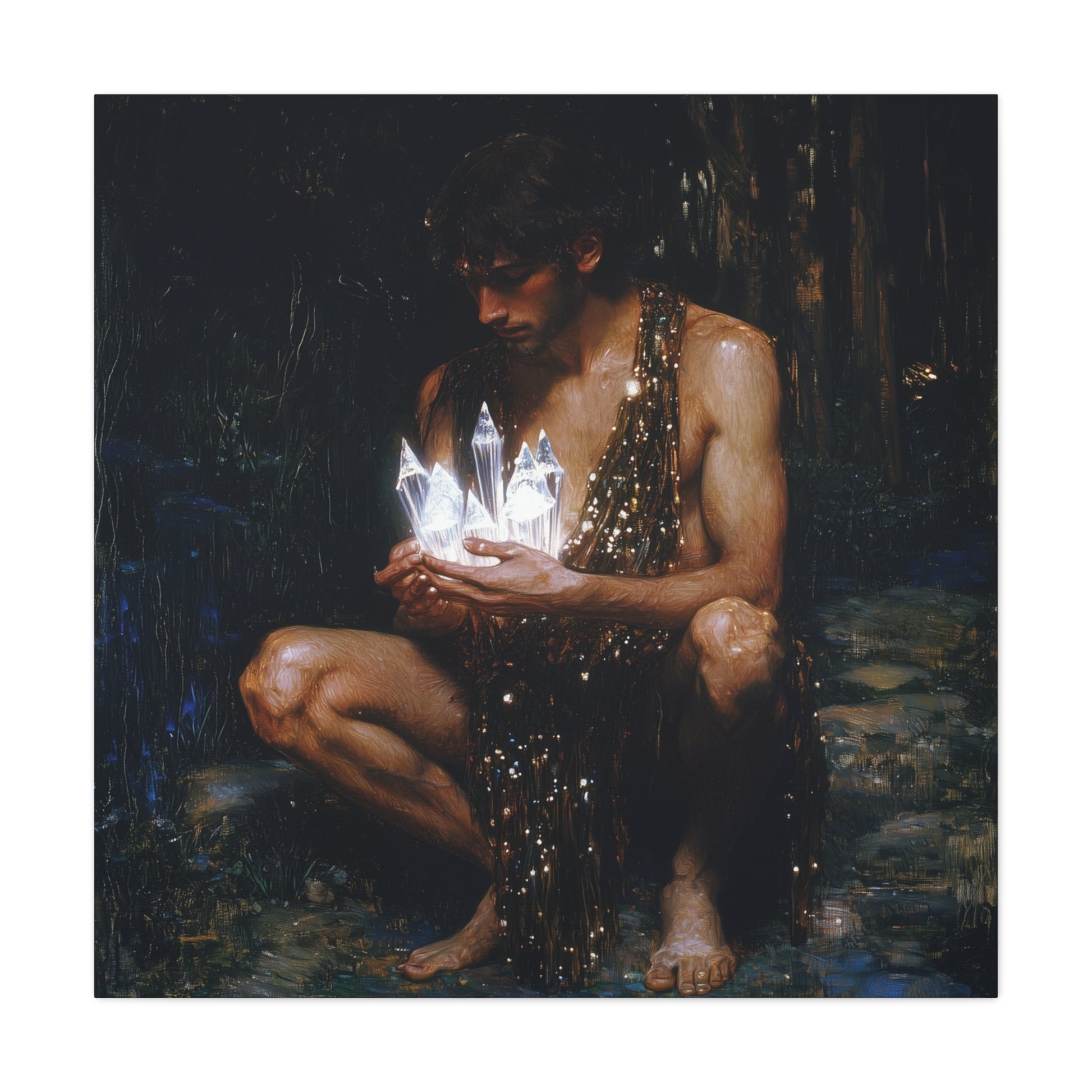 In a realm where shadows and light dance, he cradles ethereal crystals, embodying the delicate balance between mystery and revelation. Each shard pulses with stories untold, a silent symphony of luminescent wonder.