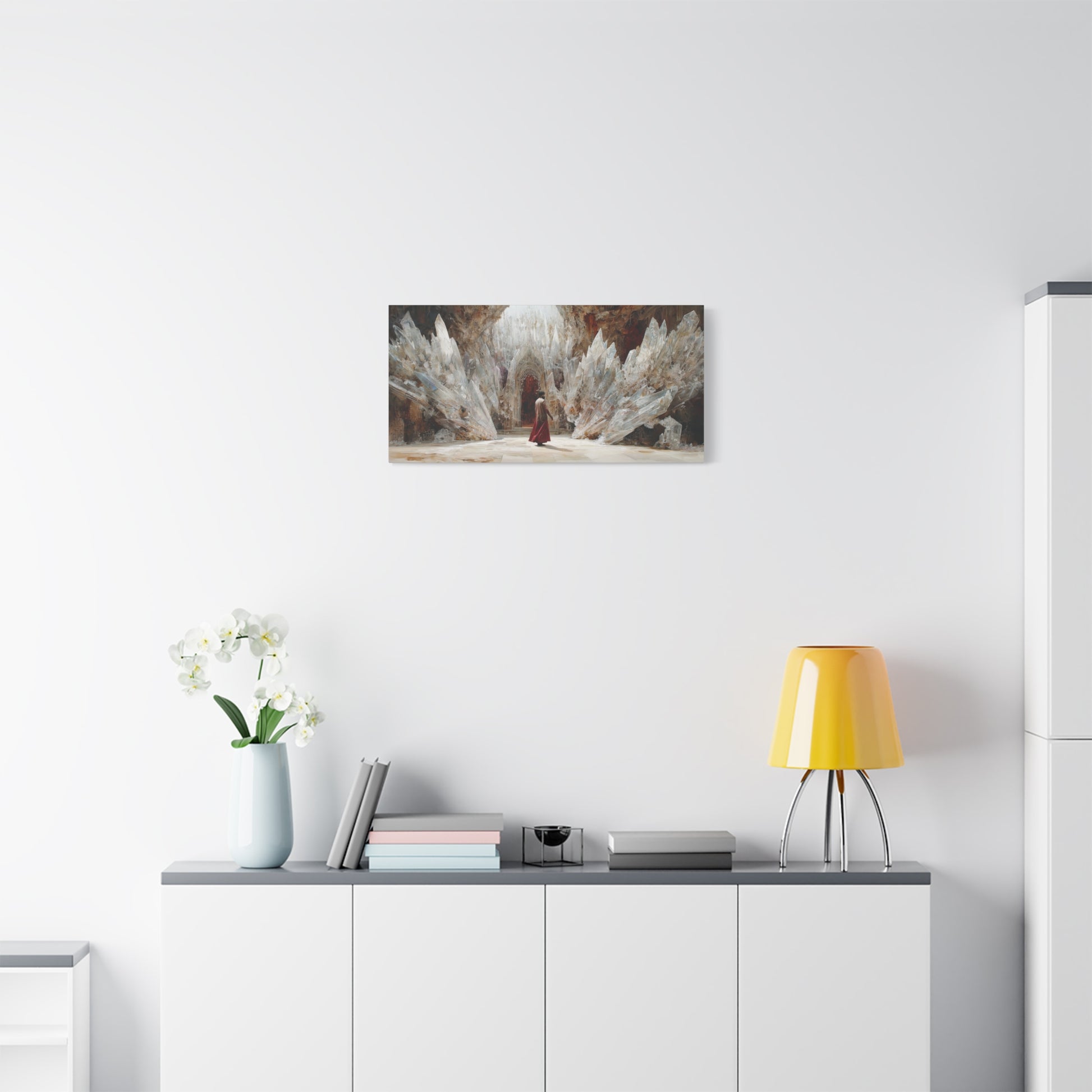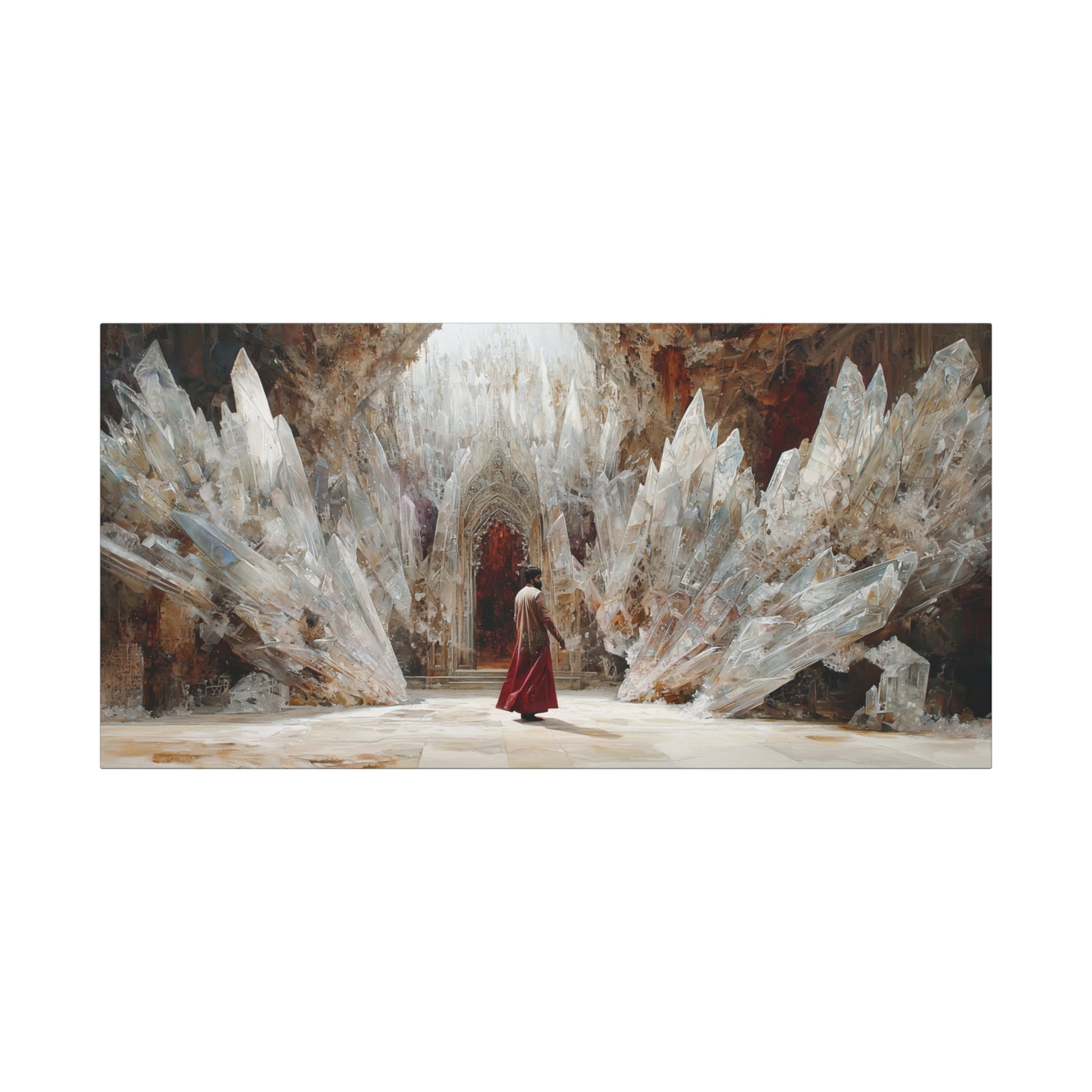 Amidst towering shards of light, a solitary figure journeys through a crystalline cathedral, where whispers of ancient tales echo silently. The air shimmers with a fragile beauty, inviting contemplation and awe.