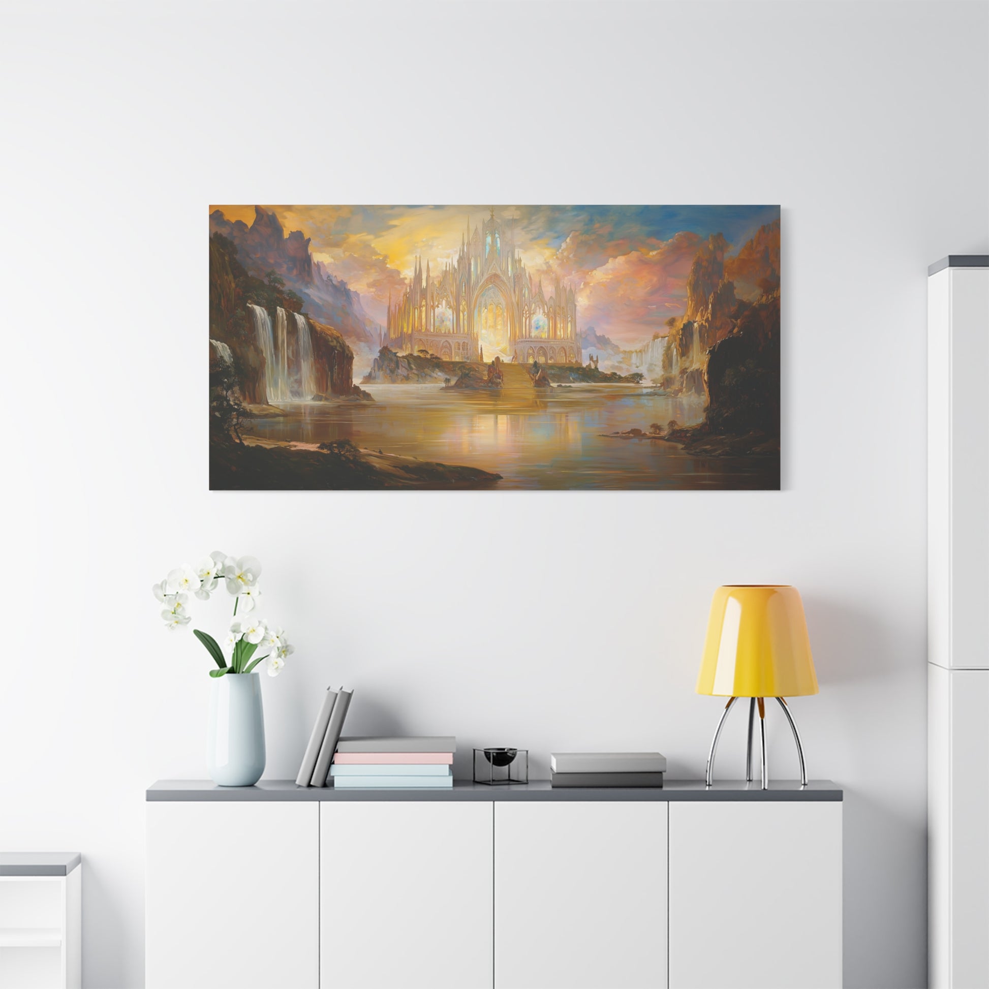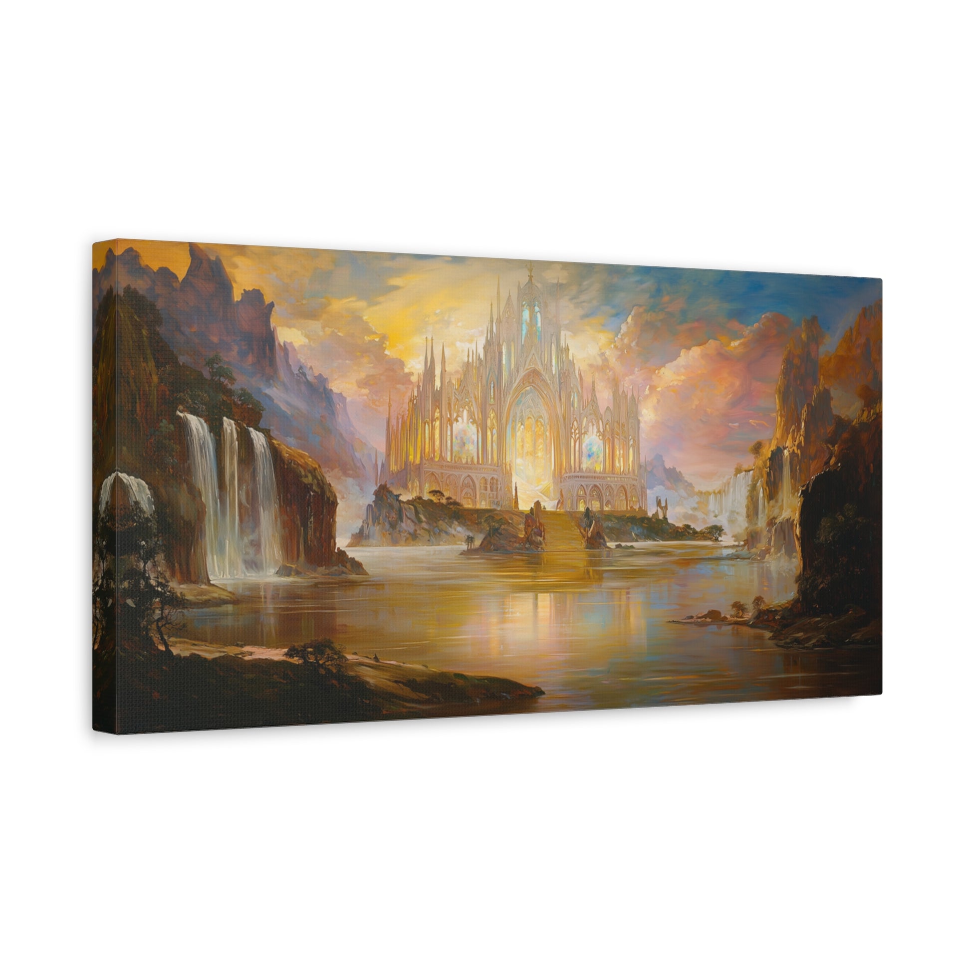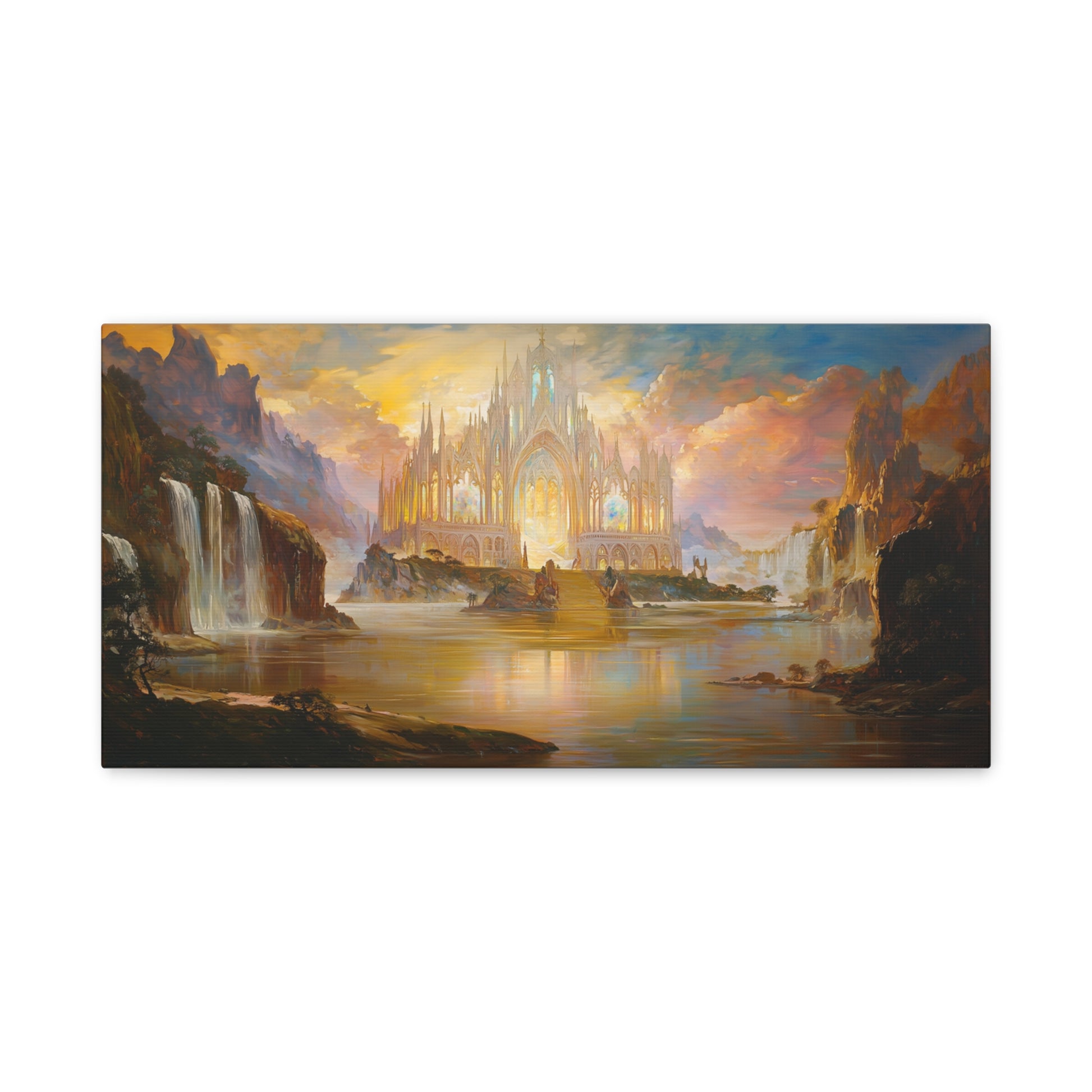 Bathed in golden light, a majestic structure rises like a celestial hymn, echoing through the tranquil embrace of an enchanted landscape. This ethereal sanctuary beckons the soul toward a realm of wonder and peace.