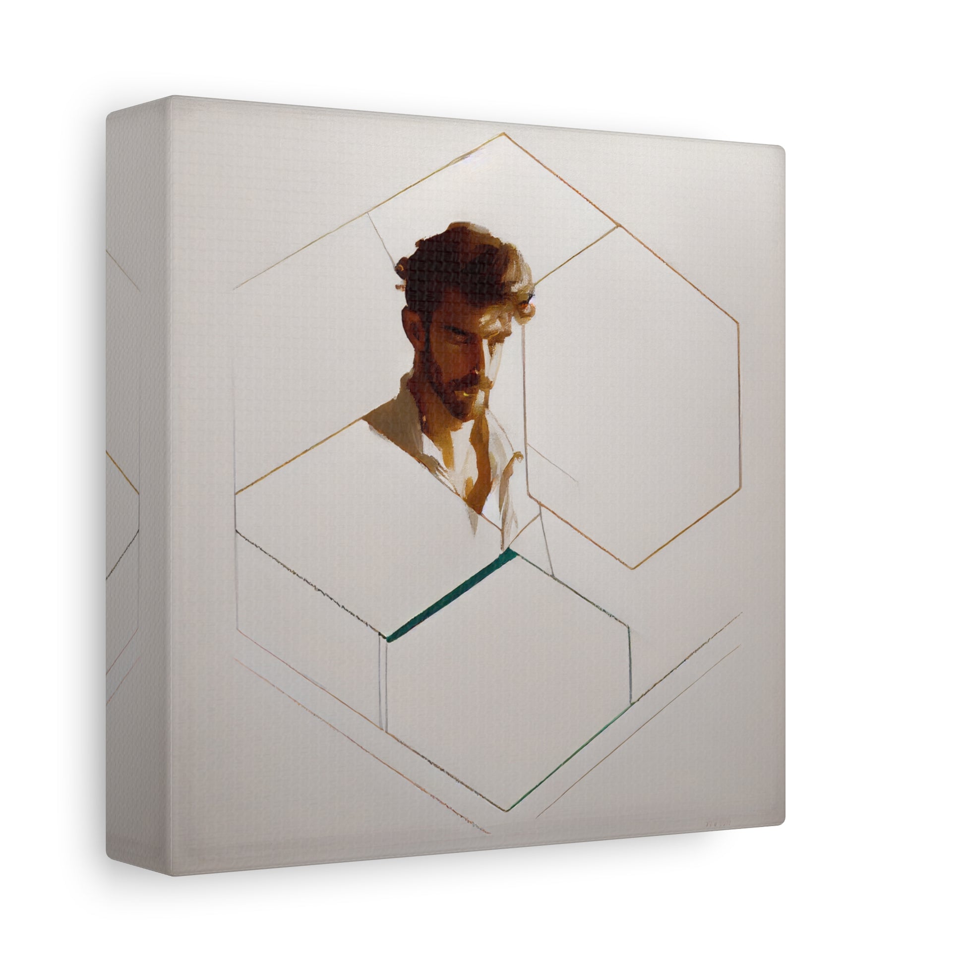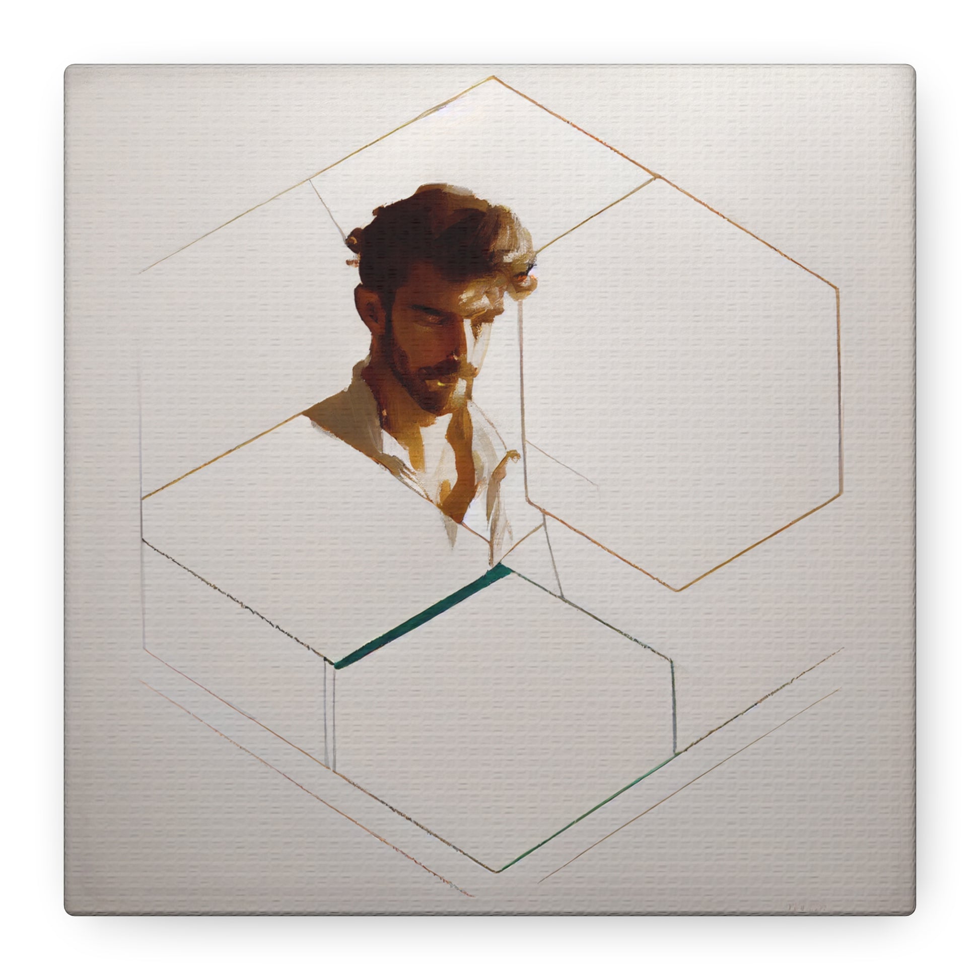 Within the geometric embrace, a solitary figure drifts through realms of introspection. Lines and voids intertwine, weaving a tapestry of solitude and reflection, where silence speaks and shadows reveal hidden truths.