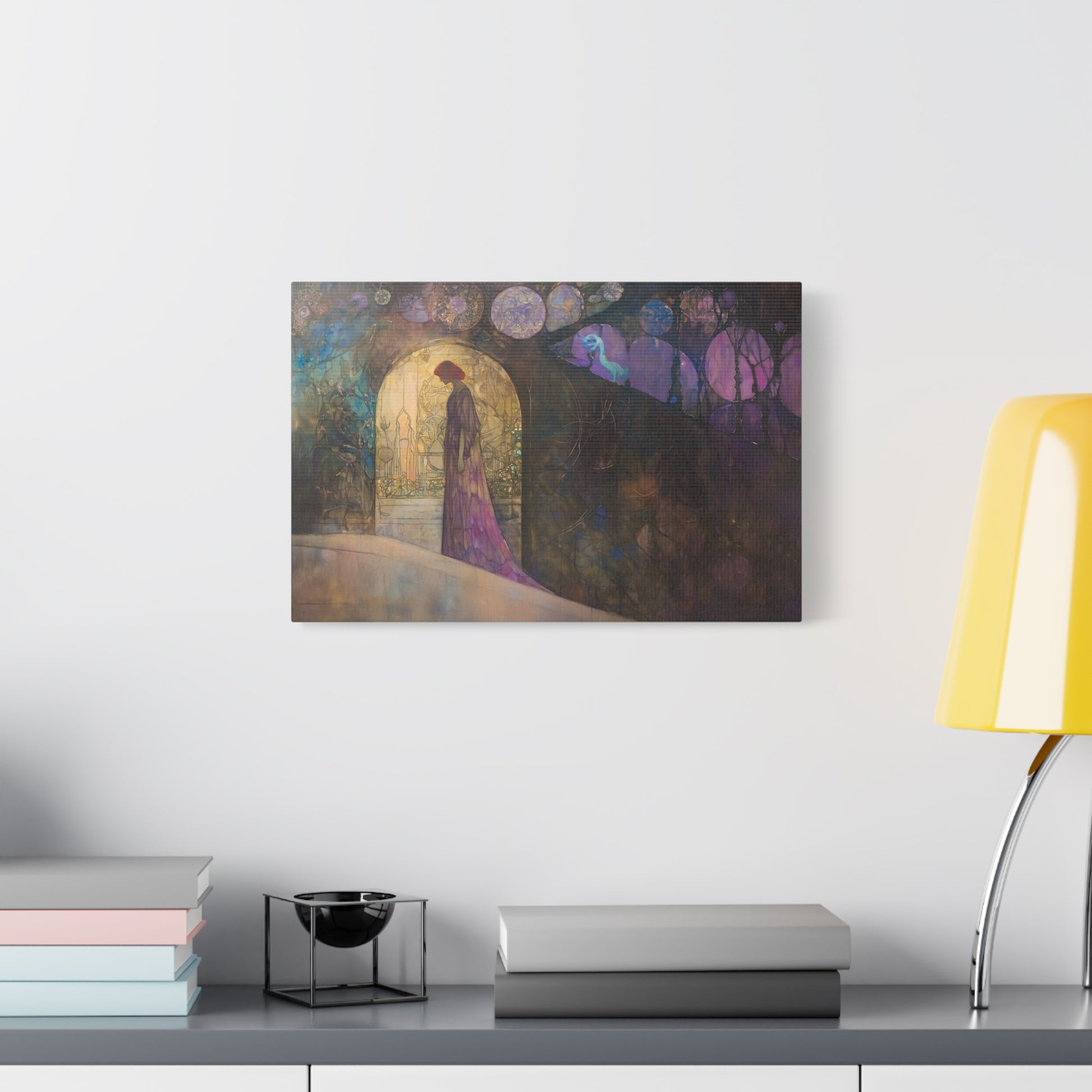 A figure stands at the threshold, draped in twilight hues, as ethereal light spills from the archway. Mysteries linger in the shadows, inviting contemplation and wonder, as if time itself pauses to breathe.