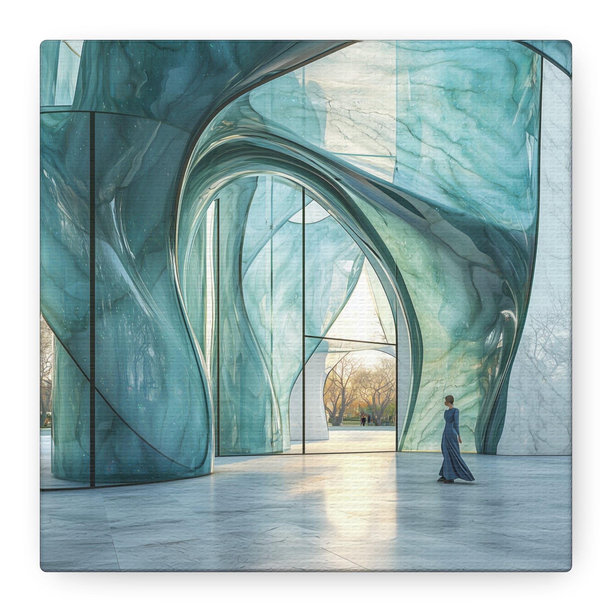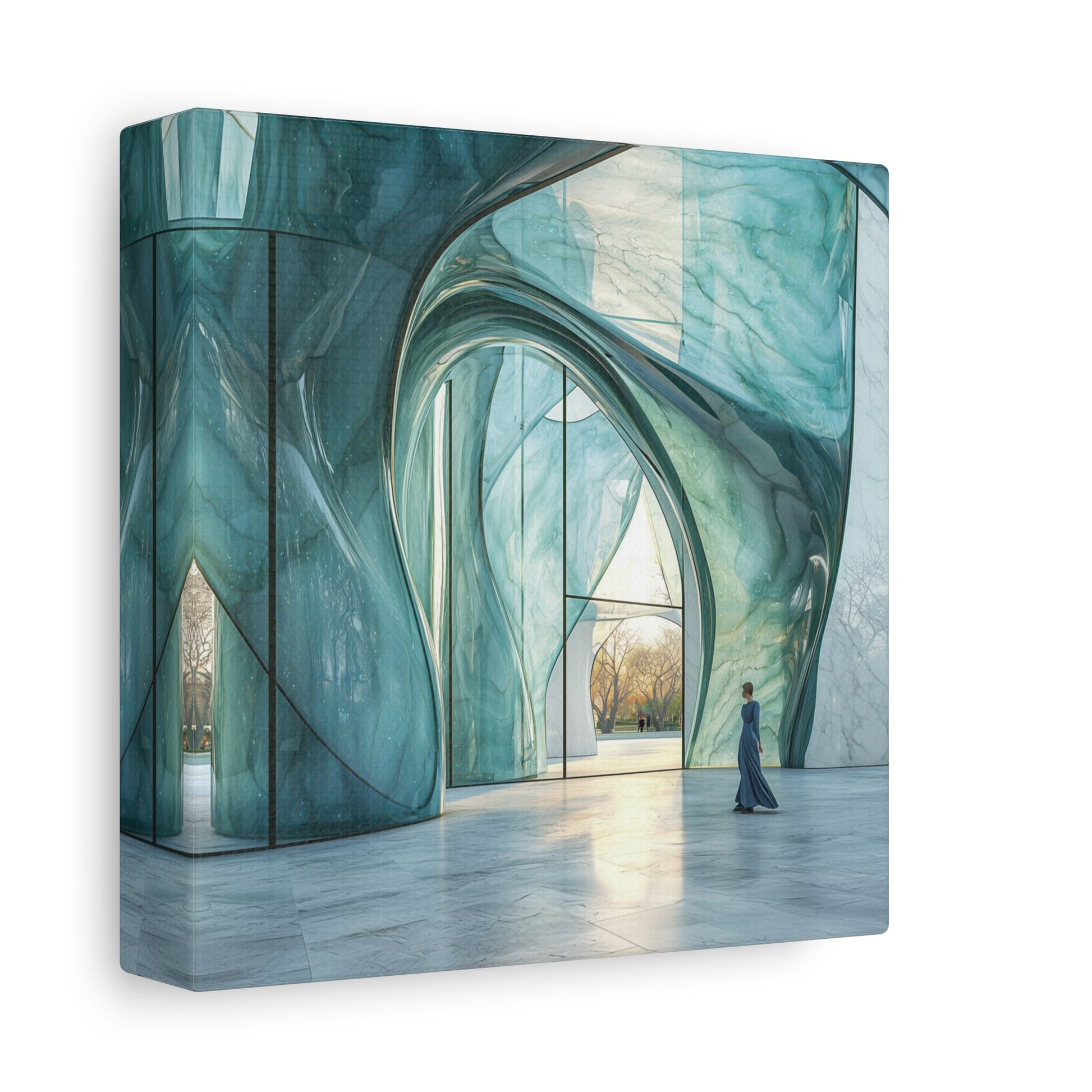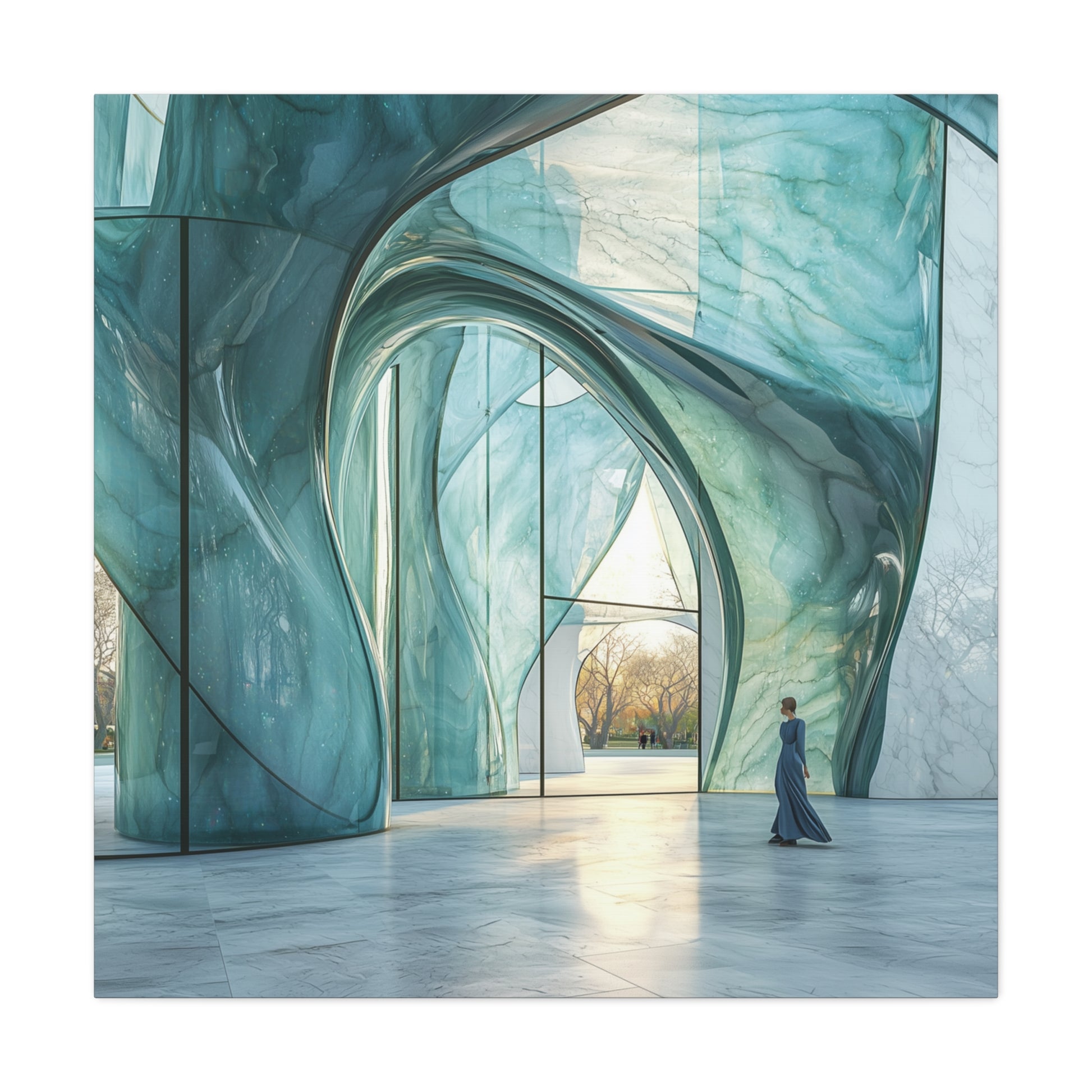 Translucent waves of azure and emerald rise like ancient whispers, guiding the solitary wanderer towards a luminous horizon. This sanctuary of light and glass beckons with promises of discovery and deep serenity.