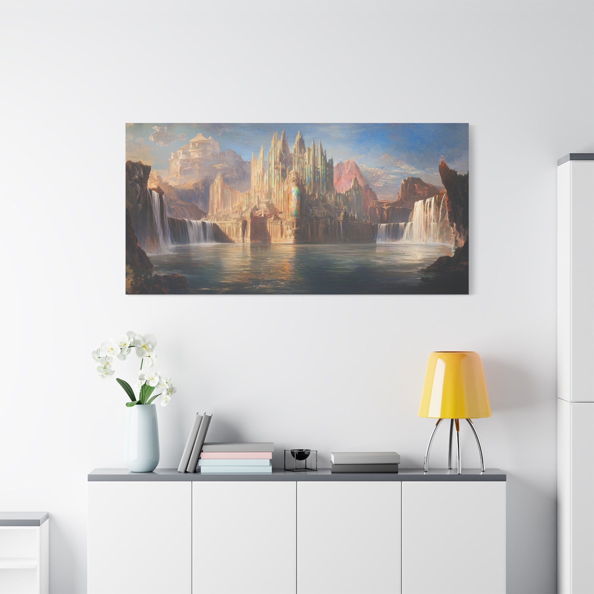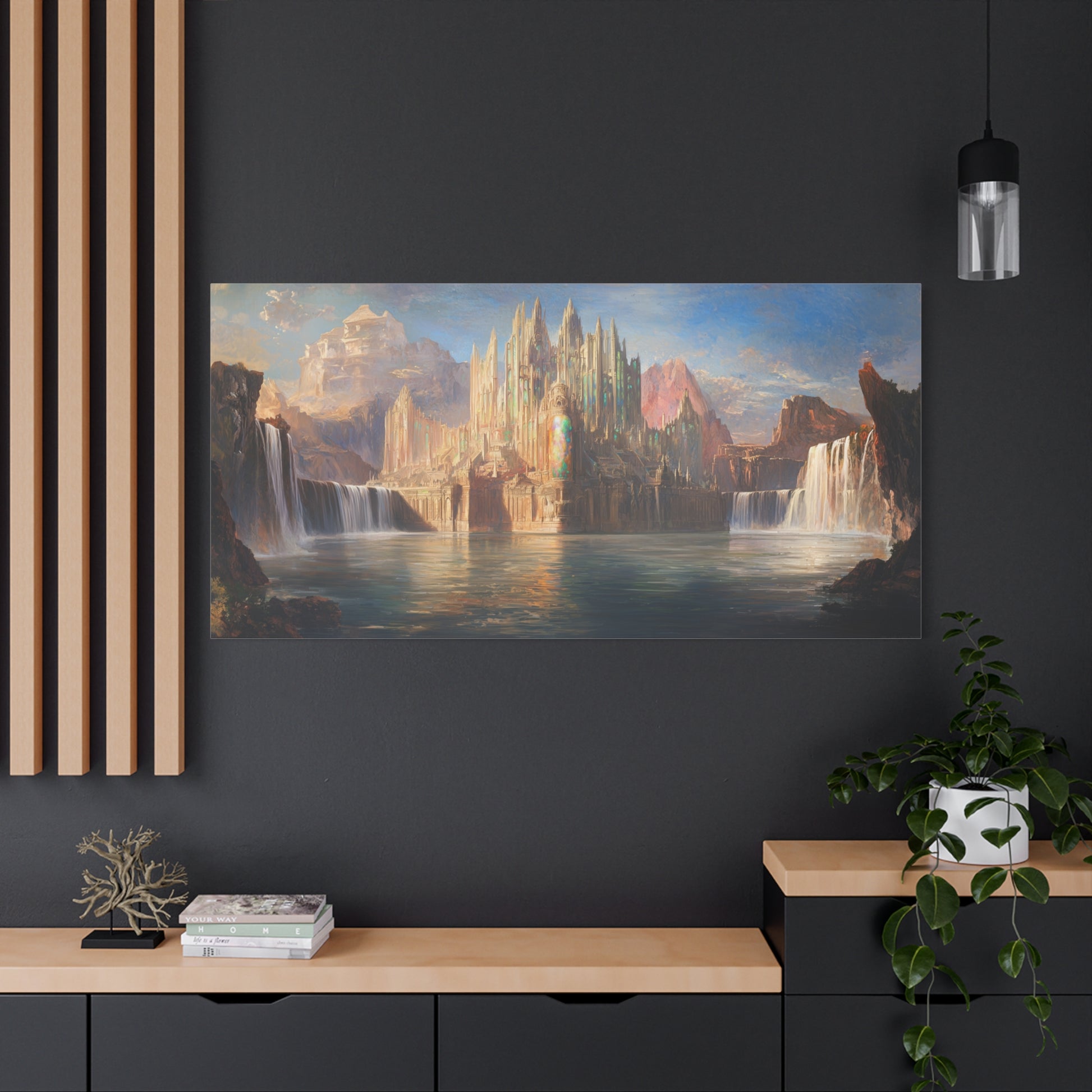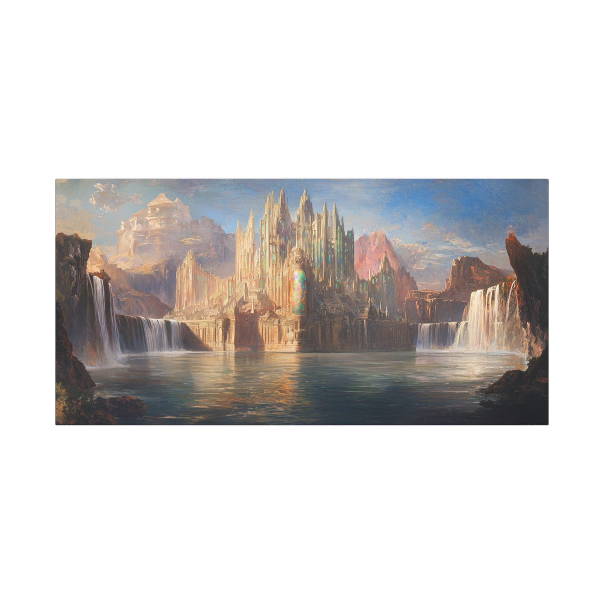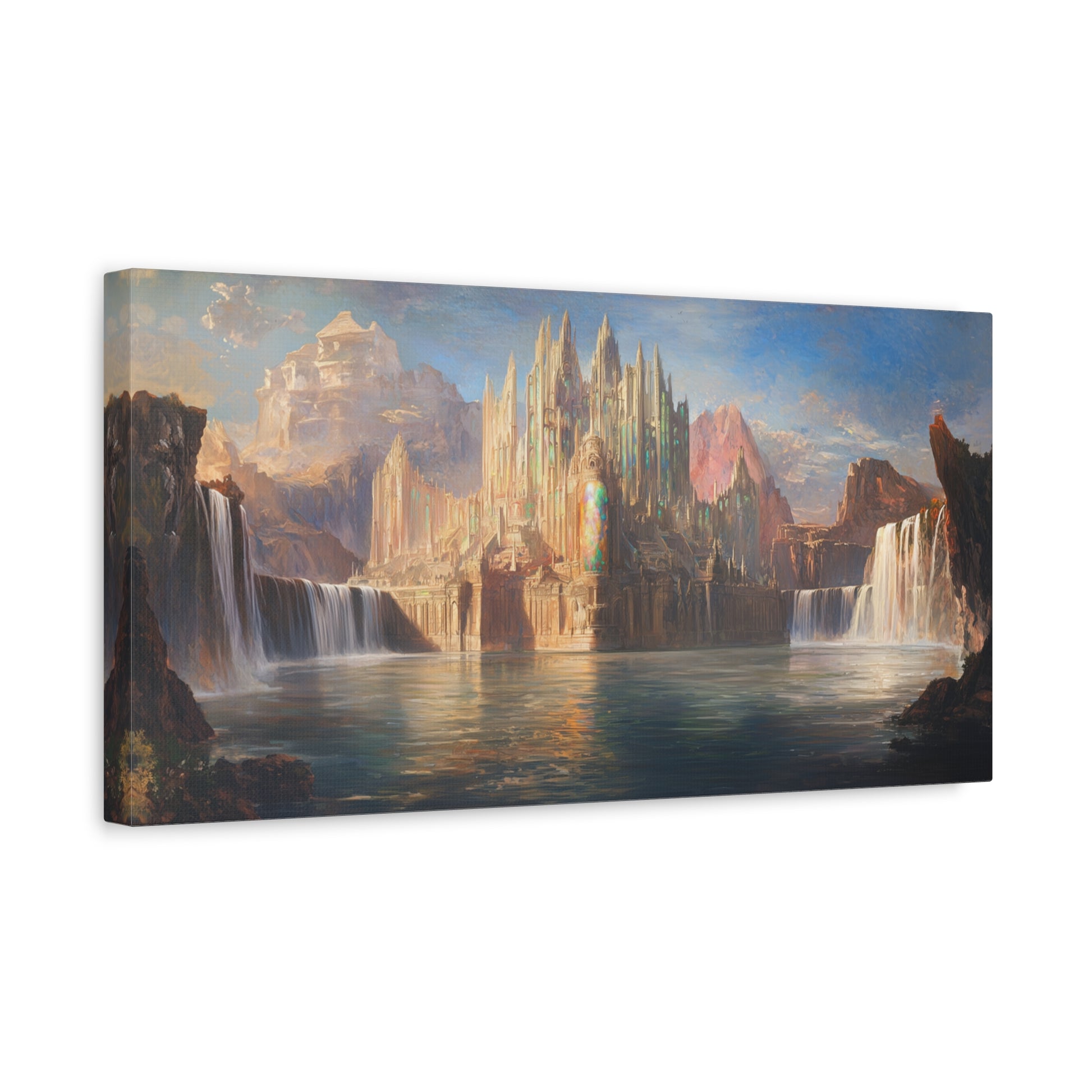 The ethereal fortress rises from the shimmering waters, its spires catching the whispers of forgotten ages. Cascading waterfalls guard its secrets, inviting the soul to wander through its timeless grandeur and find solace.