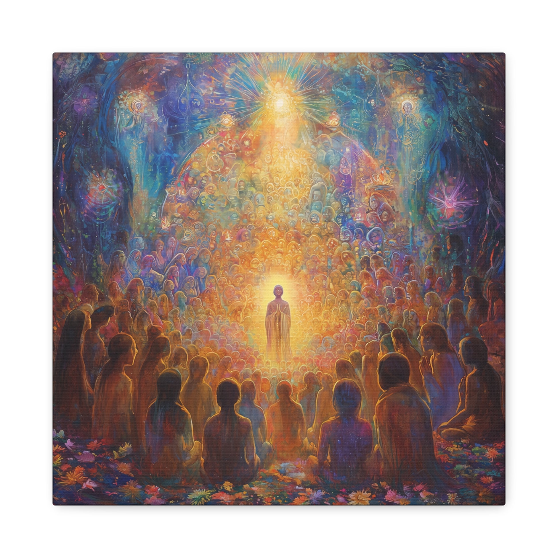 A radiant being stands at the heart of an ethereal congregation, bathed in a luminous glow that speaks of ancient wisdom and unity. The vibrant tapestry of colors weaves a story of harmony and transcendence.