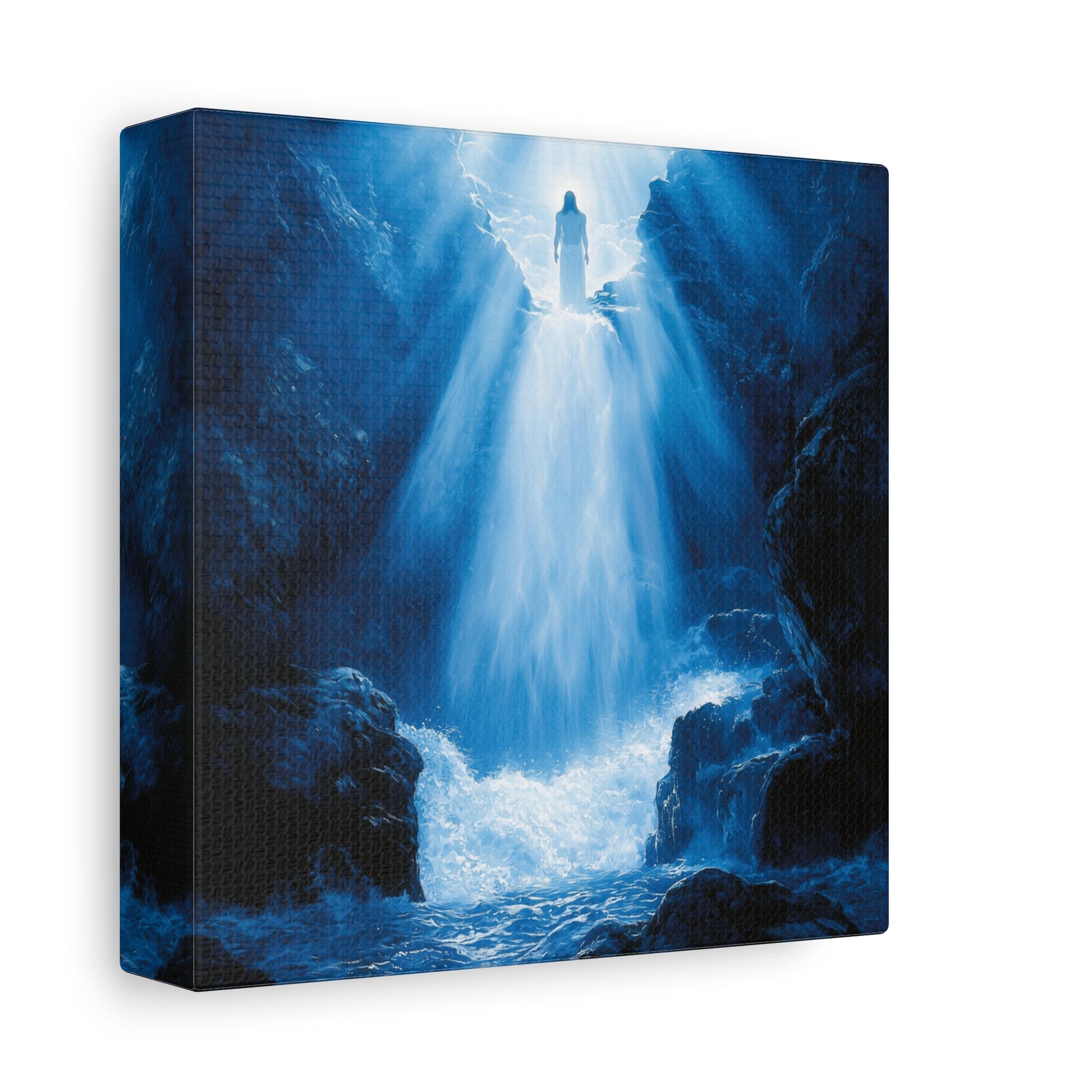 A radiant figure emerges from shadowed depths, bathed in cascading light. The scene evokes a sense of renewal and transcendence, as if the very essence of hope is woven into the shimmering waters and ethereal glow.