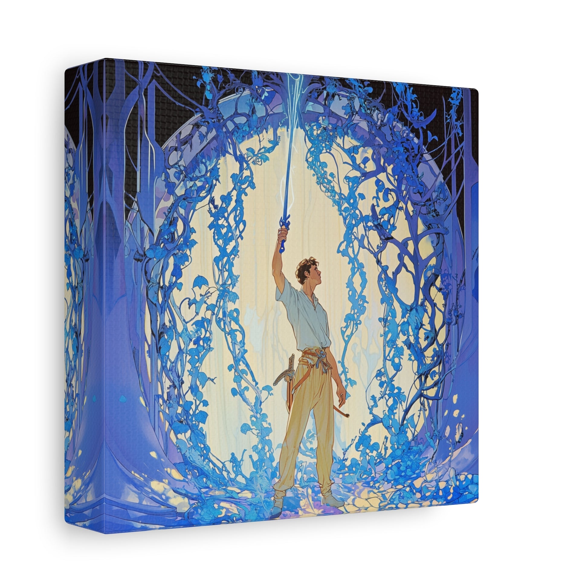 In a realm where light dances with shadow, a figure stands resolute, sword raised to the ethereal sky. Vines of azure weave a portal, whispering secrets of courage and the promise of new beginnings.