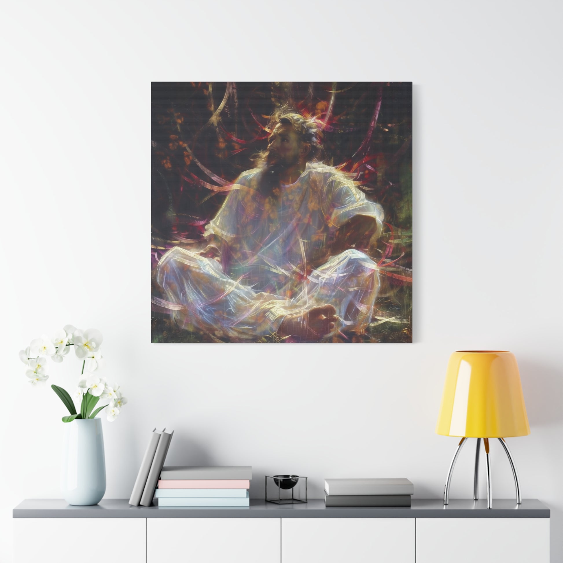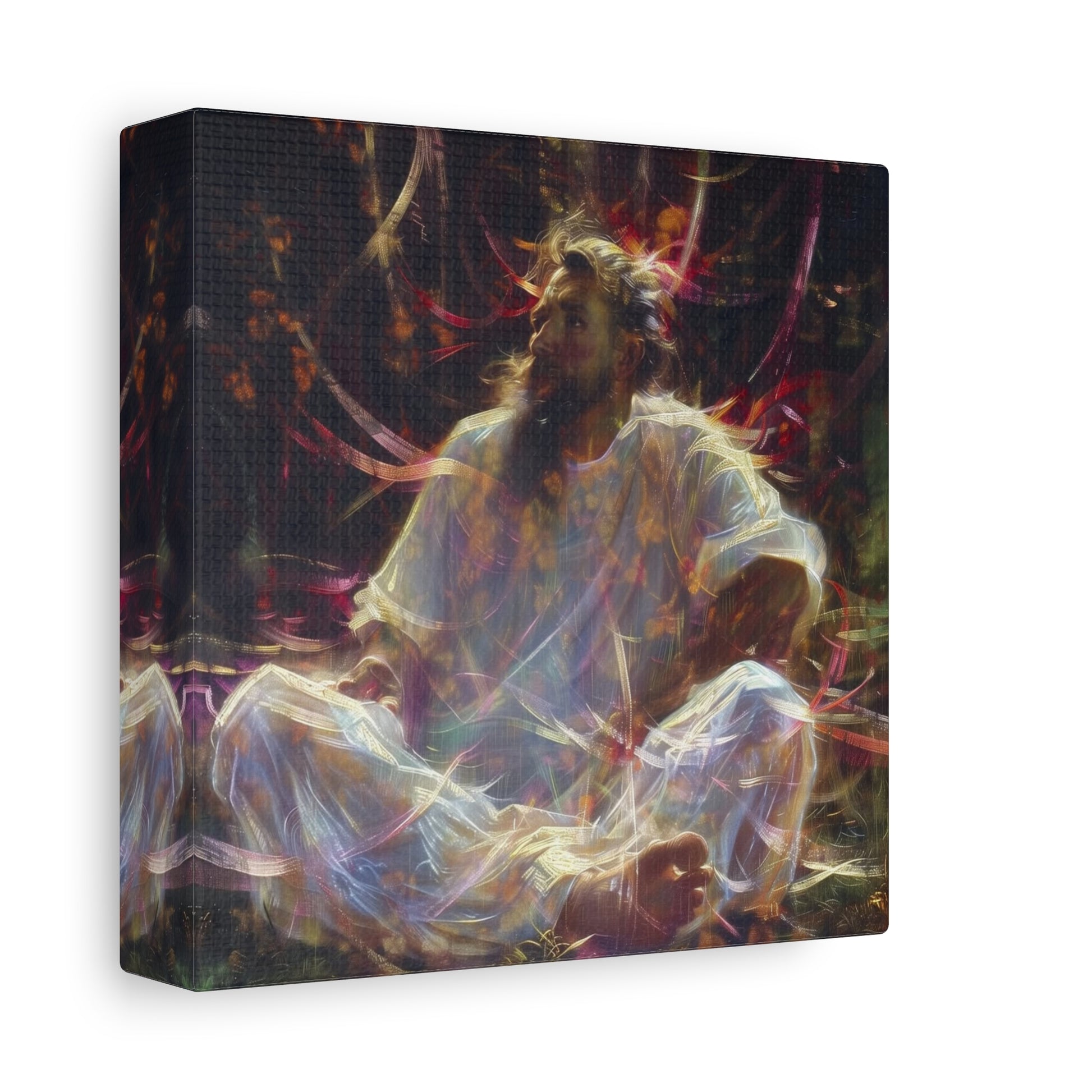 Bathed in ethereal light, a figure sits amidst swirling colors, embodying a serene dance between chaos and calm. The luminous tendrils evoke a timeless journey, inviting introspection and peace within the vibrant tapestry of existence.