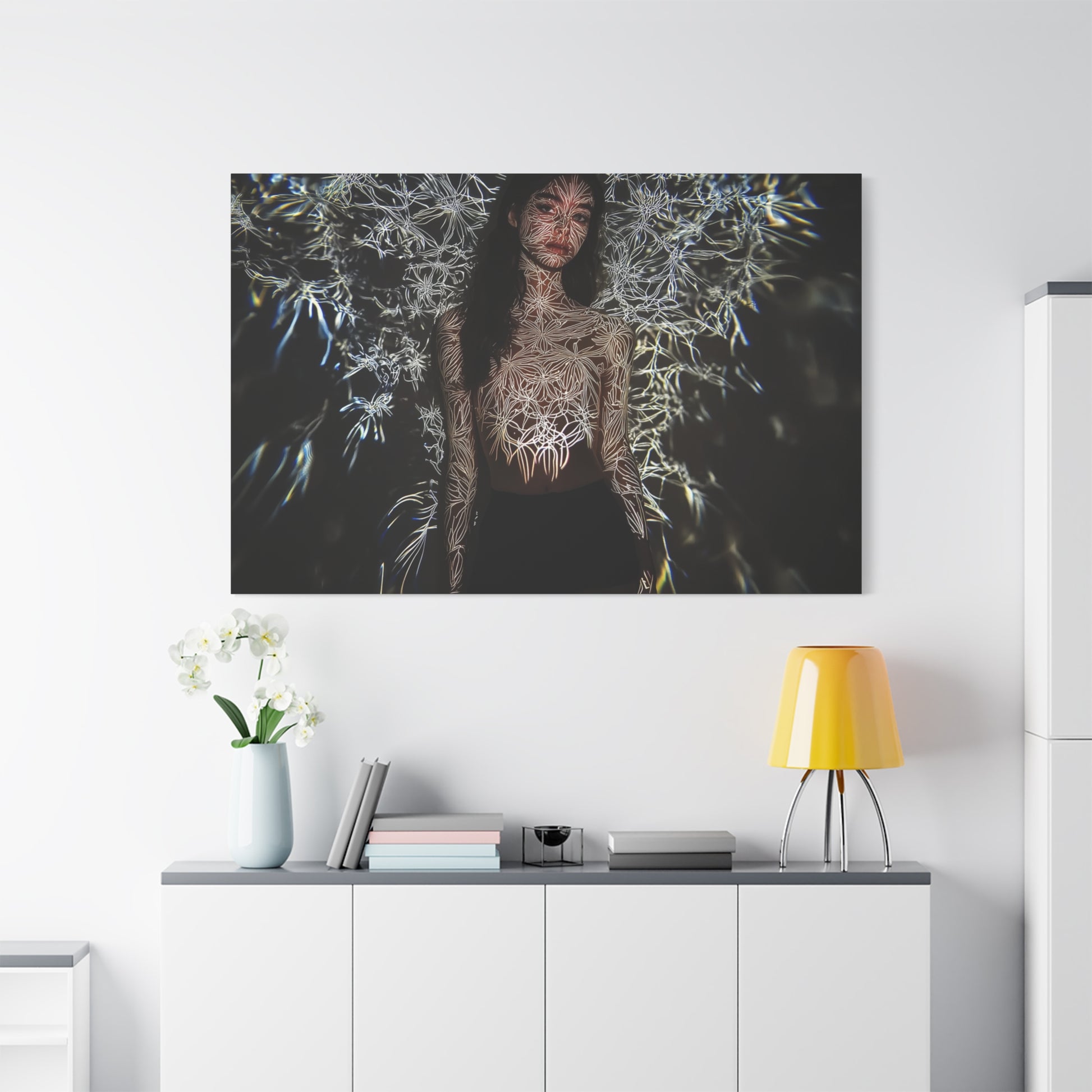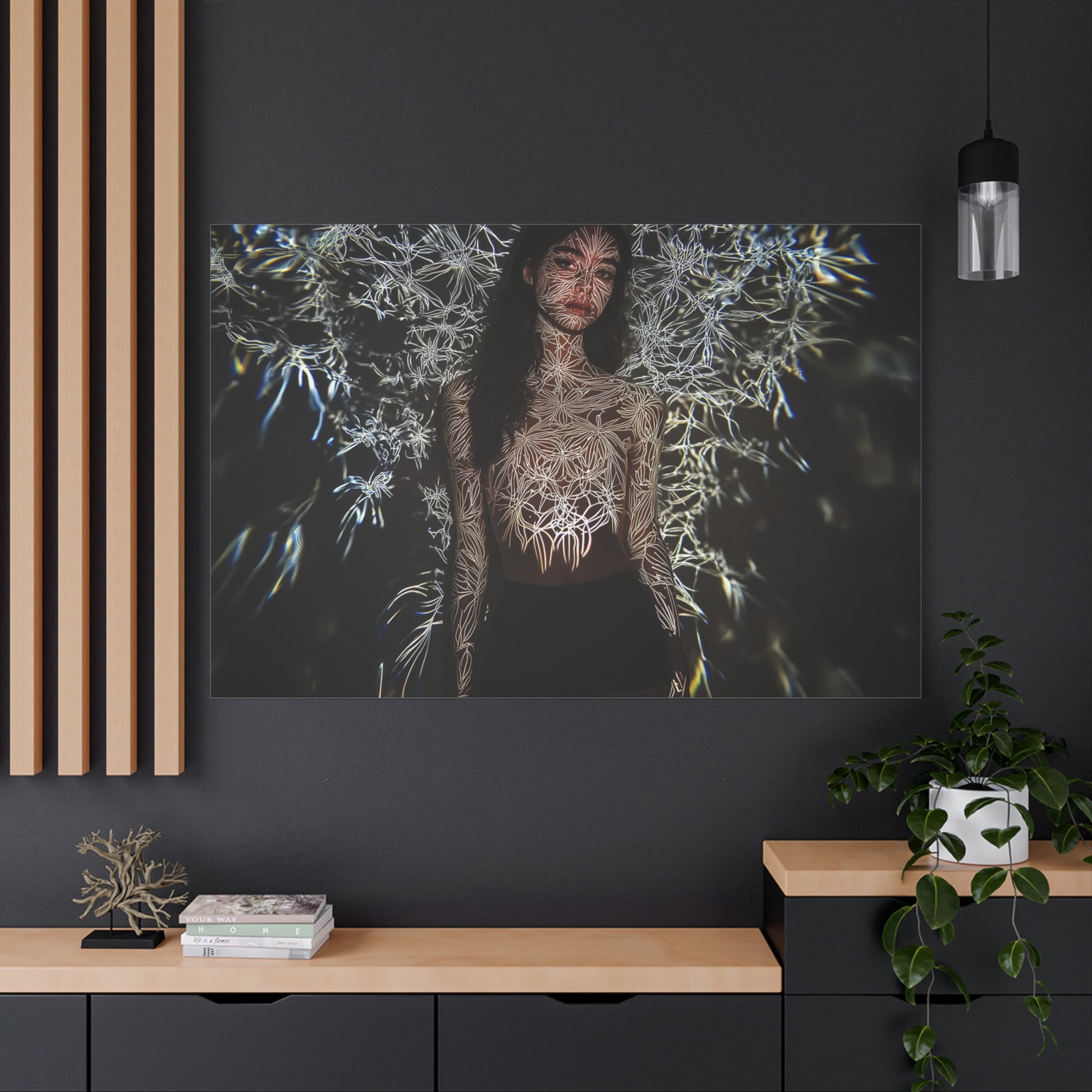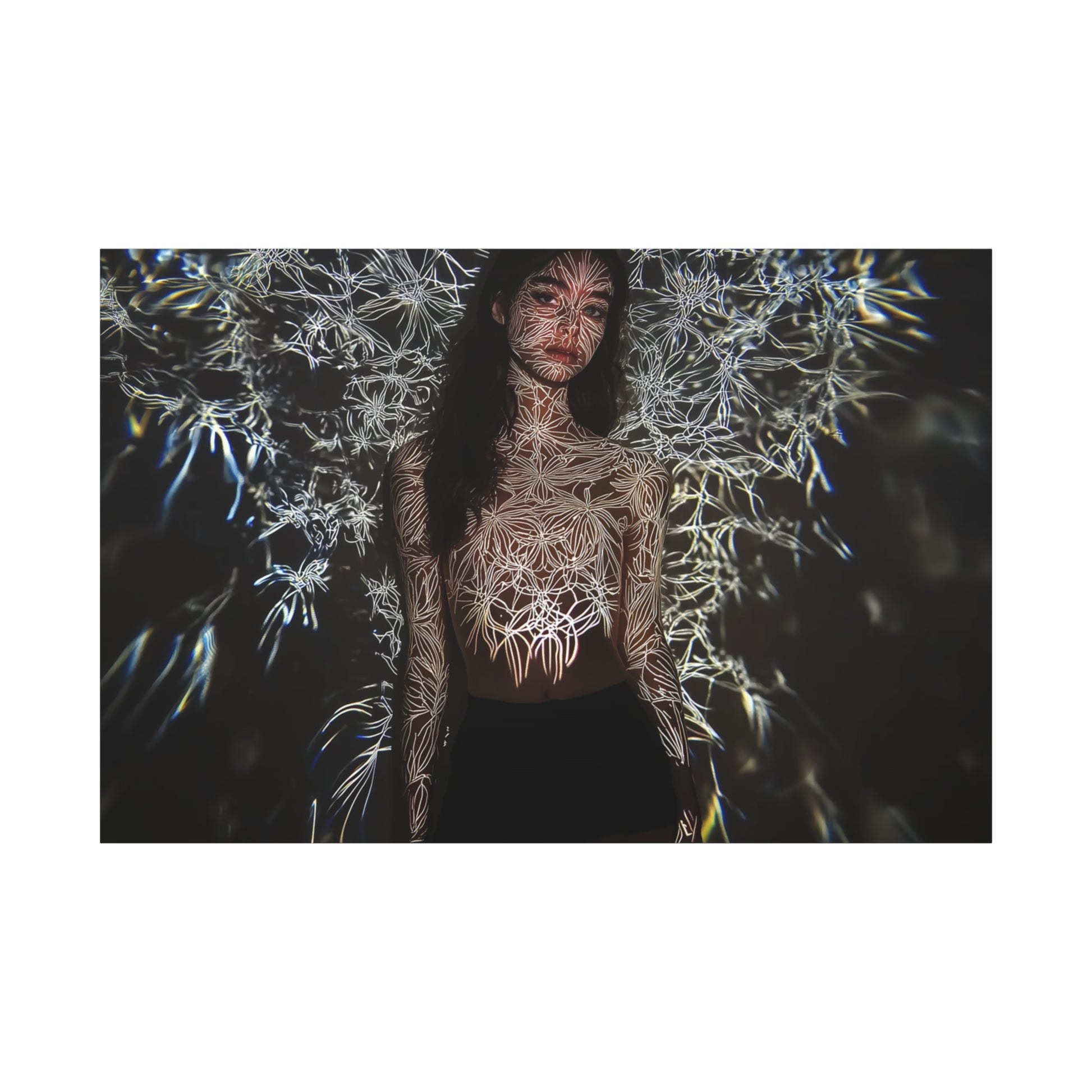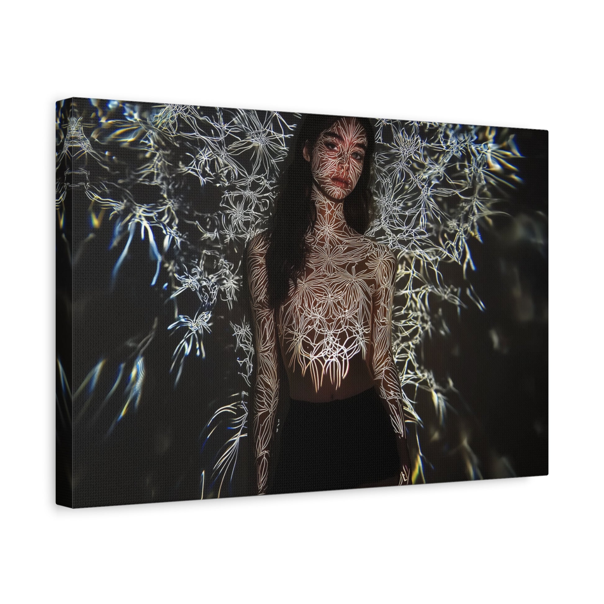 In a realm where light dances upon flesh, intricate patterns weave stories of ethereal beauty. The interplay of shadow and illumination unveils a mysterious tapestry, inviting the viewer into a world of delicate harmony and hidden narratives.