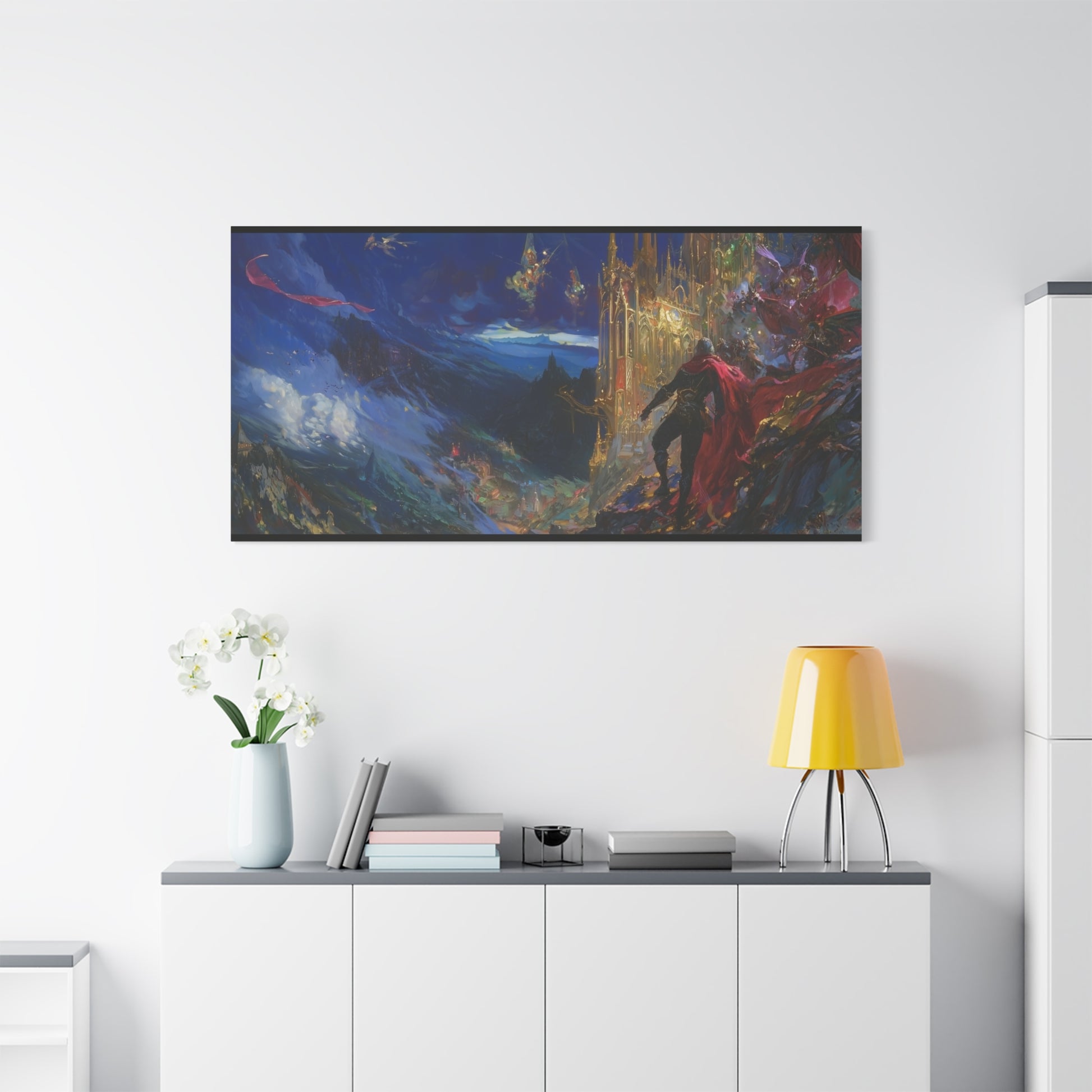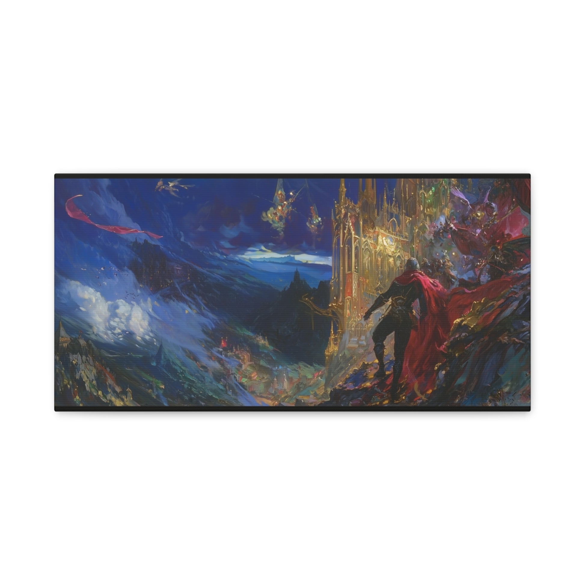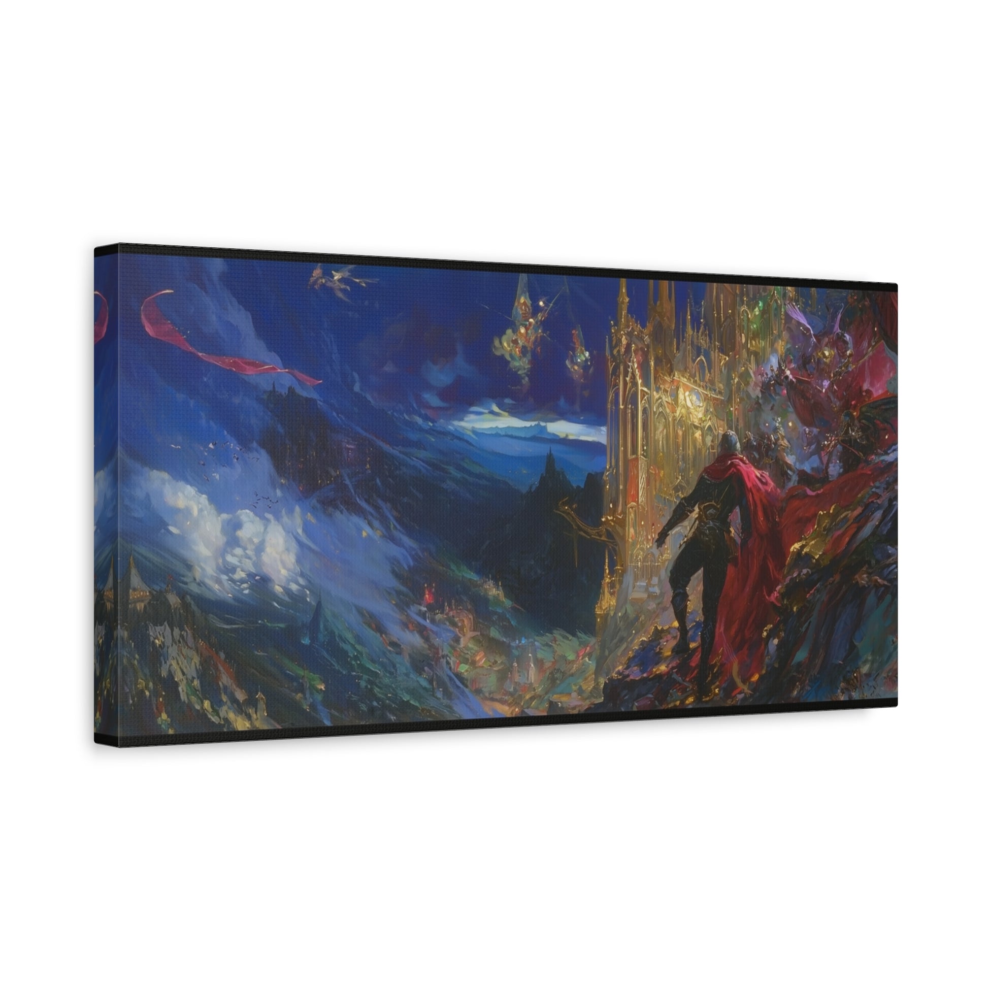 A cascade of colors spills across the canvas, where a lone figure ascends toward a golden citadel, its spires piercing the twilight. The journey unfolds in a realm between dreams and waking, where courage meets the unknown.