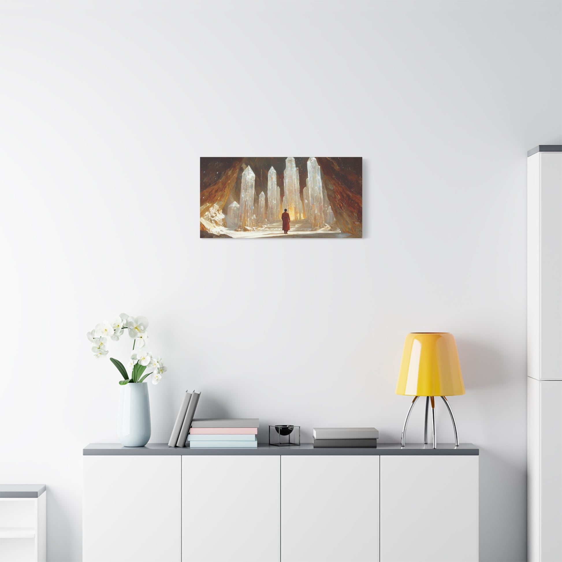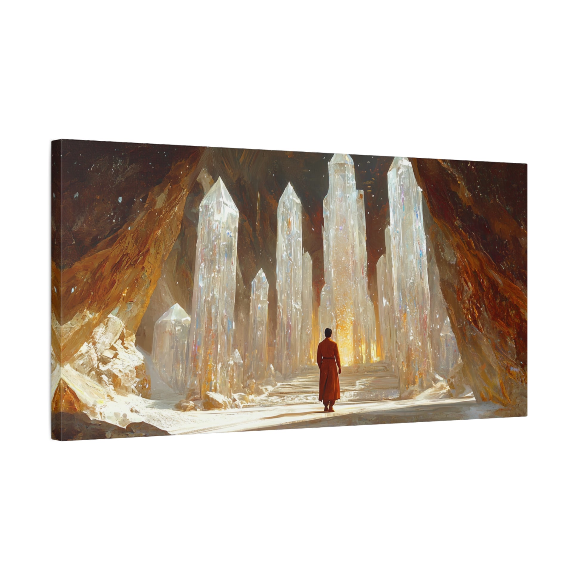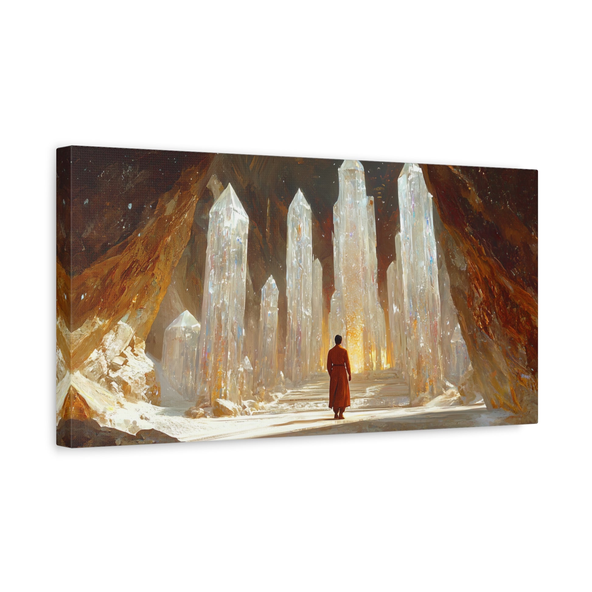 A lone figure stands in awe, surrounded by towering crystals that shimmer with ancient secrets. Light dances through the translucent forms, illuminating a path of discovery and wonder. The air hums with possibility and reverence.