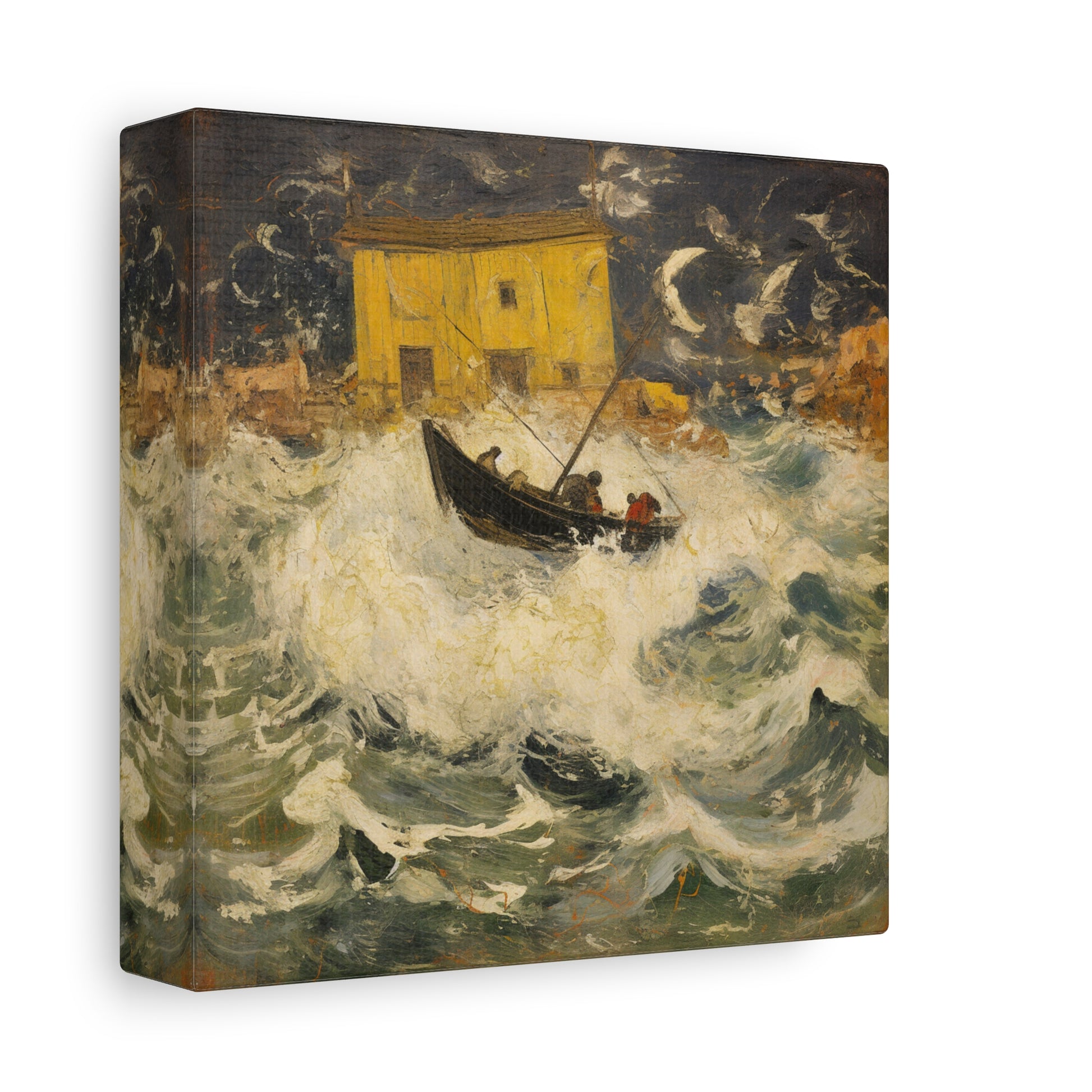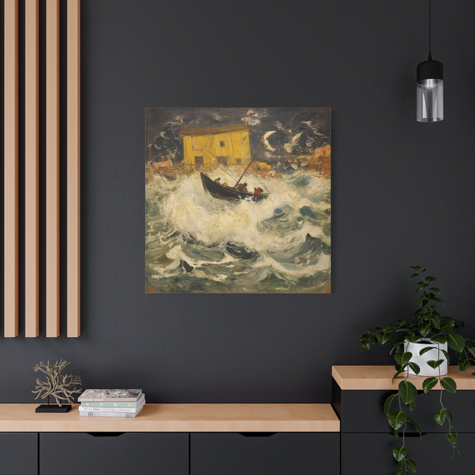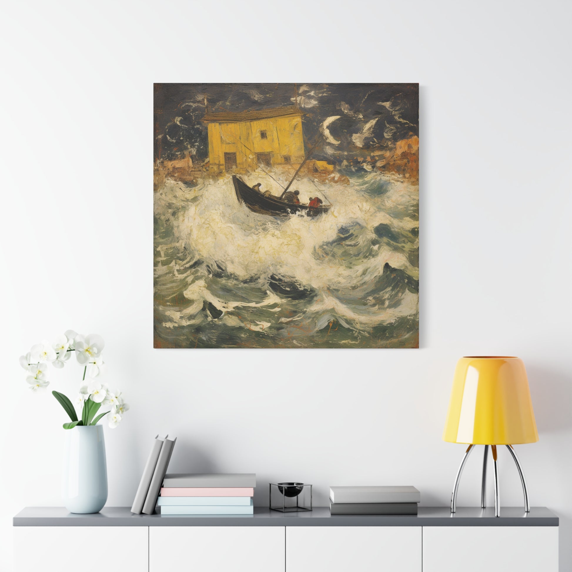 Amidst the roaring tempest, a lone vessel dances with the sea's wild embrace. The yellow house stands defiantly, a beacon of resilience against nature's untamed ferocity. Together, they paint a tale of courage and chaos.