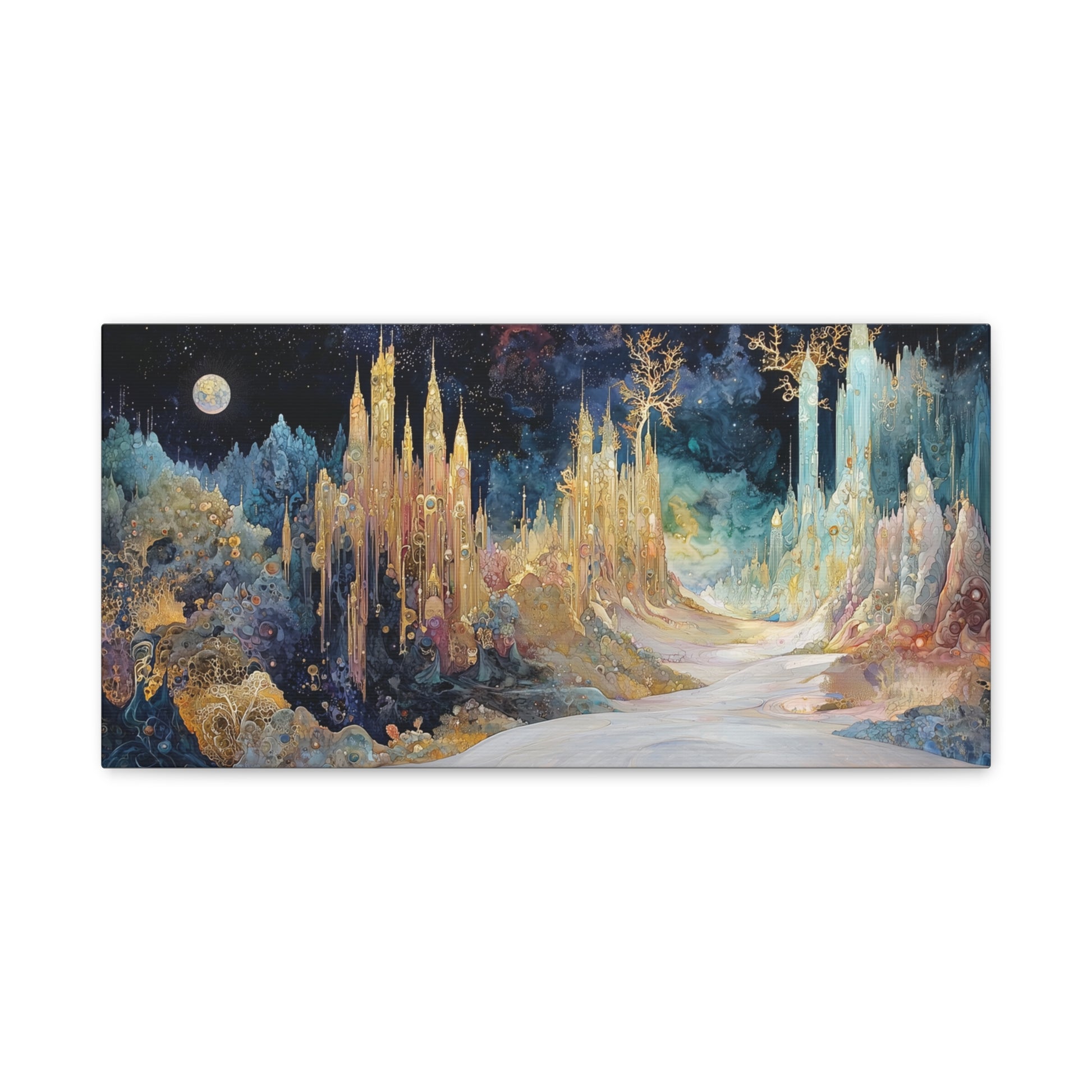 Beneath the watchful gaze of a luminescent moon, ethereal towers rise, woven from dreams and stardust. The landscape whispers ancient secrets, inviting the soul to wander through shadows and light. A journey of cosmic wonder awaits.