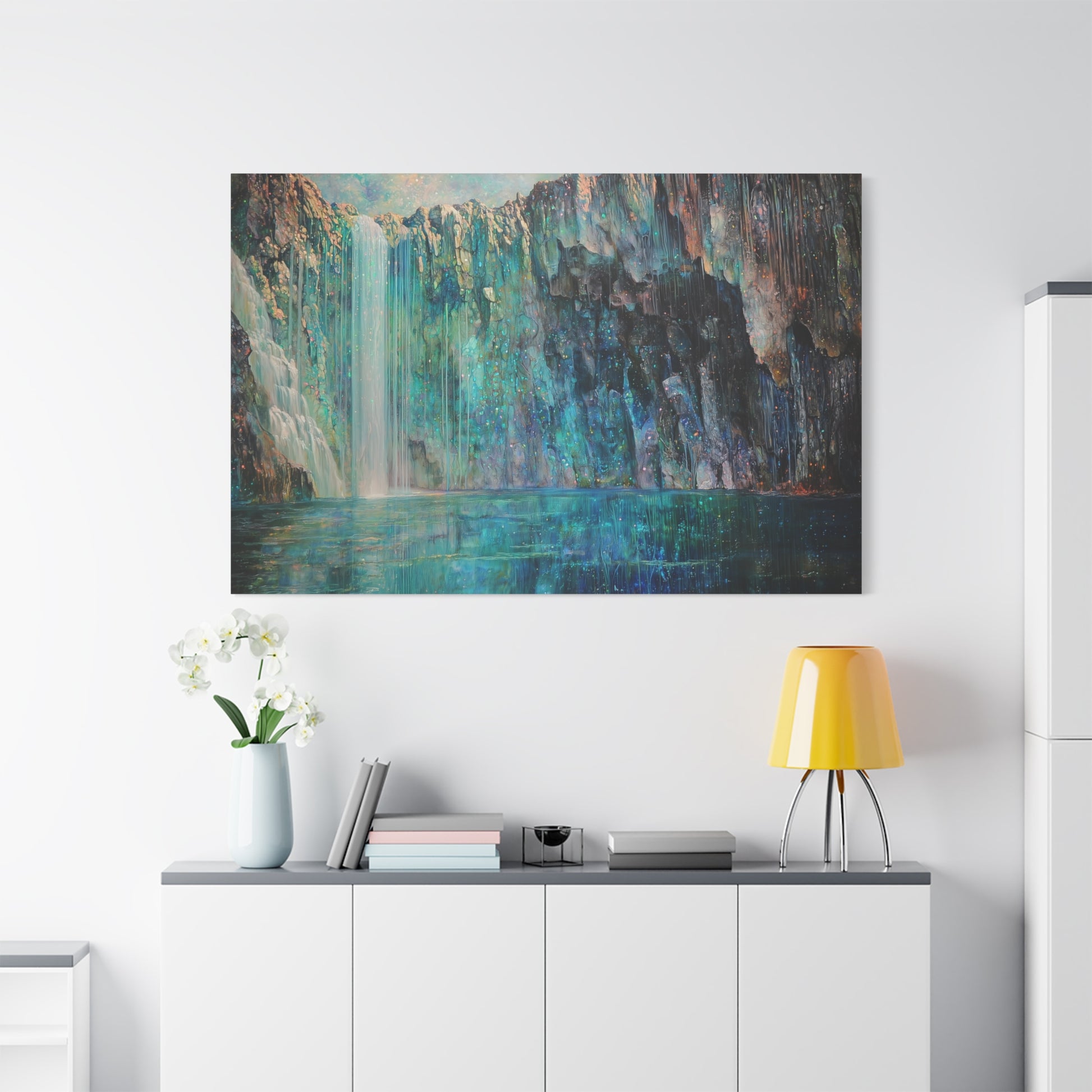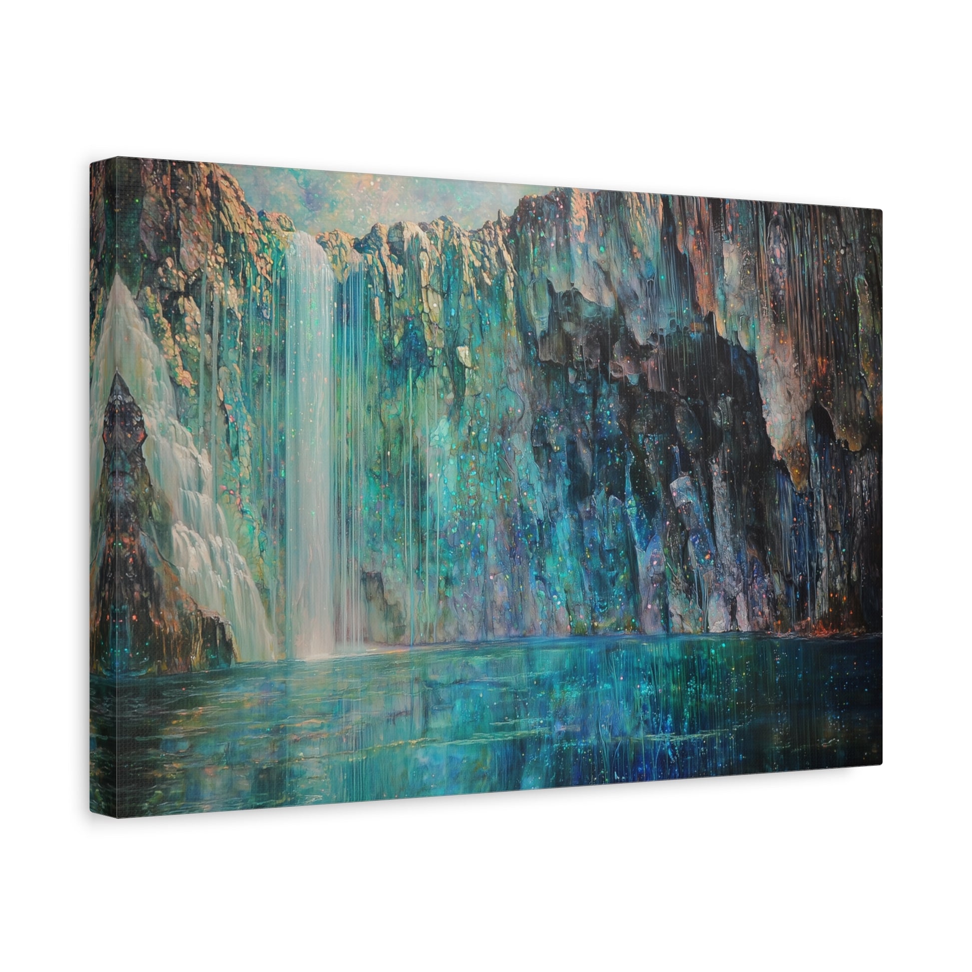 Shimmering cascades of light and water merge into a dreamscape, where the ethereal and the earthly entwine. The waterfall sings an ancient lullaby, inviting wanderers to lose themselves in its enchanting depths.