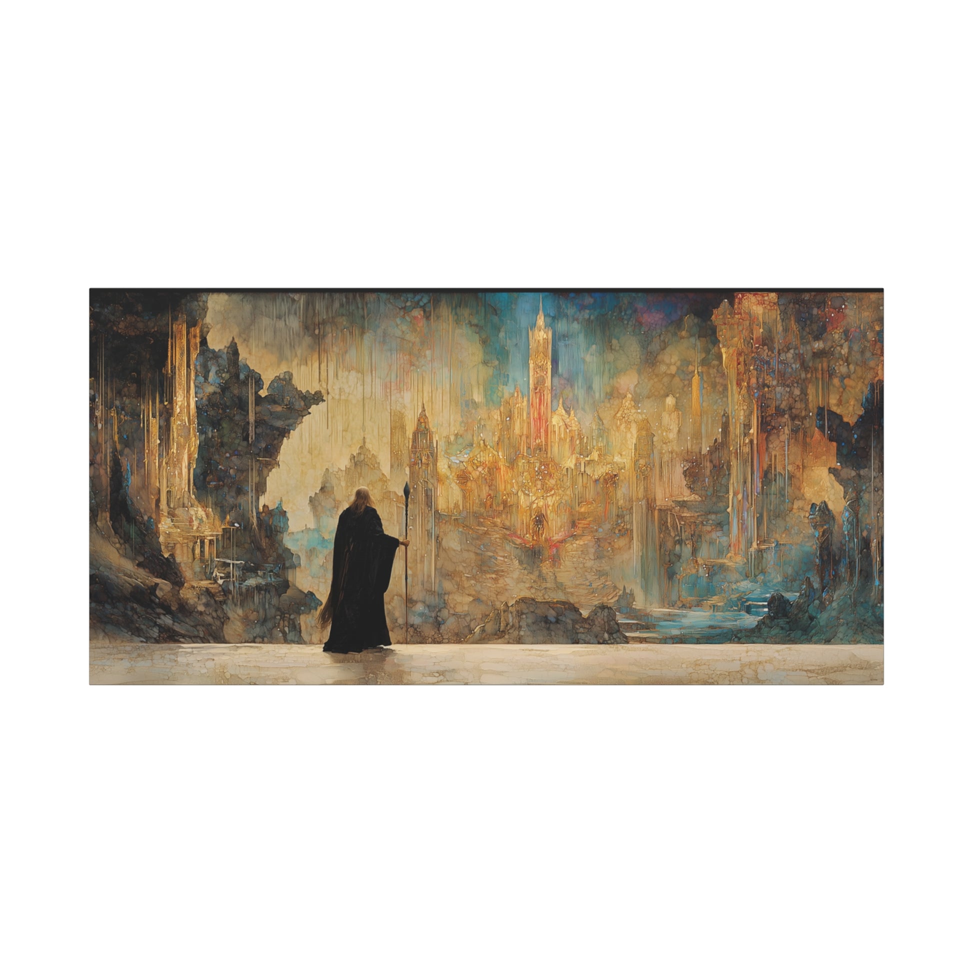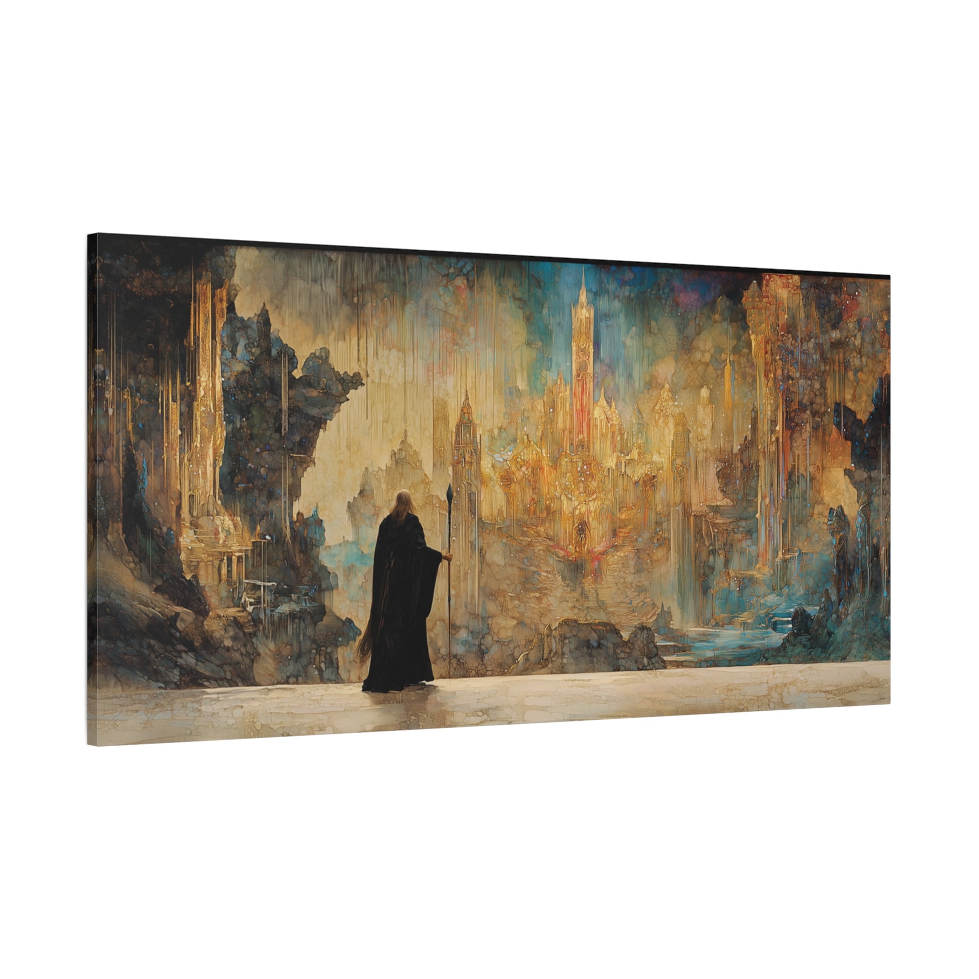 A lone figure gazes upon a radiant city bathed in golden hues, suspended between reality and dreams. The shimmering spires whisper of forgotten tales and hidden paths, inviting the soul to wander amidst the echoes of ancient glory.