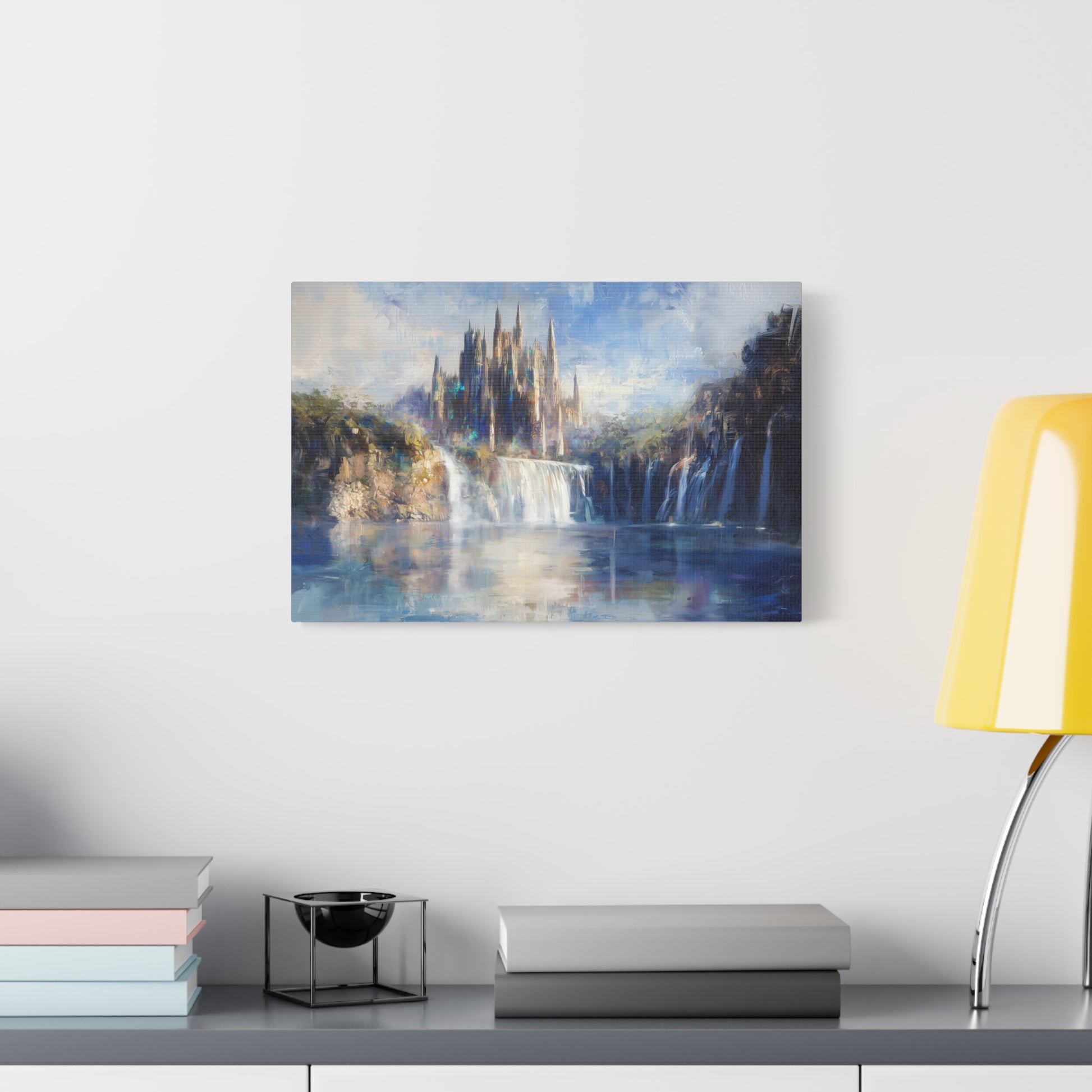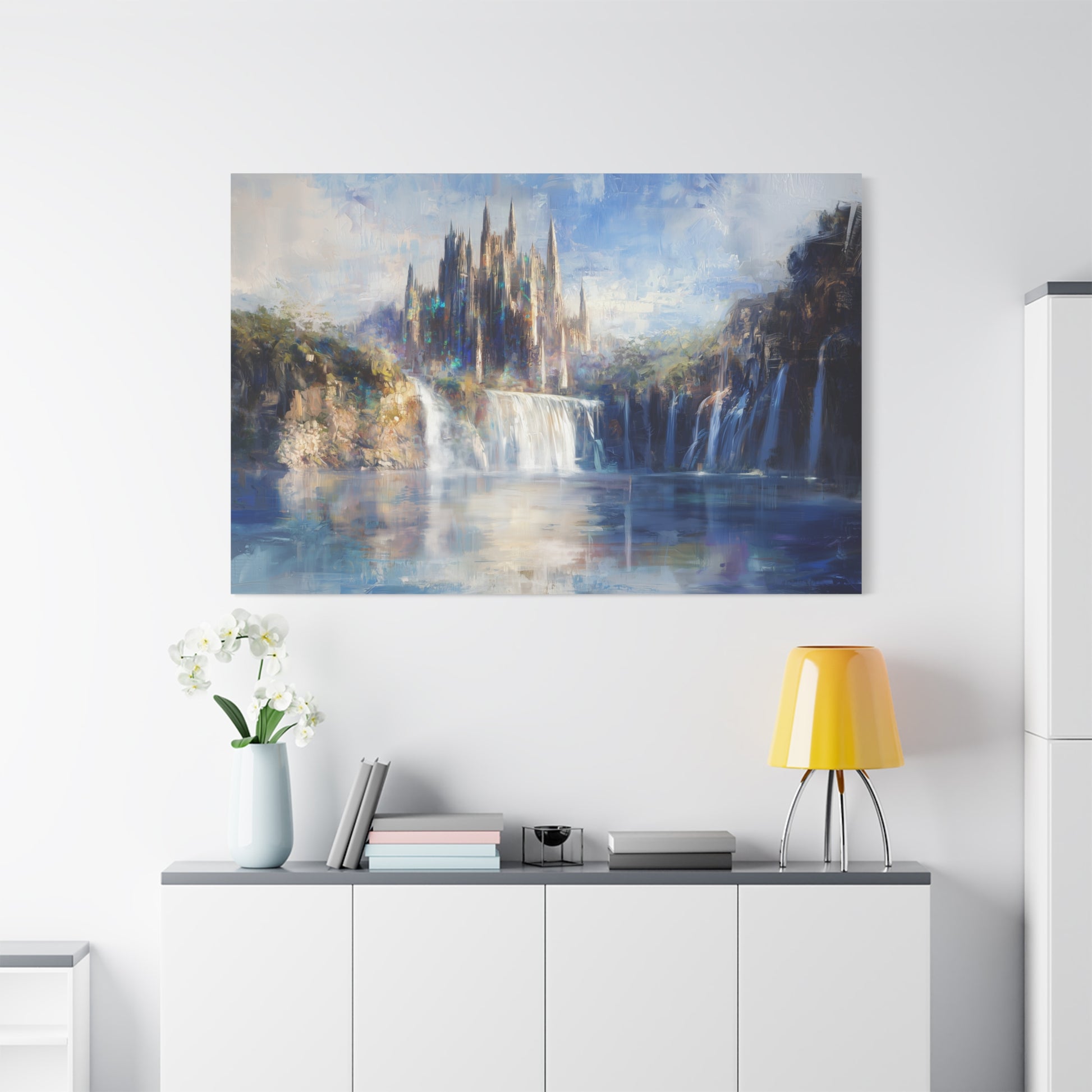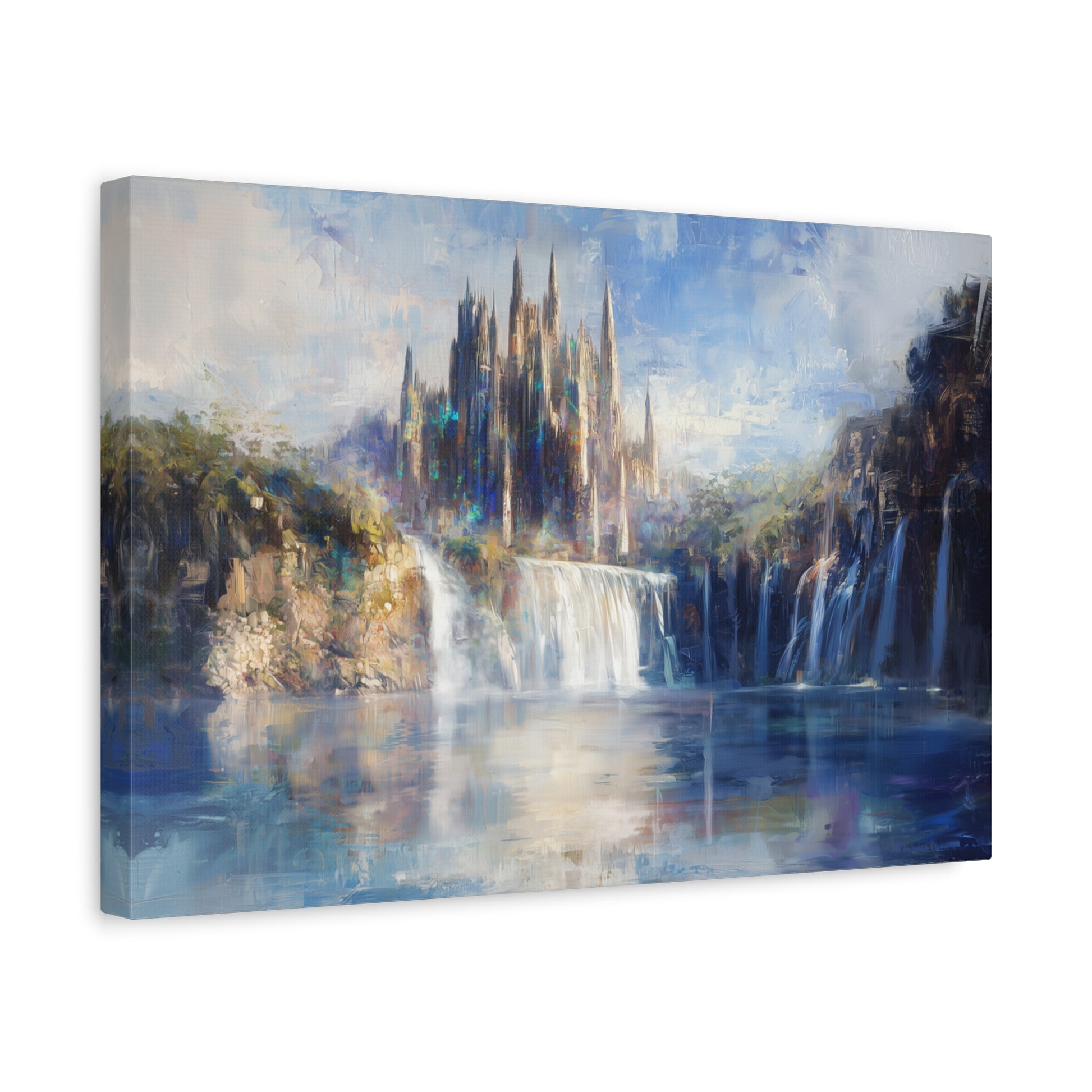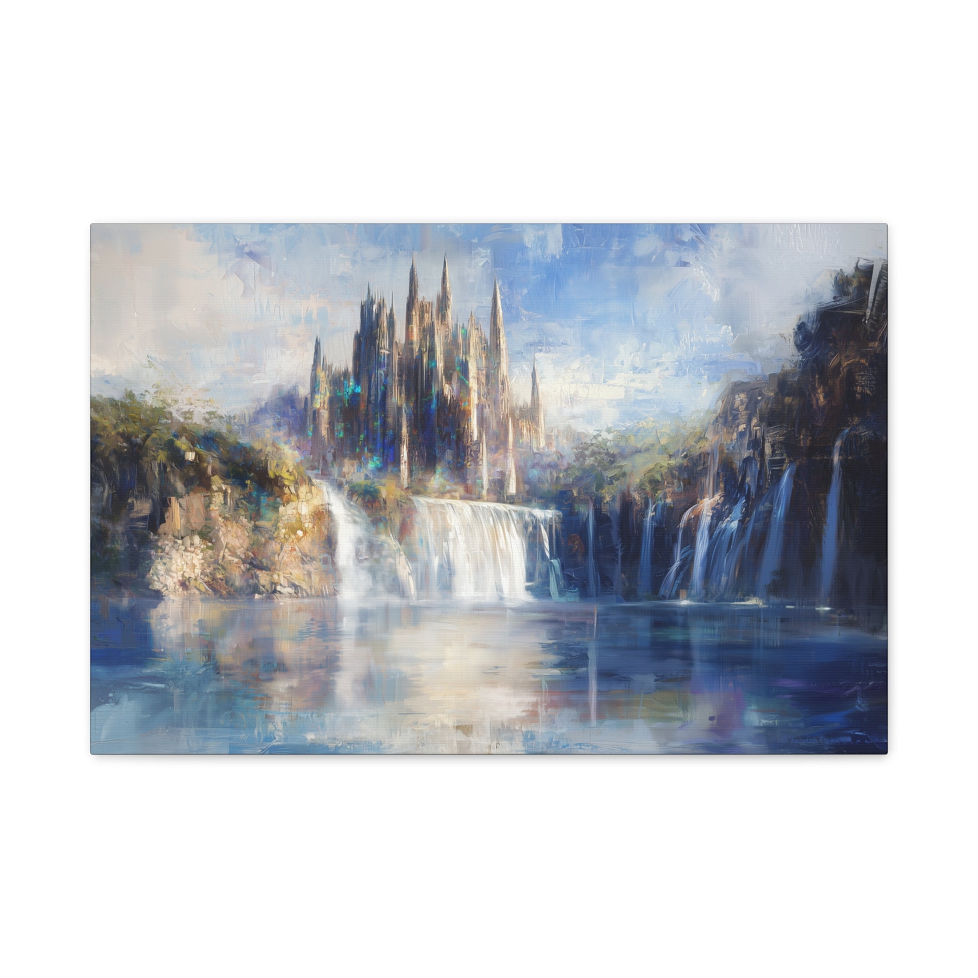A shimmering fortress emerges from cascading waterfalls, a vision of ethereal beauty where nature and architecture dance. Light refracts in hues of azure and gold, inviting a journey into the heart of legend.