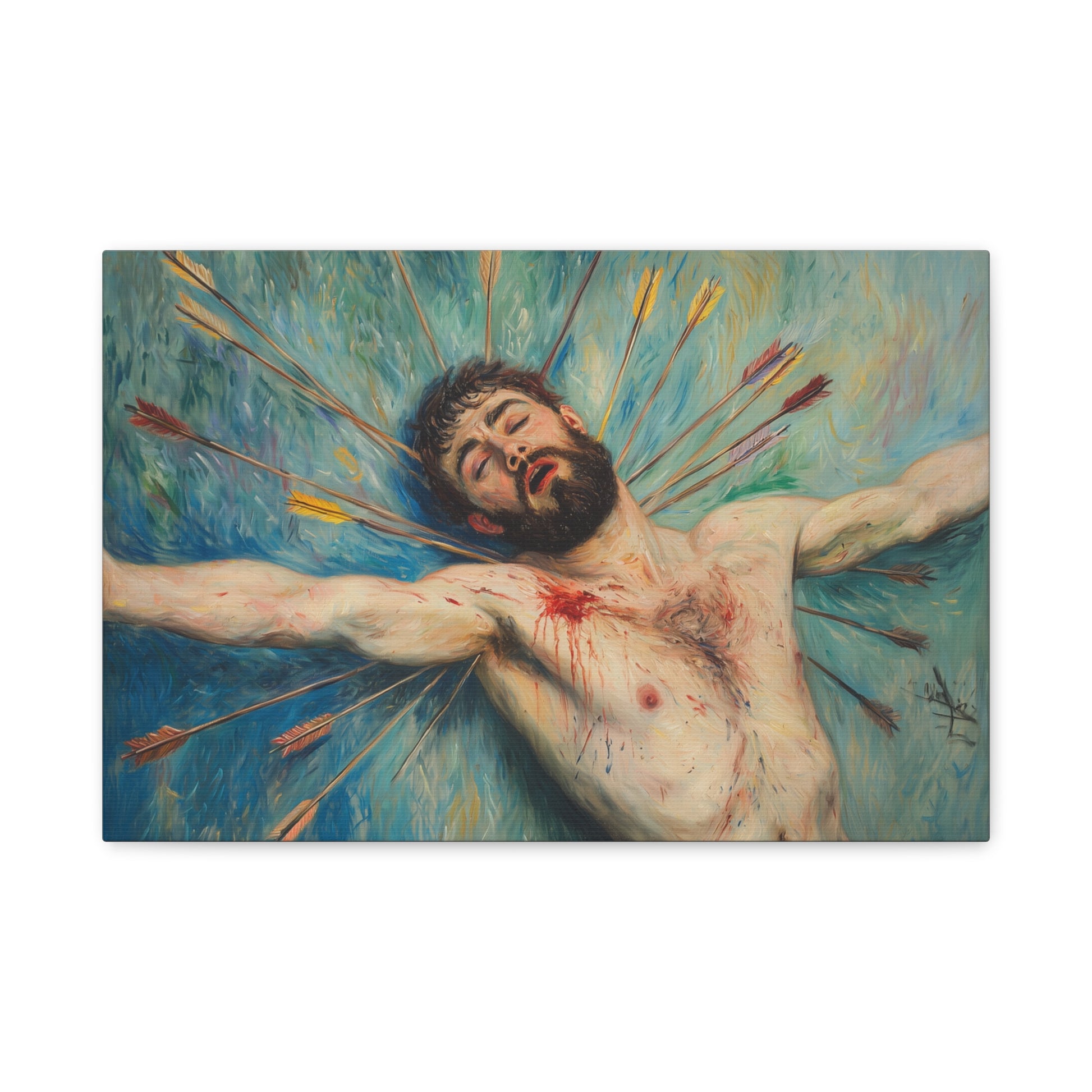 In a dance of agony and grace, the figure is both wounded and transcendent. Arrows pierce the physical, yet the spirit seems to soar, whispering of sacrifice and a quiet strength beyond pain.