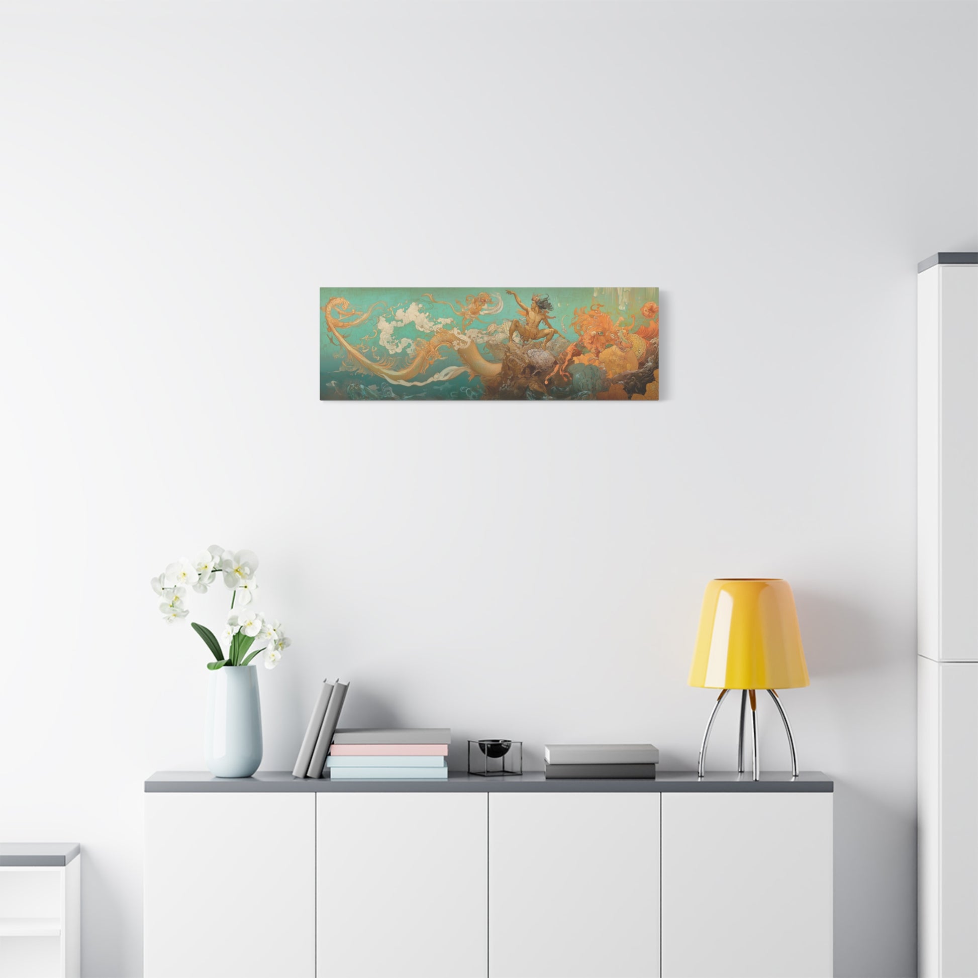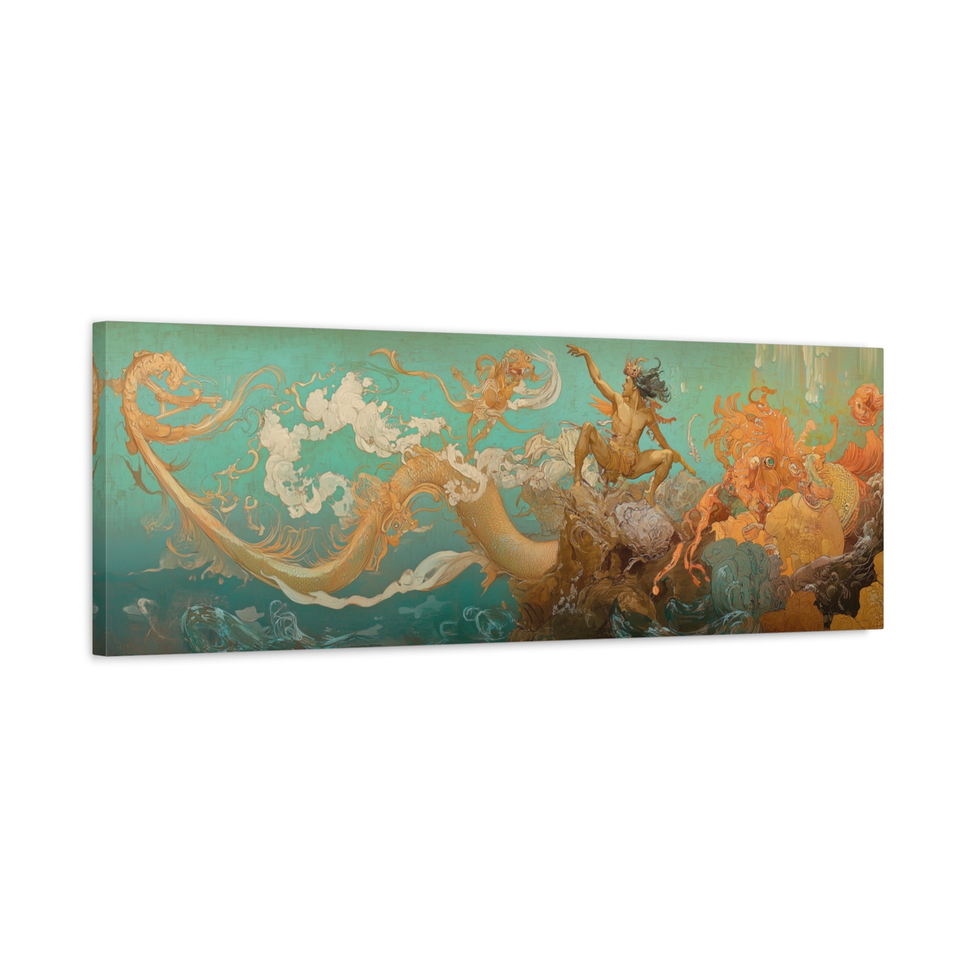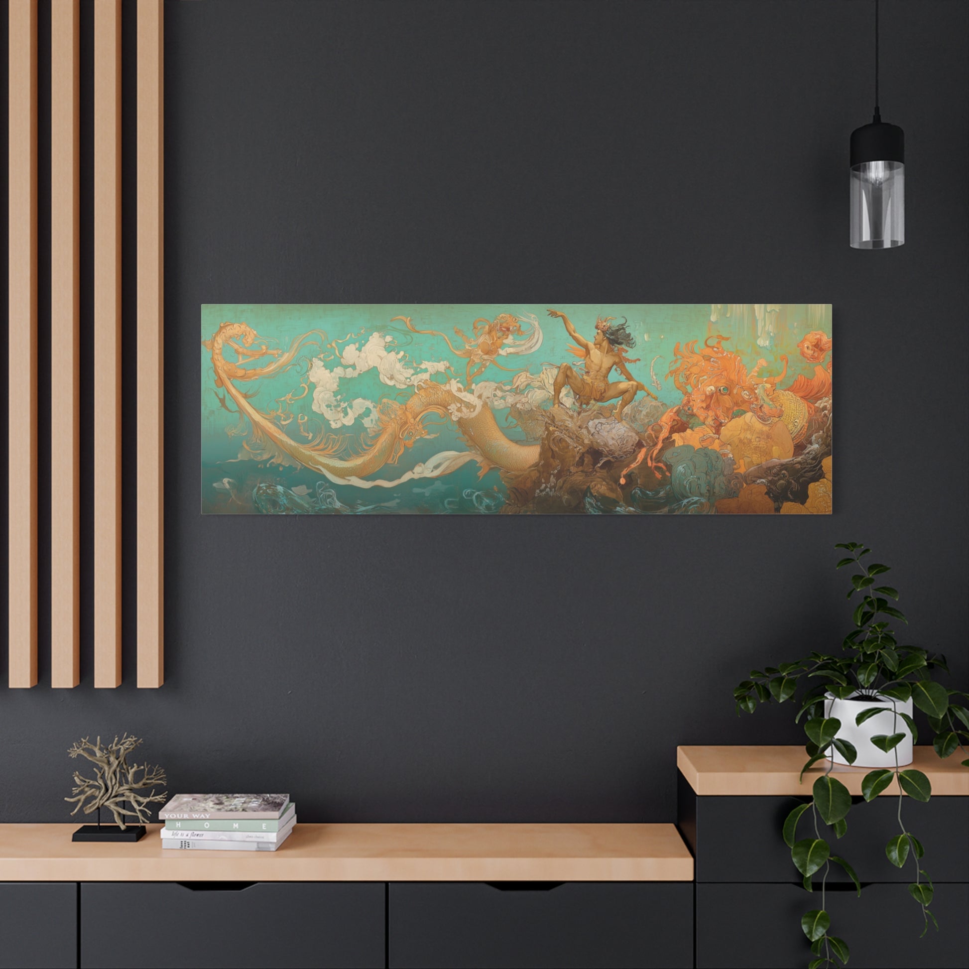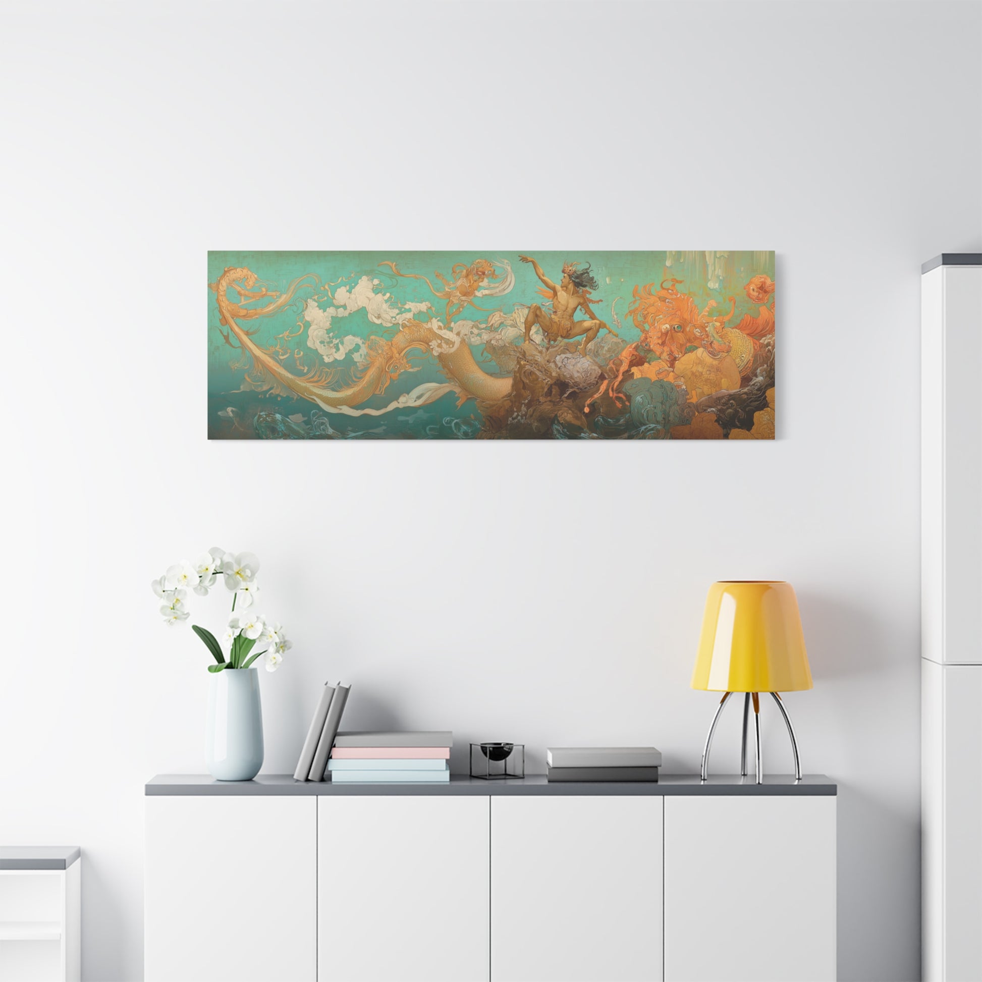 In a swirling dance of mythical creatures and vibrant waters, the boundaries between reality and dream dissolve. This ethereal tableau invites the viewer to dive into a realm where legends breathe and waves sing ancient songs.