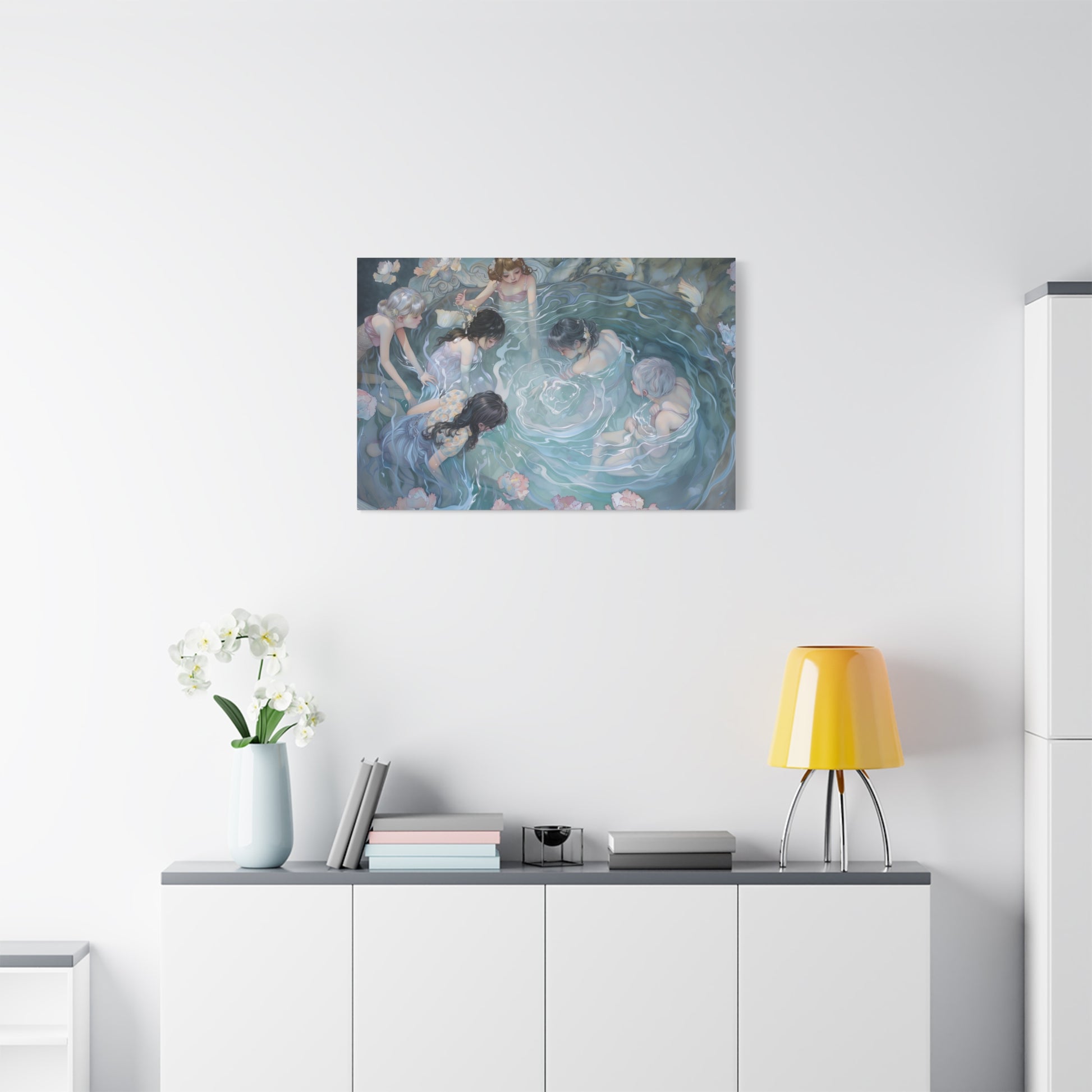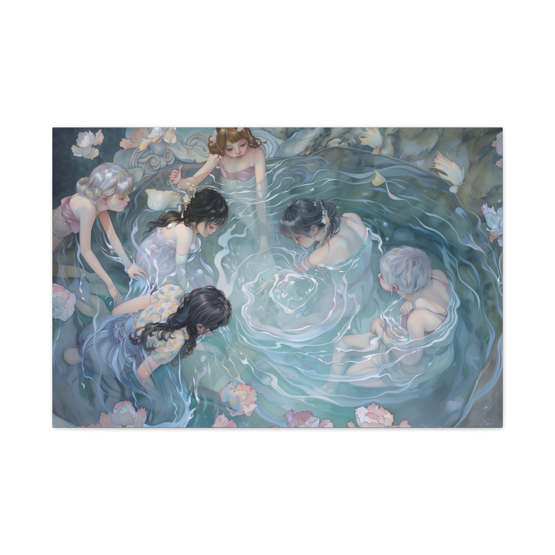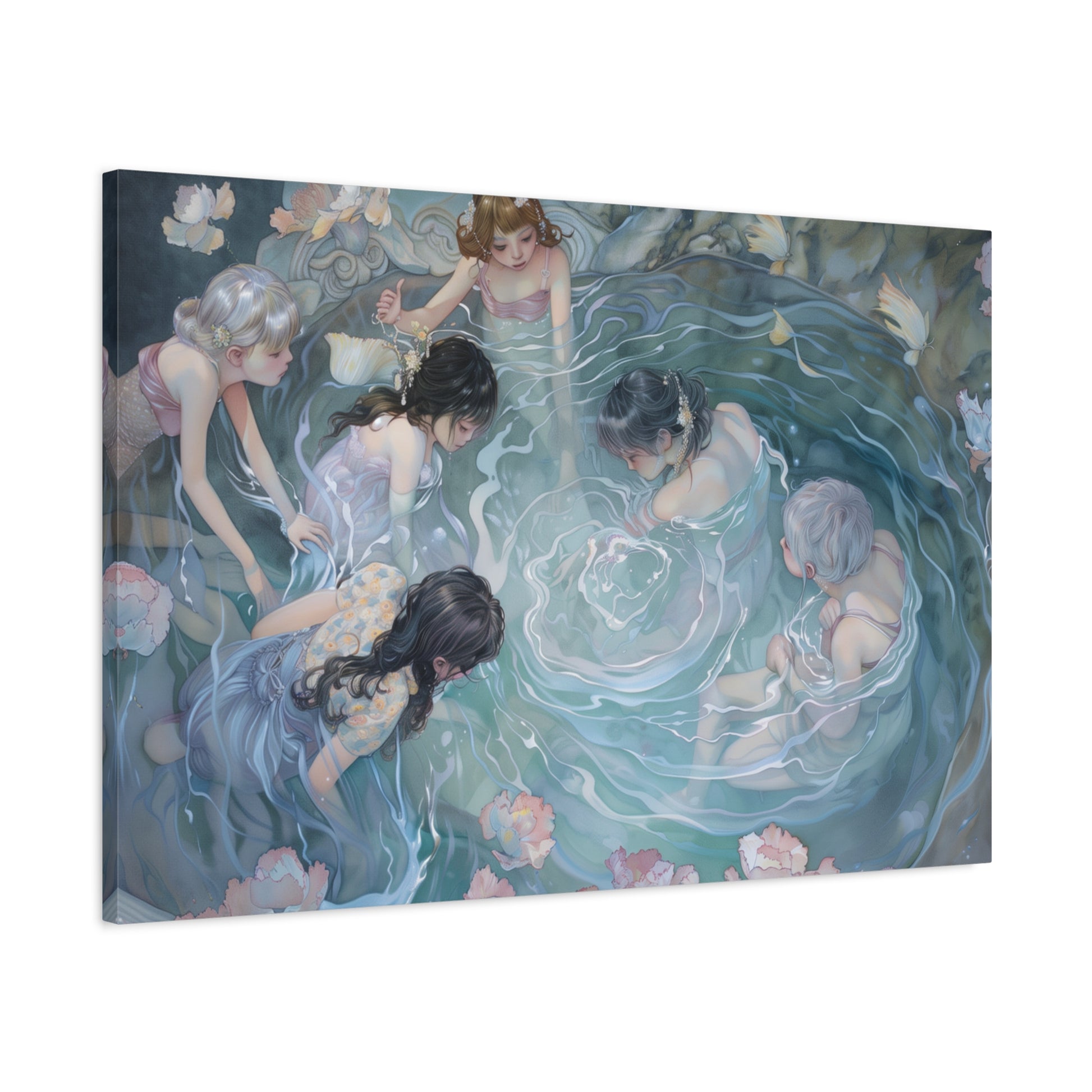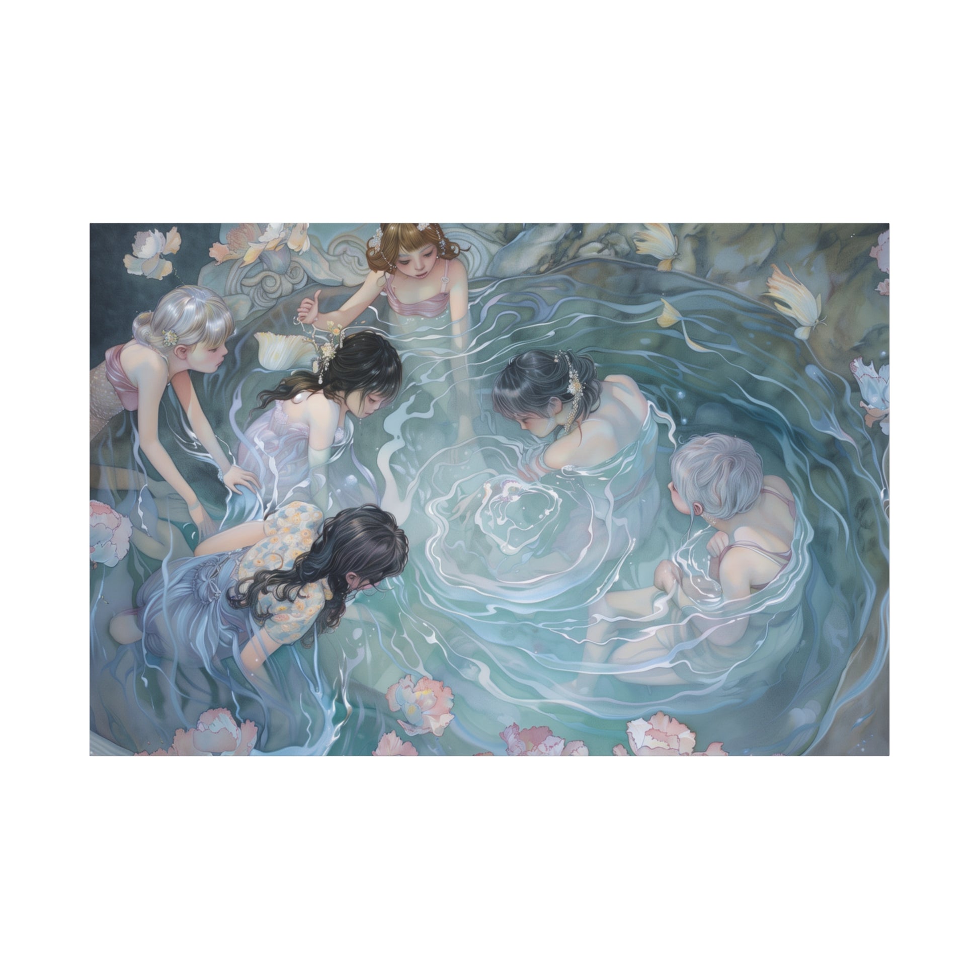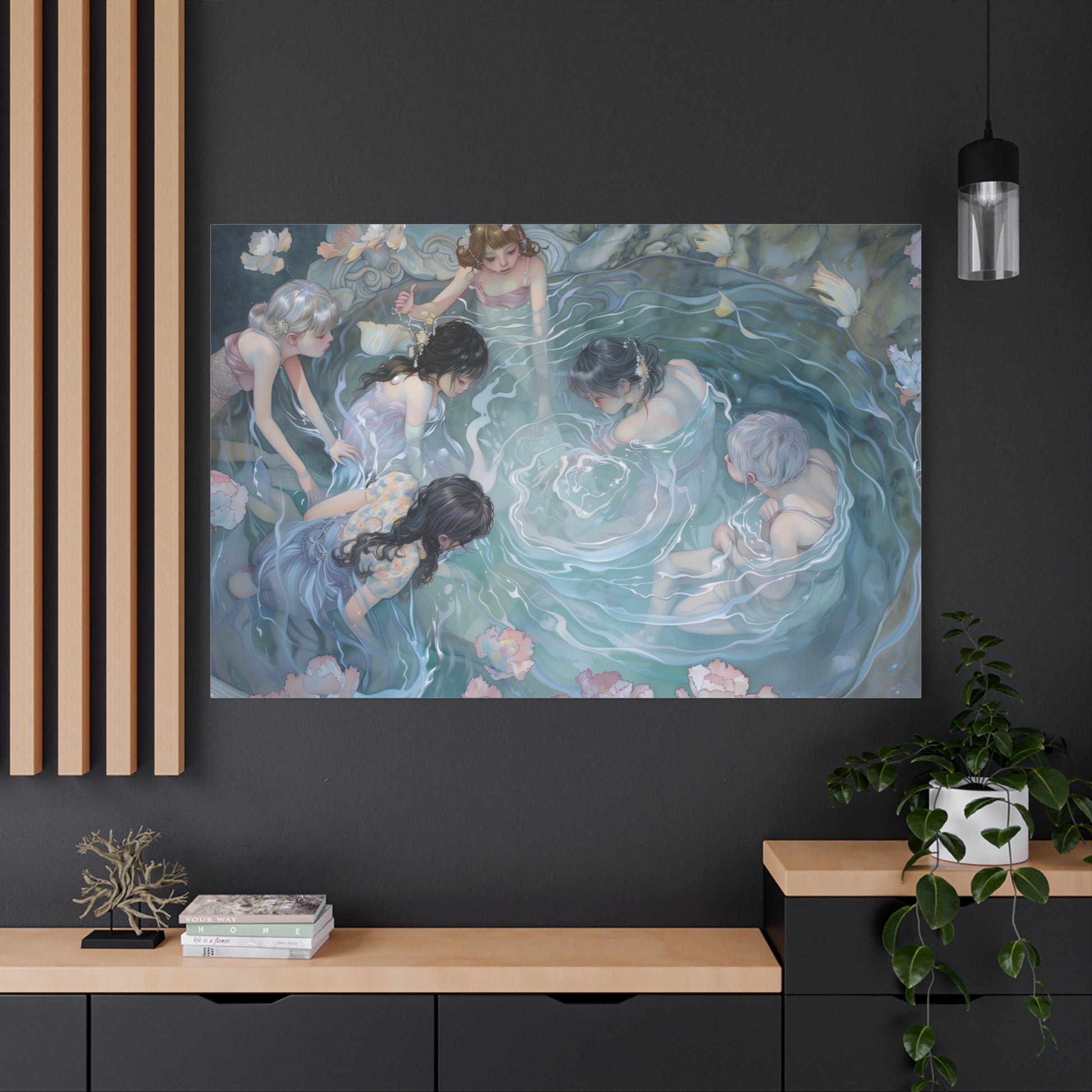 Gentle ripples weave stories untold, as figures hover in a tranquil embrace. A dance of light and shadow whispers secrets across the water's surface, inviting quiet reflection and shared dreams in a serene, mystical gathering.