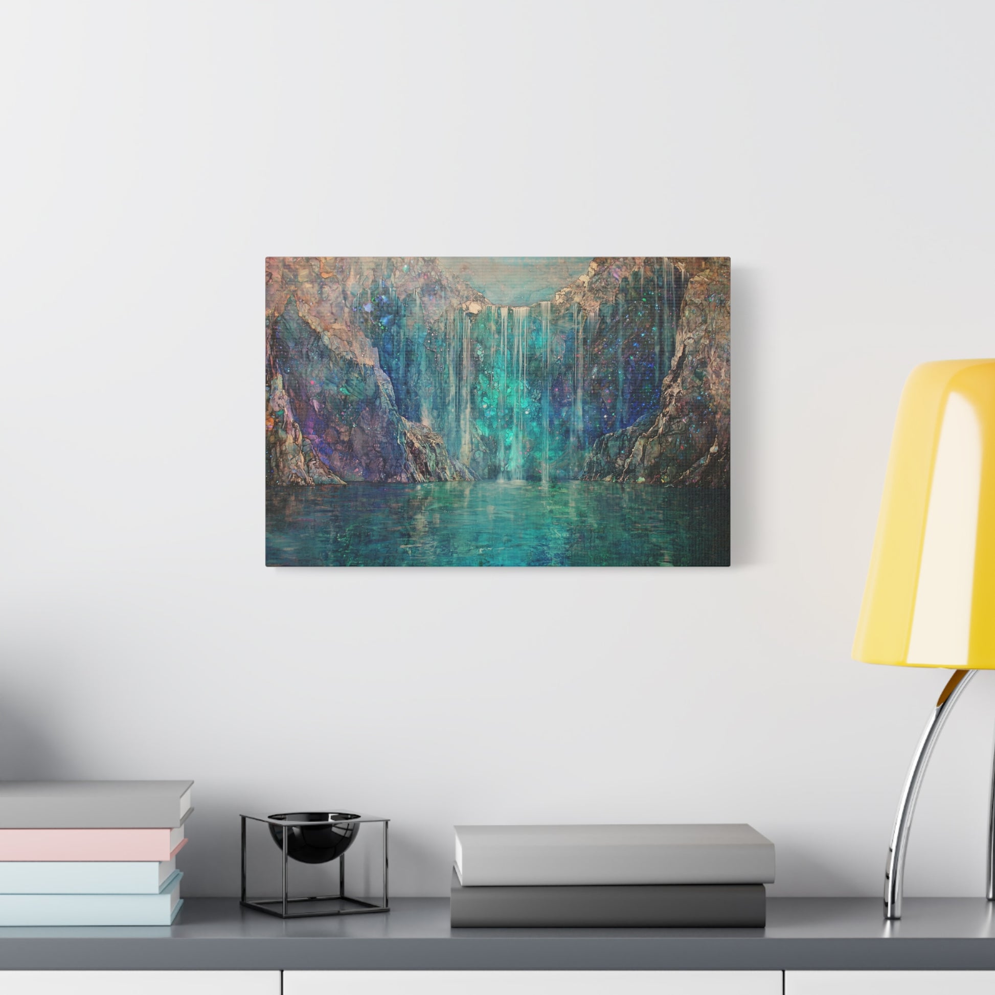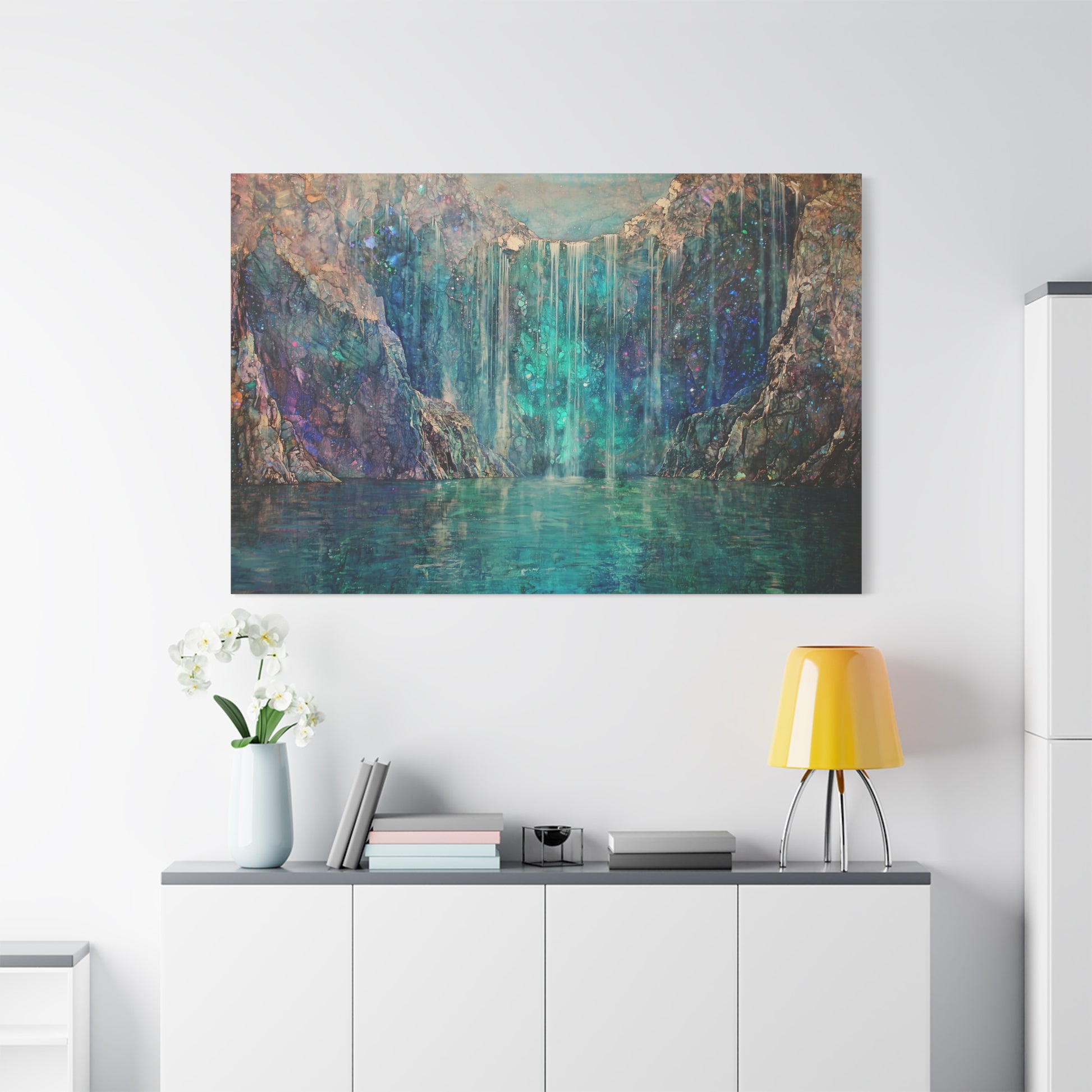 A mystical cascade tumbles into an emerald pool, where dreams and reality entwine in a dance of color and light. This serene sanctuary whispers secrets of ancient realms, inviting introspection and wonder.